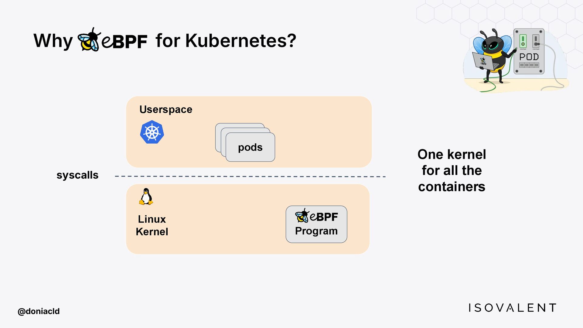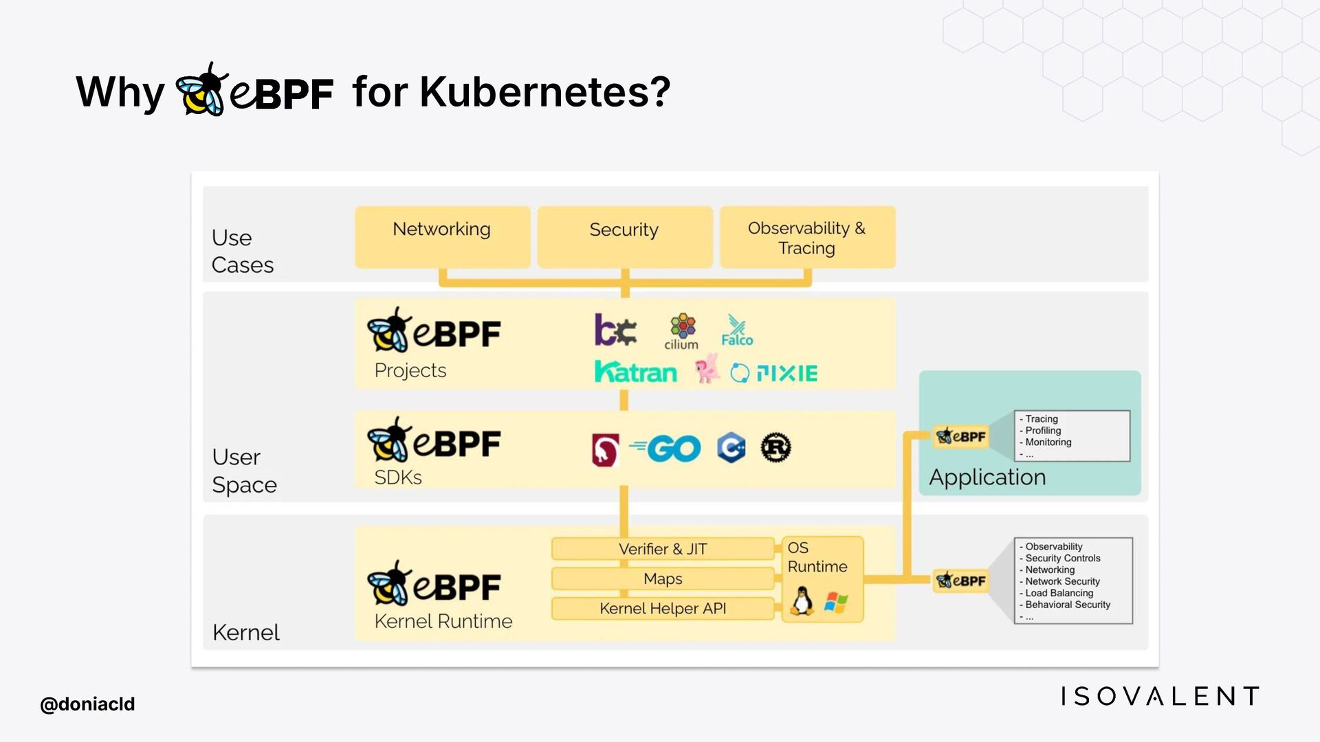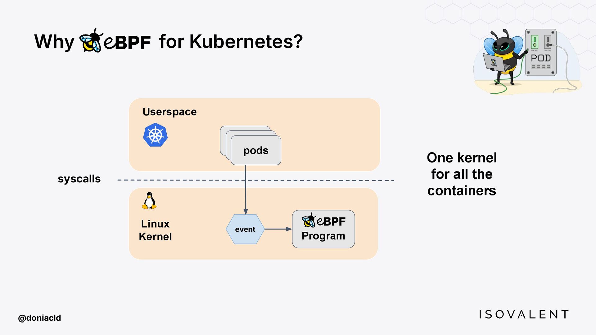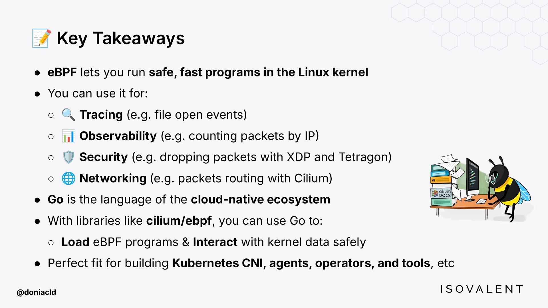 fast programs in the Linux kernel • You can use it for: ◦ 🔍 Tracing (e.g. file open events) ◦ 📊 Observability (e.g. counting packets by IP ◦ 🛡 Security (e.g. dropping packets with XDP and Tetragon) ◦ 🌐 Networking (e.g. packets routing with Cilium) • Go is the language of the cloud-native ecosystem • With libraries like cilium/ebpf, you can use Go to: ◦ Load eBPF programs & Interact with kernel data safely • Perfect fit for building Kubernetes CNI, agents, operators, and tools, etc