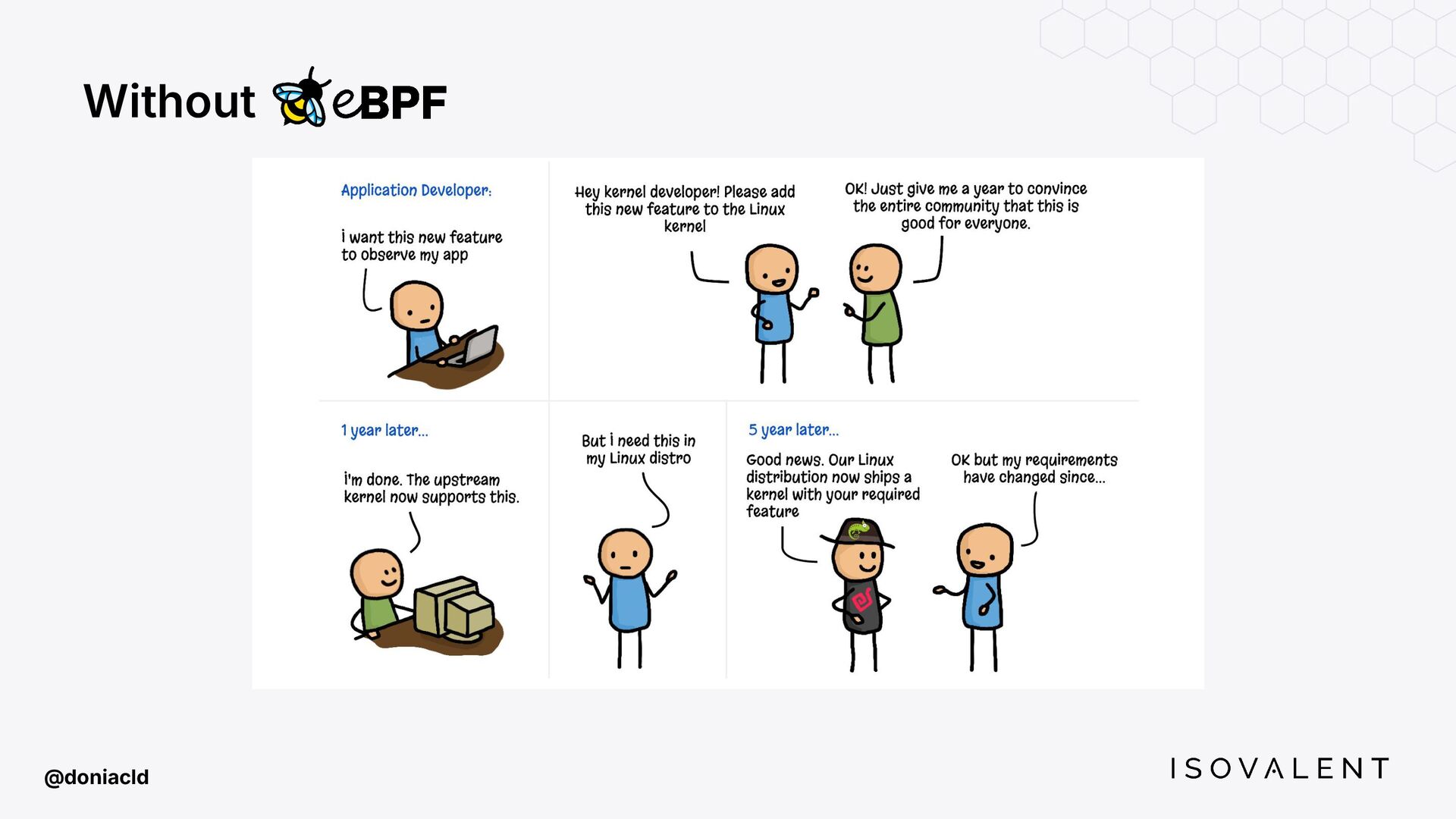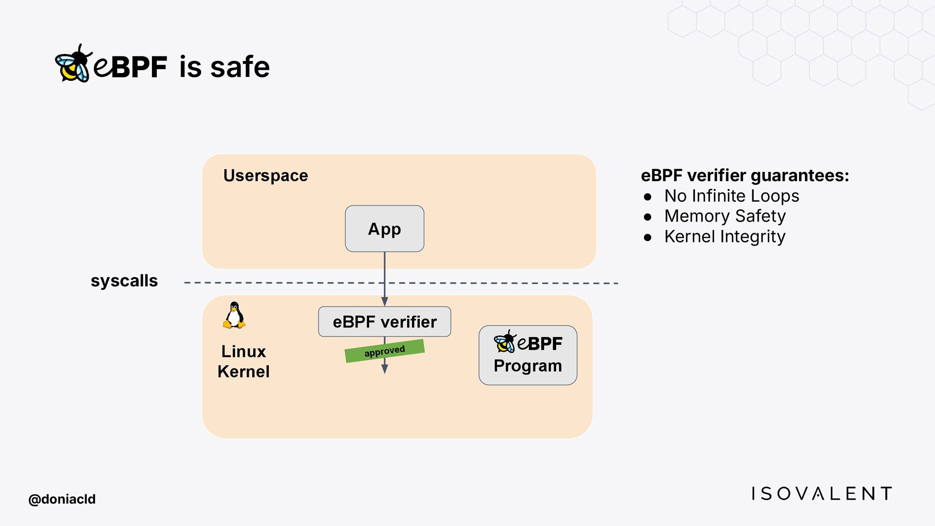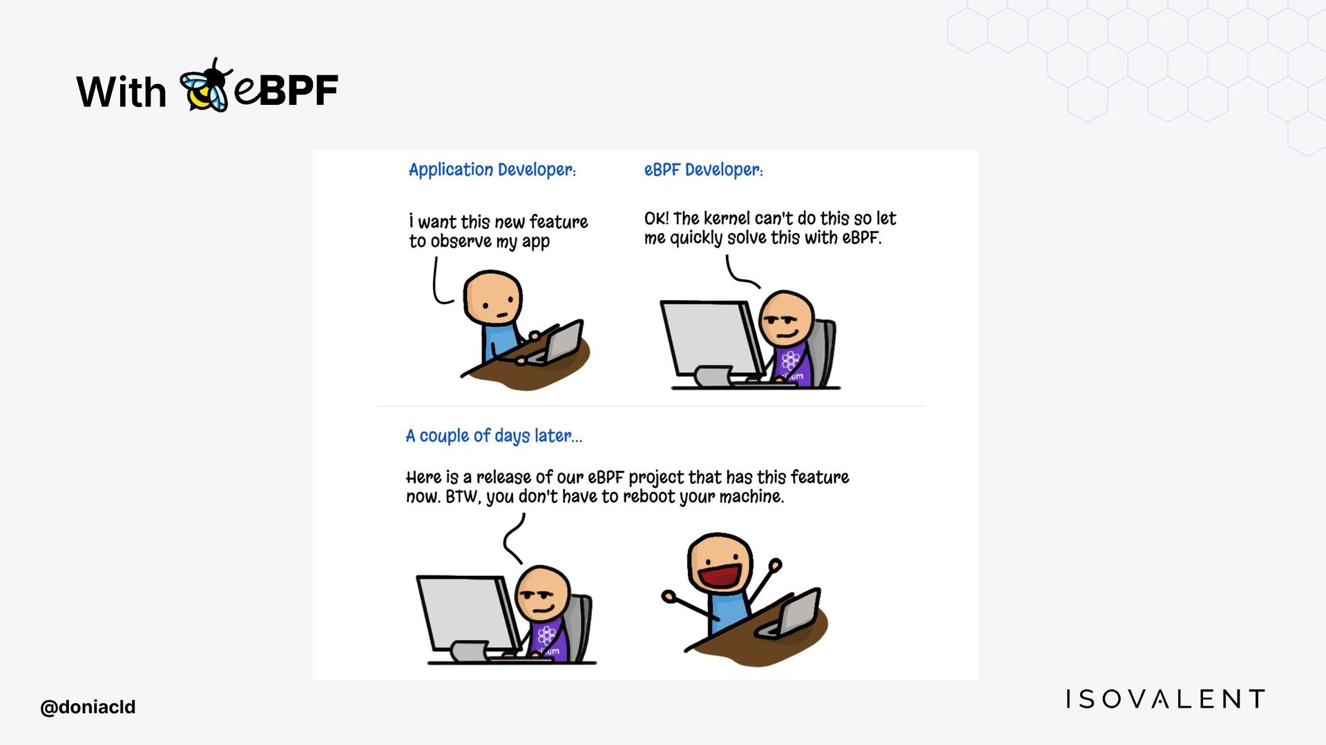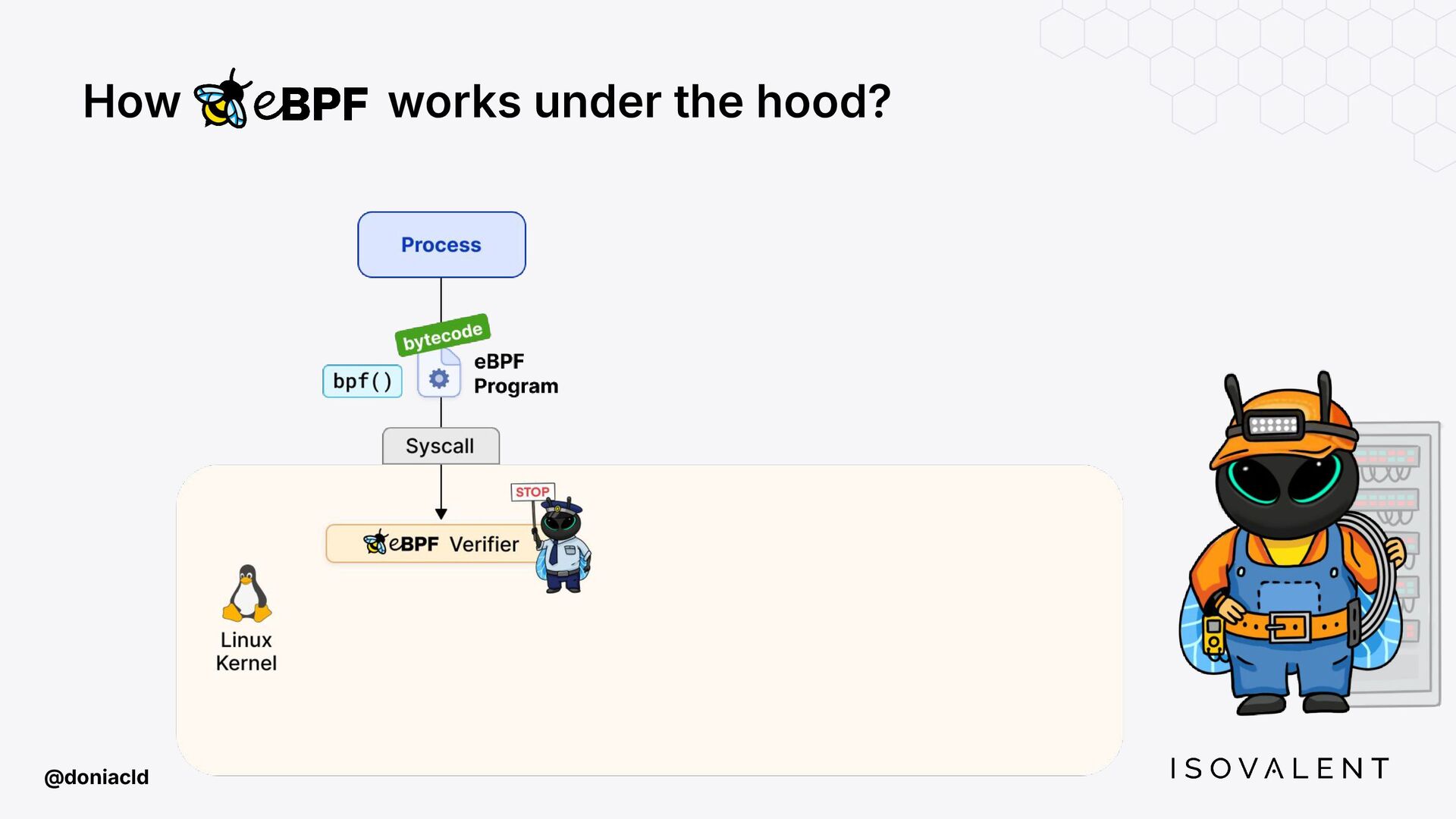 fast programs in the Linux kernel • You can use it for: ◦ 🔍 Tracing (e.g. file open events) ◦ 📊 Observability (e.g. counting packets by IP ◦ 🛡 Security (e.g. dropping packets with XDP and Tetragon) ◦ 🌐 Networking (e.g. packets routing with Cilium) • Go is the language of the cloud-native ecosystem • With libraries like cilium/ebpf, you can use Go to: ◦ Load eBPF programs & Interact with kernel data safely • Perfect fit for building Kubernetes CNI, agents, operators, and tools, etc