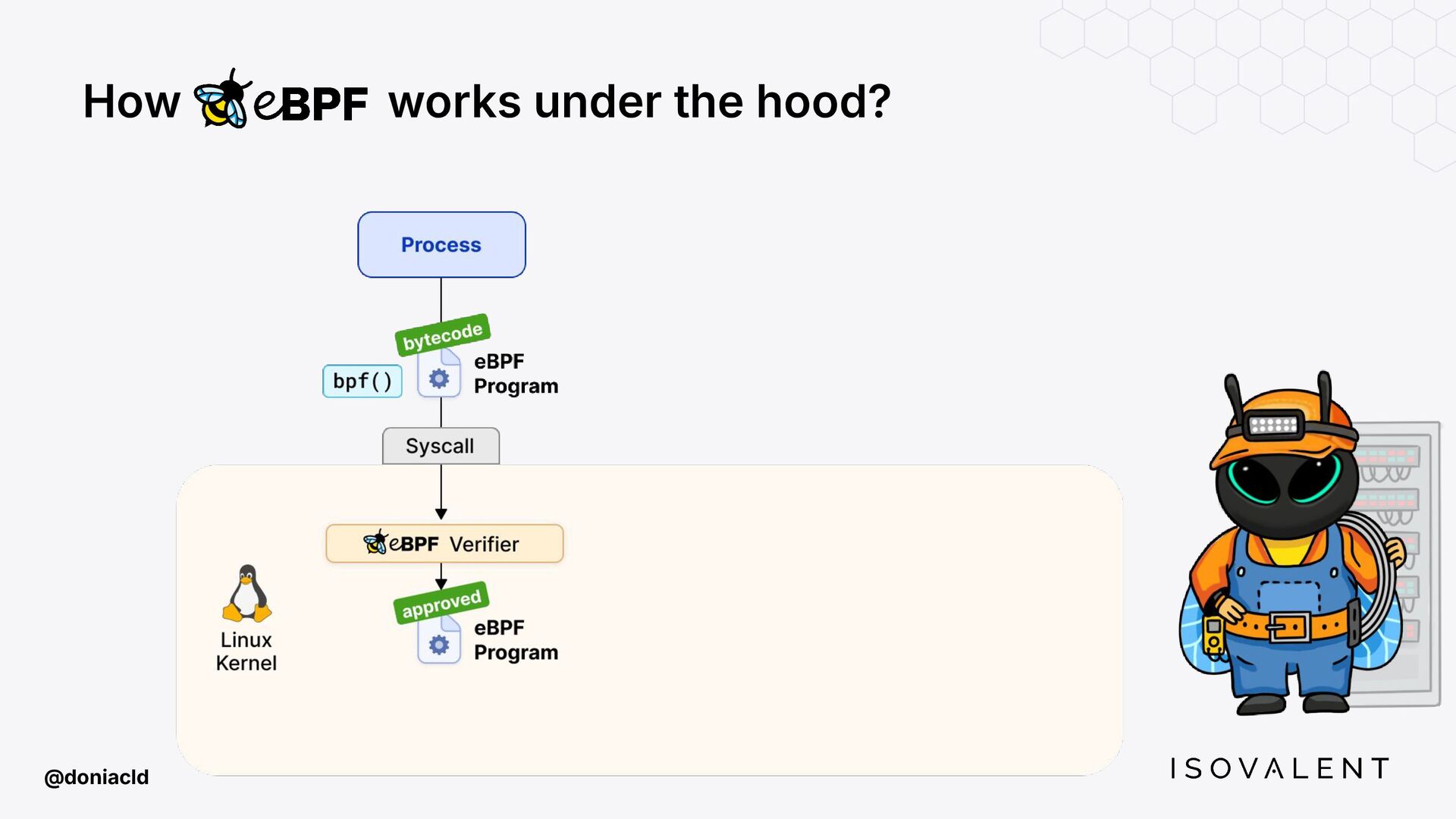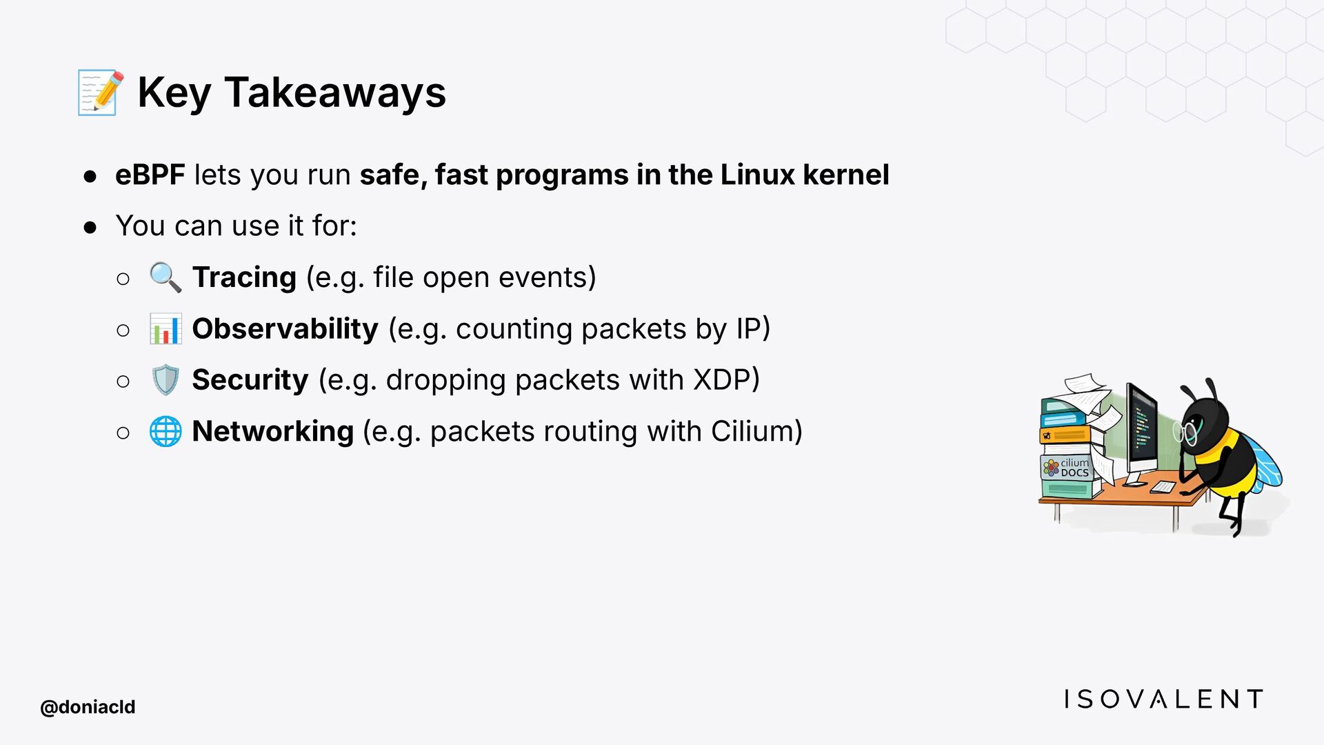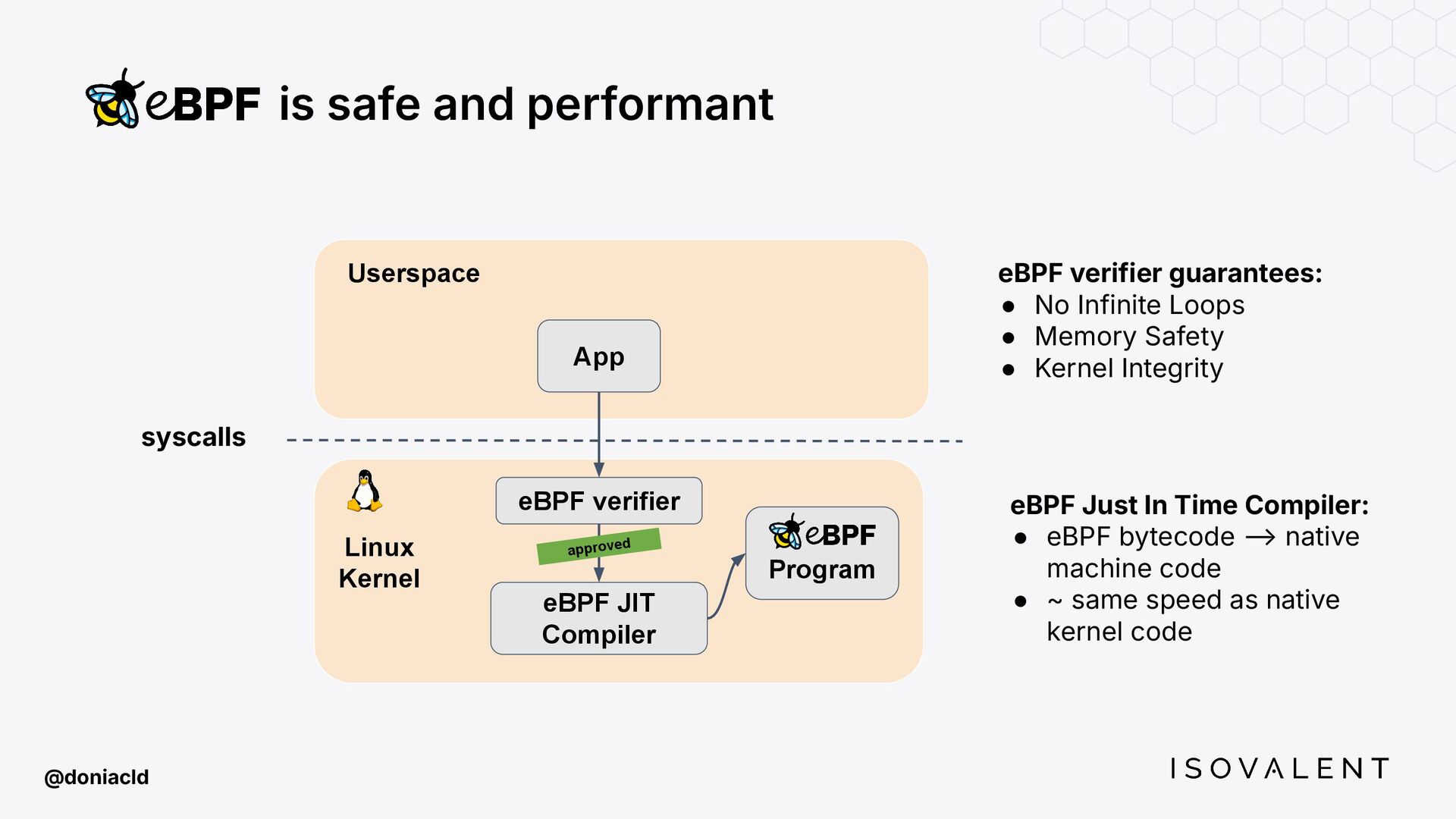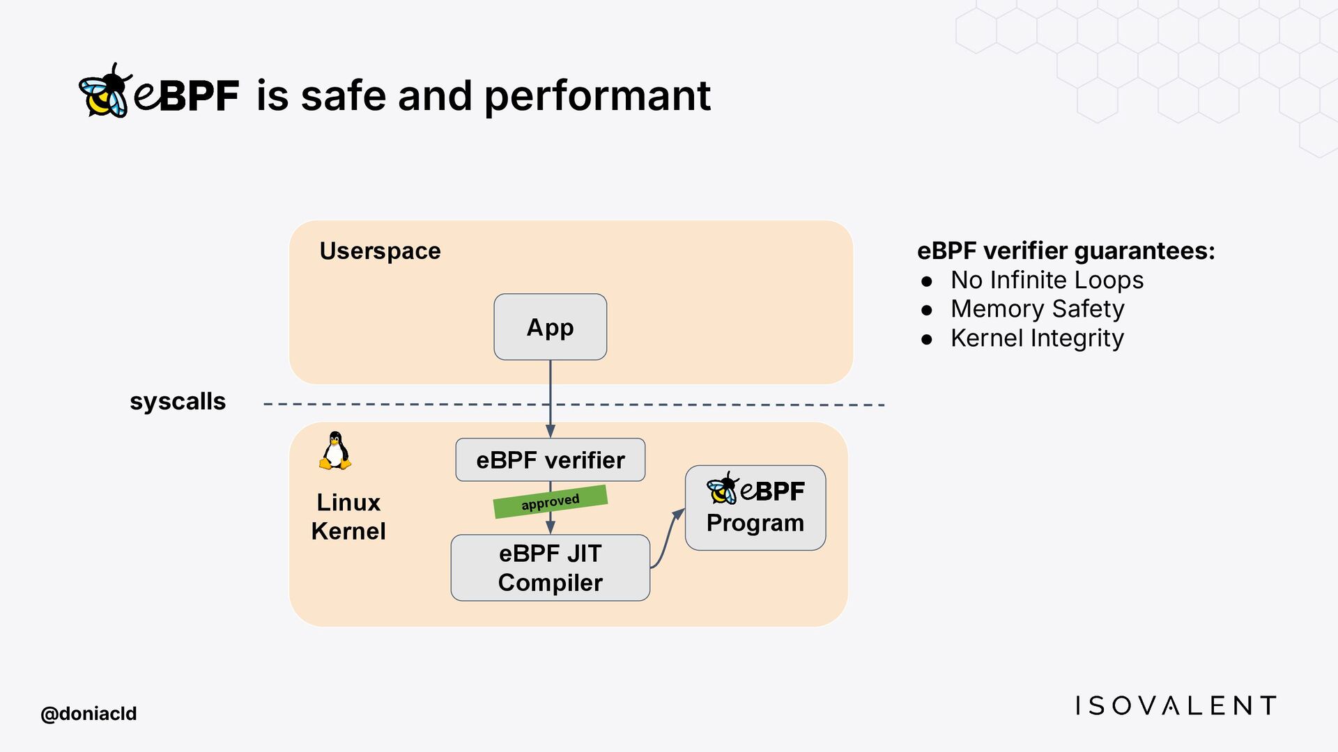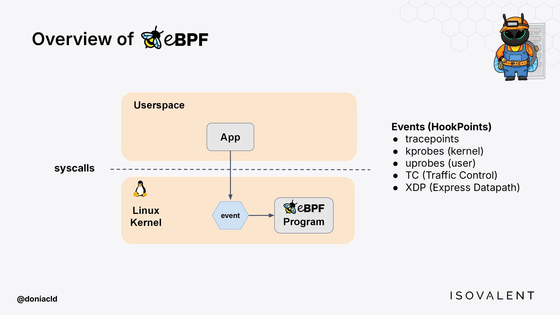 fast programs in the Linux kernel • You can use it for: ◦ 🔍 Tracing (e.g. file open events) ◦ 📊 Observability (e.g. counting packets by IP ◦ 🛡 Security (e.g. dropping packets with XDP ◦ 🌐 Networking (e.g. packets routing with Cilium)