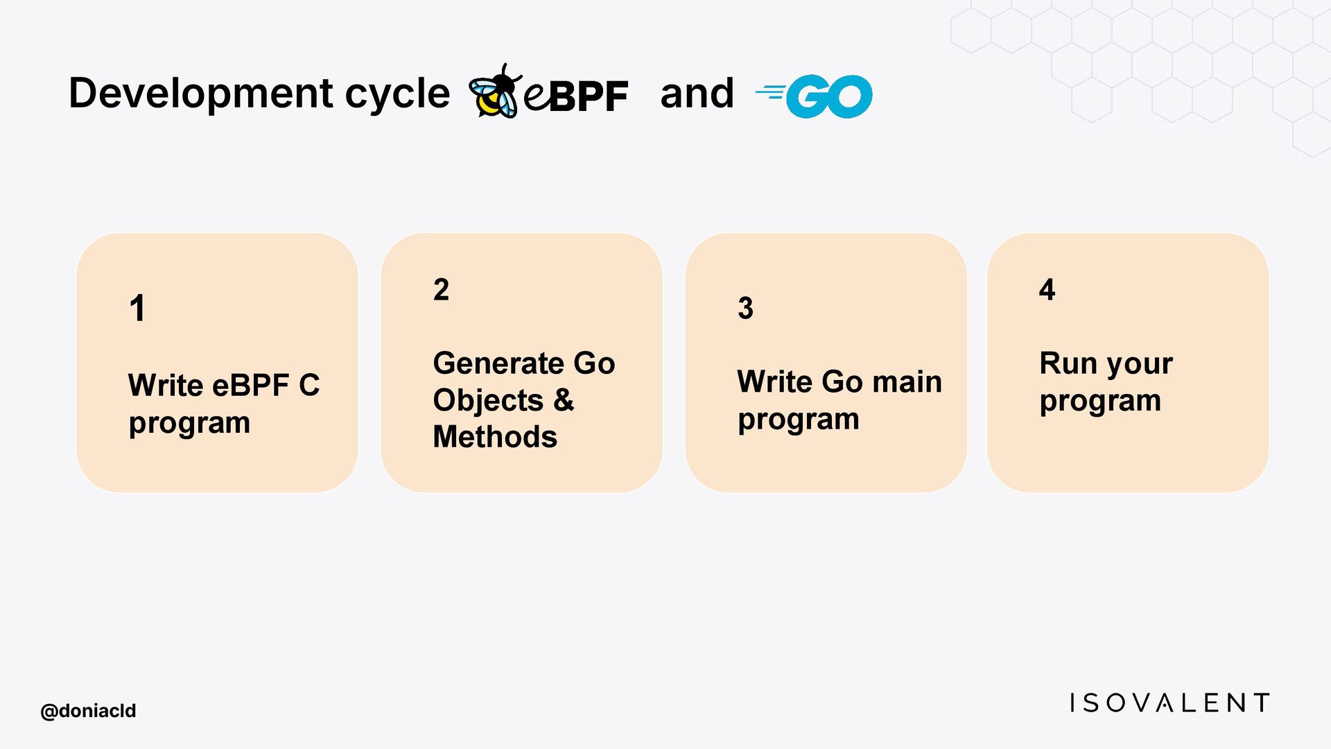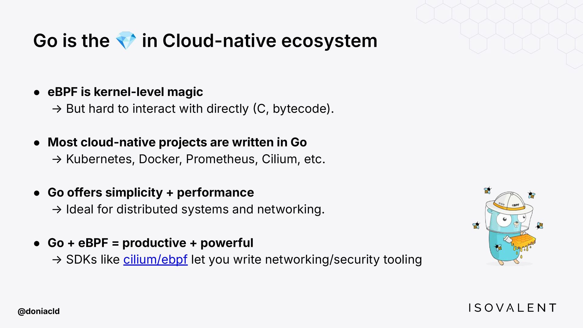 is kernel-level magic → But hard to interact with directly C, bytecode). • Most cloud-native projects are written in Go → Kubernetes, Docker, Prometheus, Cilium, etc. • Go offers simplicity + performance → Ideal for distributed systems and networking. • Go + eBPF = productive + powerful → SDKs like cilium/ebpf let you write networking/security tooling