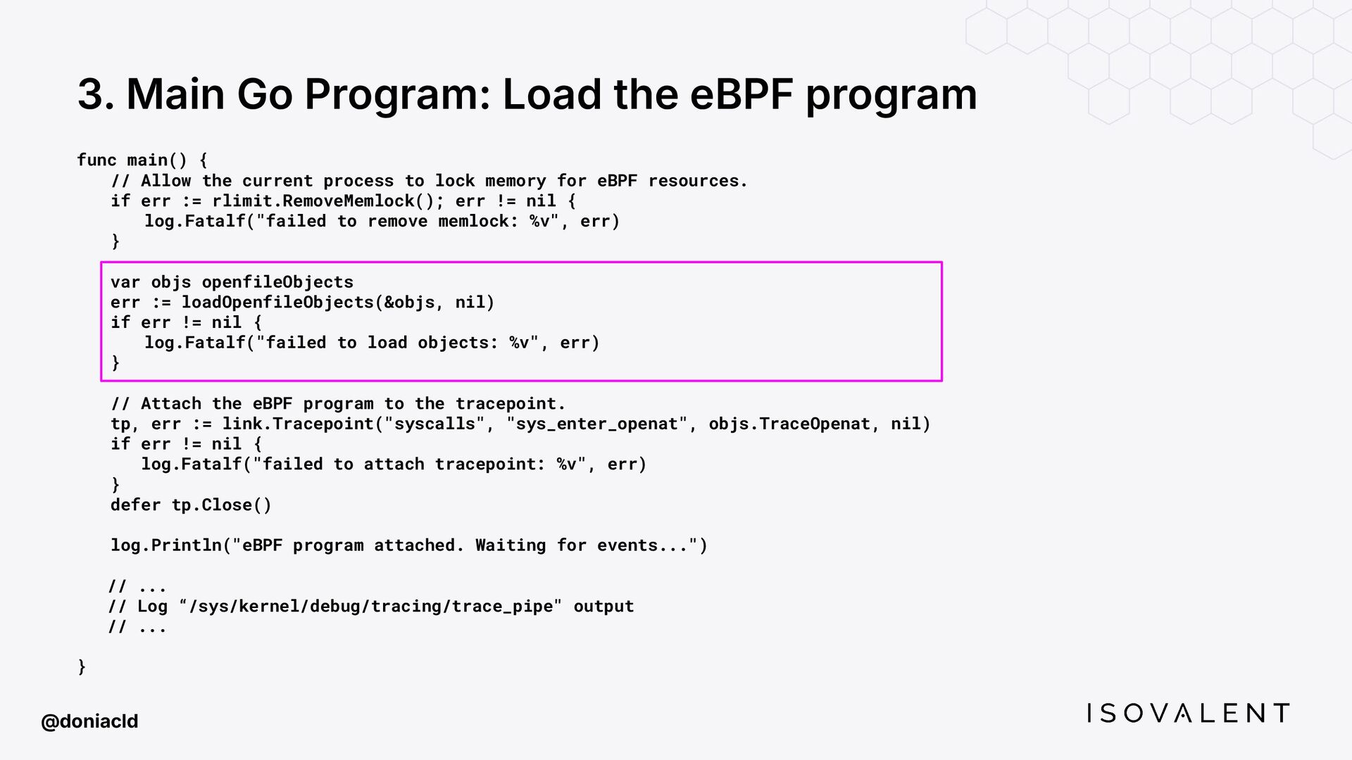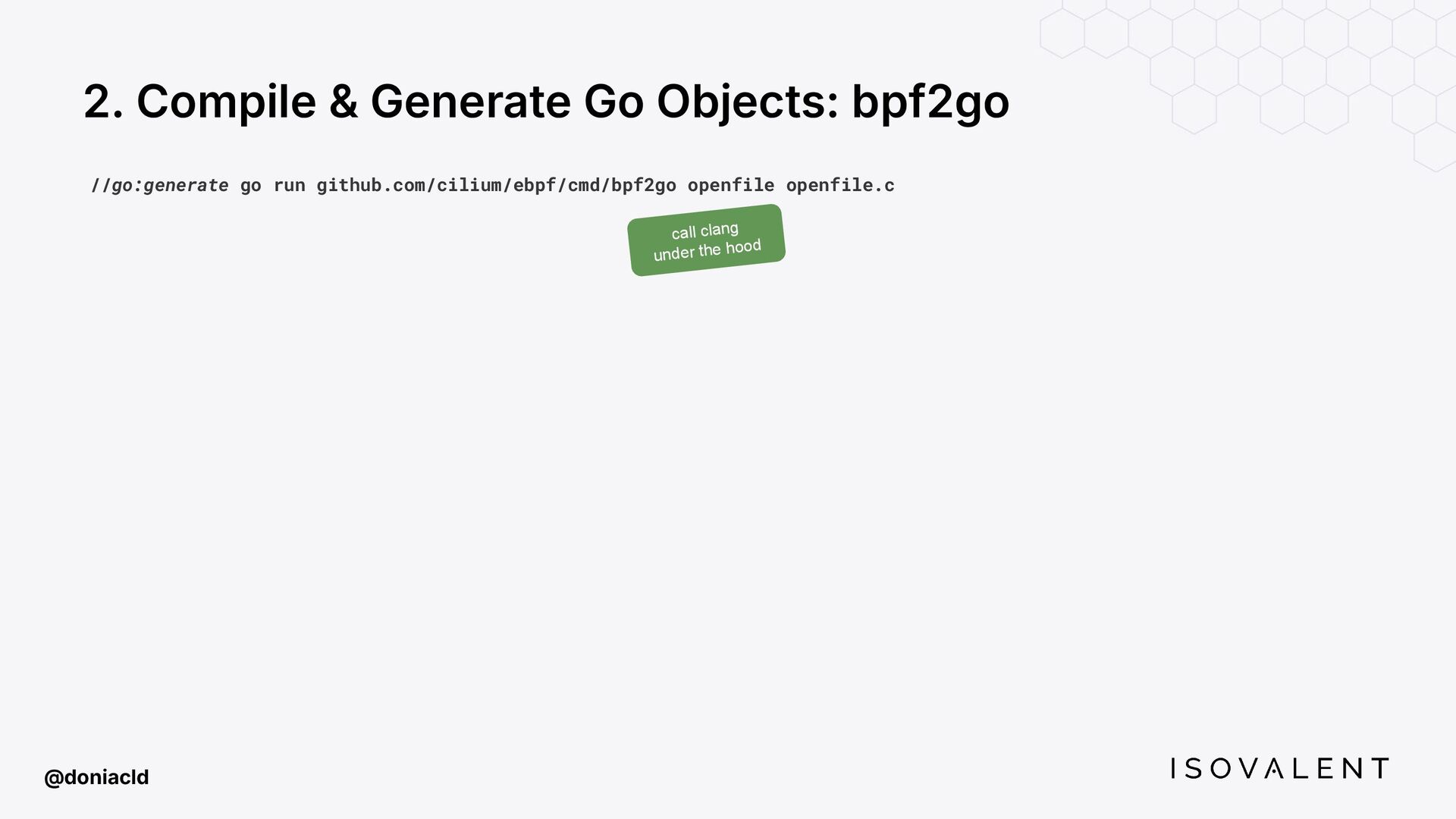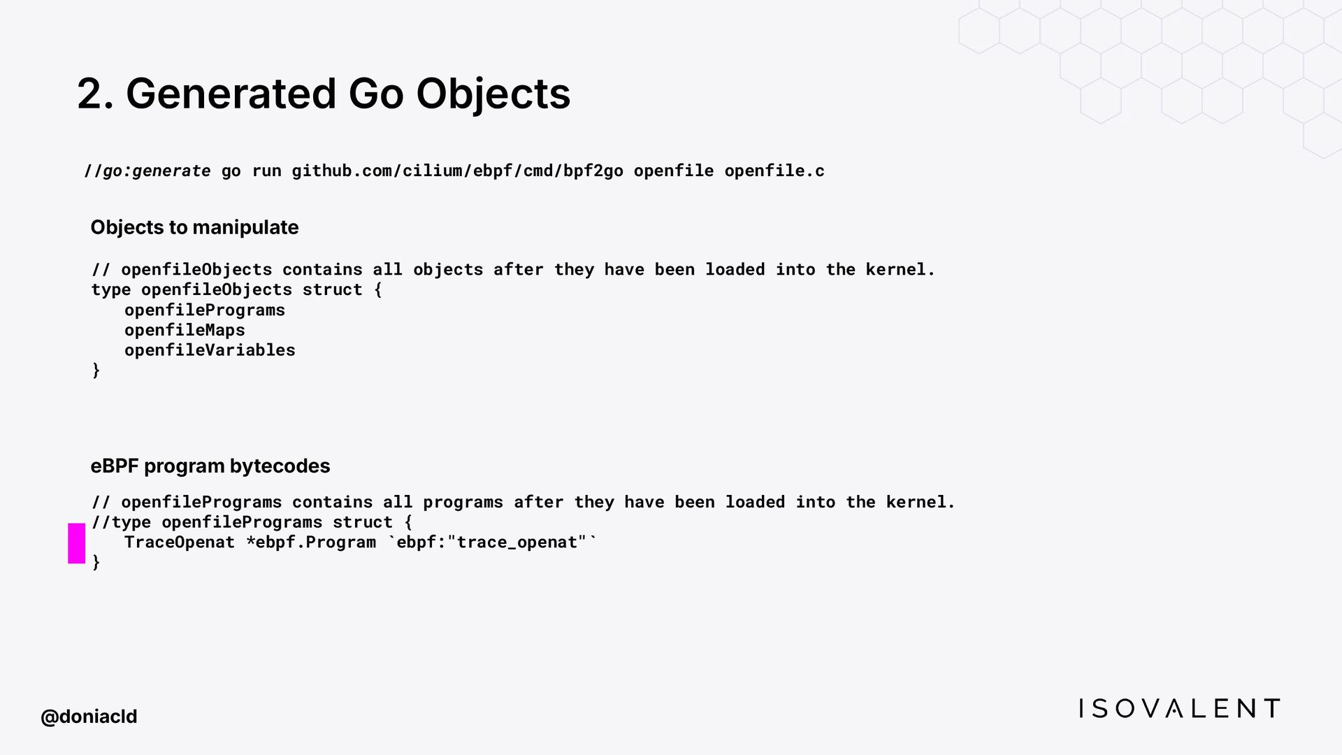 after they have been loaded into the kernel. //type openfilePrograms struct { TraceOpenat *ebpf.Program `ebpf:"trace_openat"` } Objects to manipulate // openfileObjects contains all objects after they have been loaded into the kernel. type openfileObjects struct { openfilePrograms openfileMaps openfileVariables } //go:generate go run github.com/cilium/ebpf/cmd/bpf2go openfile openfile.c eBPF program bytecodes