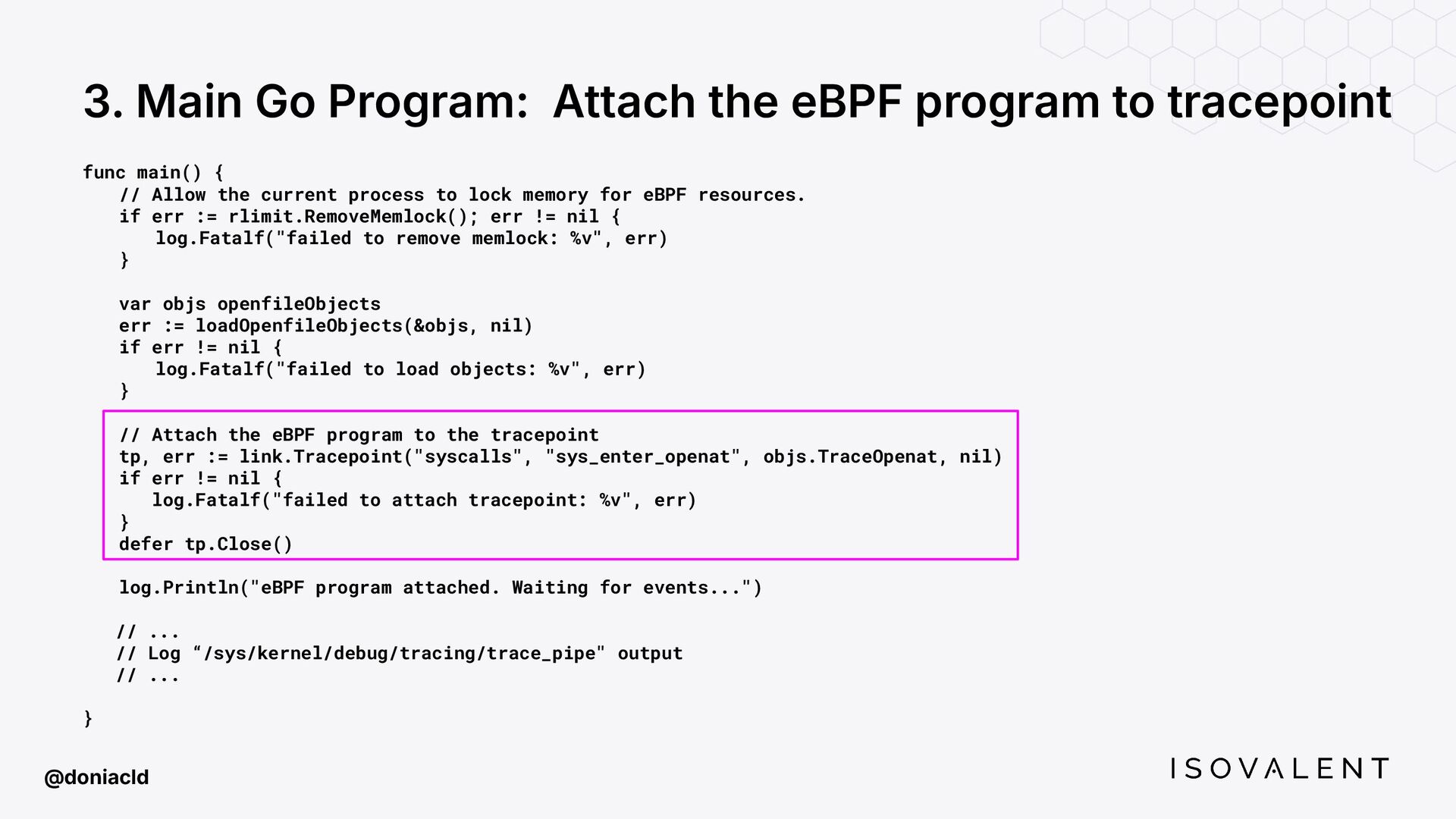 fast programs in the Linux kernel • You can use it for: ◦ 🔍 Tracing (e.g. file open events) ◦ 📊 Observability (e.g. counting packets by IP ◦ 🛡 Security (e.g. dropping packets with XDP ◦ 🌐 Networking (e.g. packets routing with Cilium) • Go is the language of the cloud-native ecosystem
