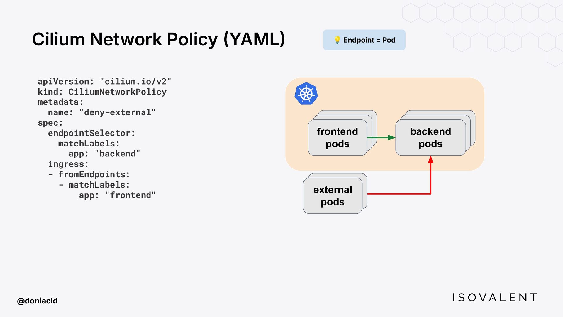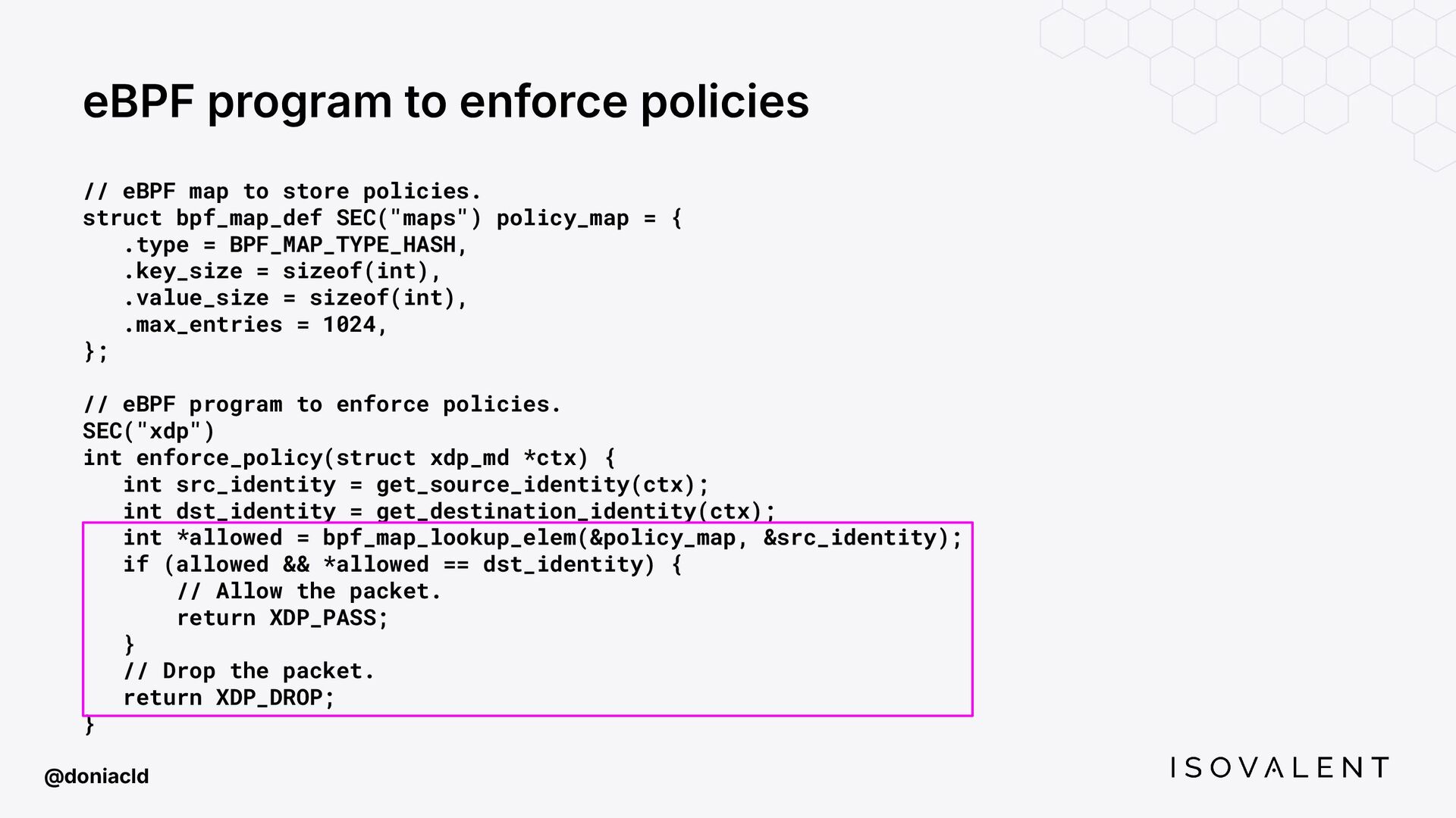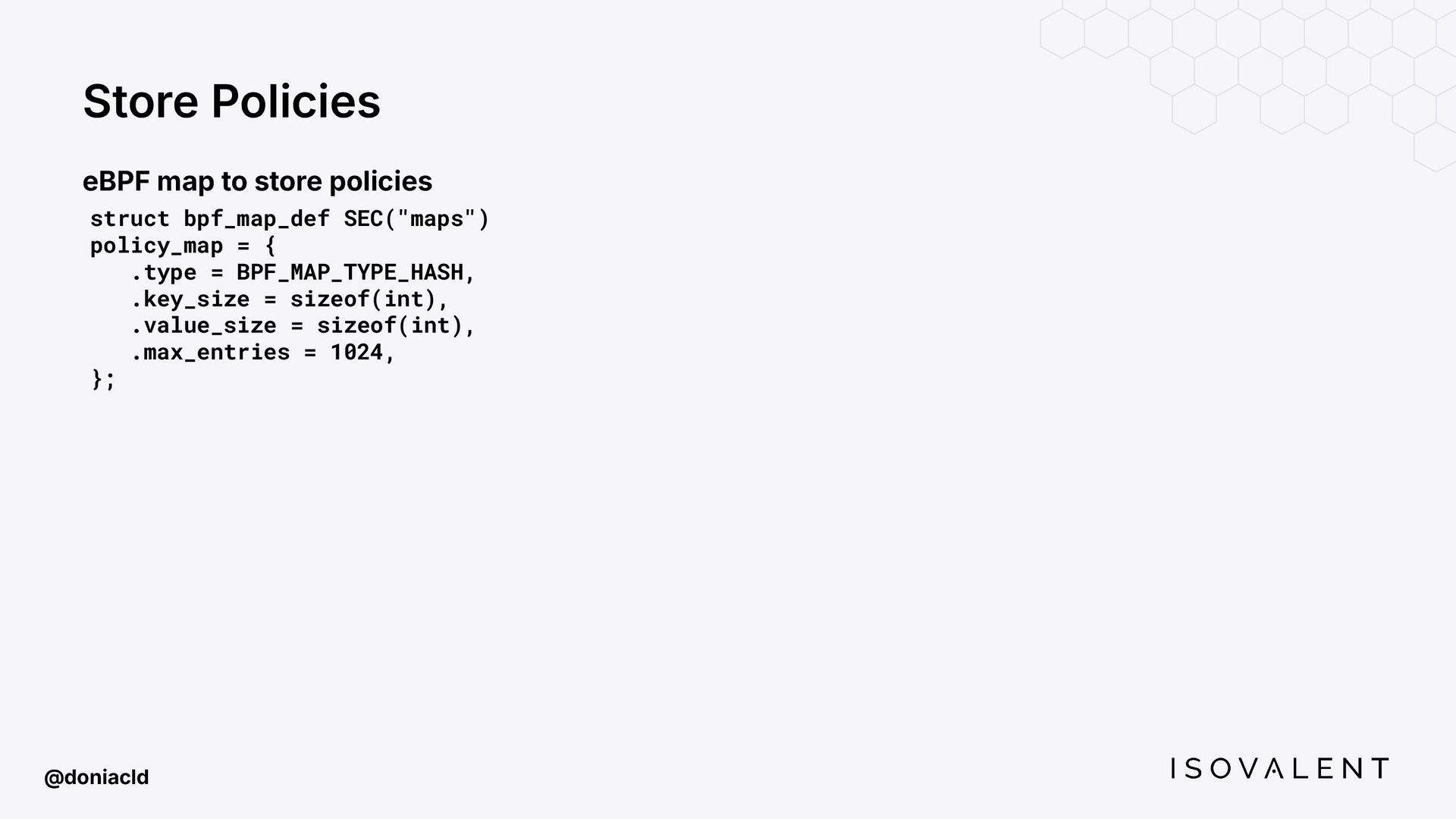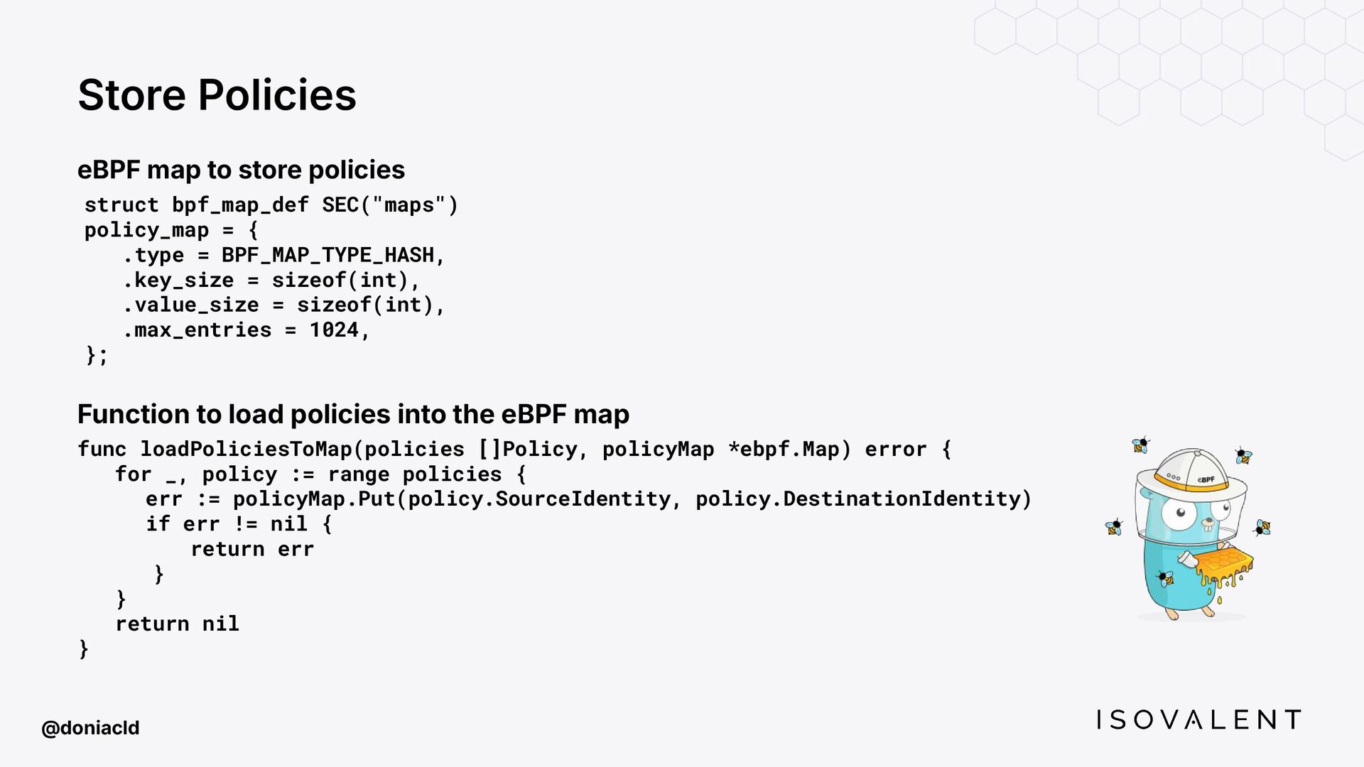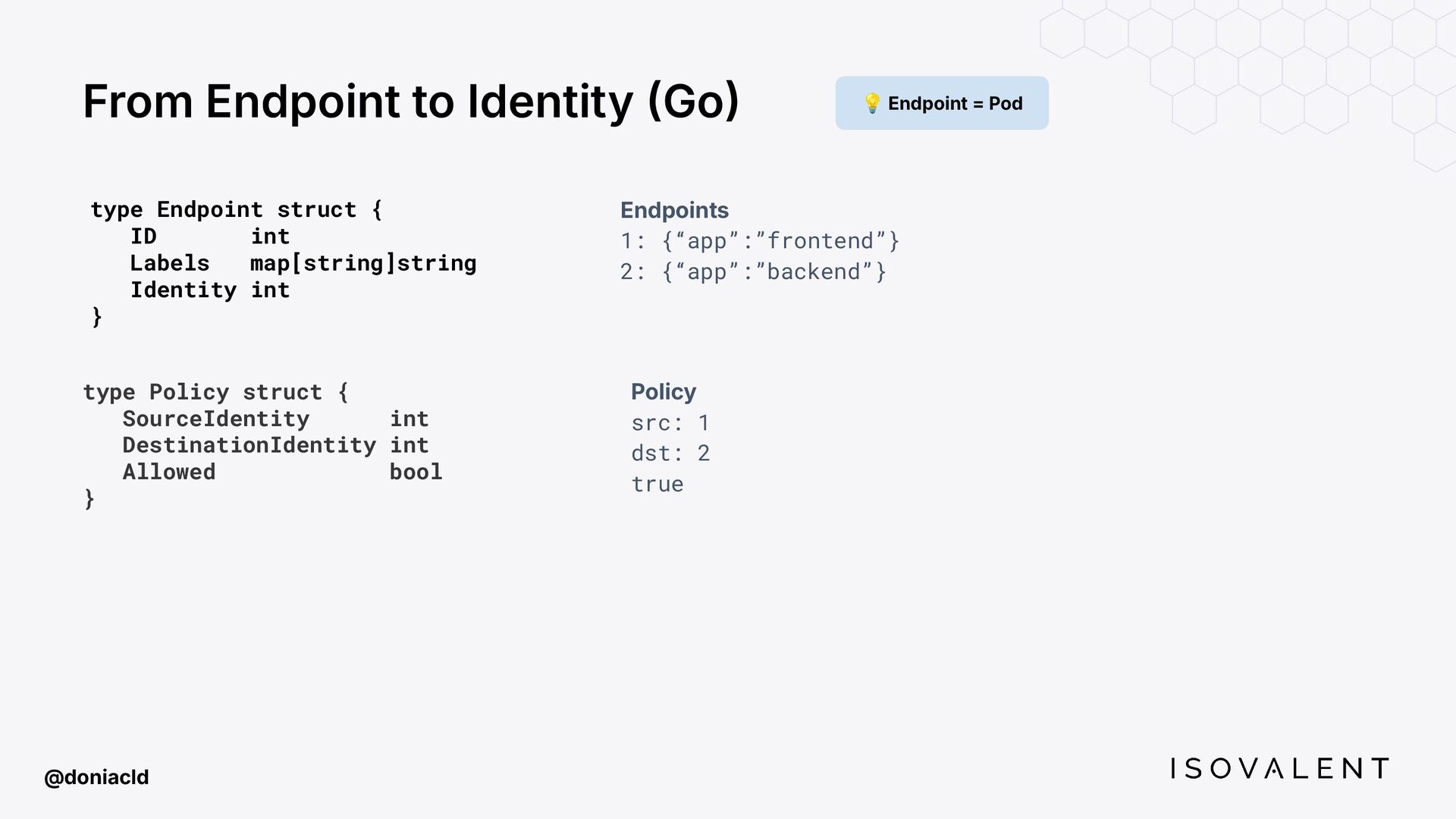 ID int Labels map[string]string Identity int } 💡 Endpoint = Pod Endpoints 1: {“app”:”frontend”} 2: {“app”:”backend”} type Policy struct { SourceIdentity int DestinationIdentity int Allowed bool } Policy src: 1 dst: 2 true