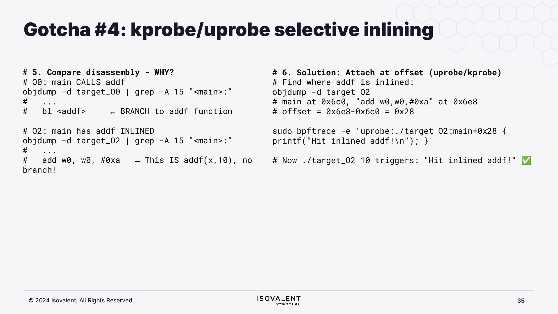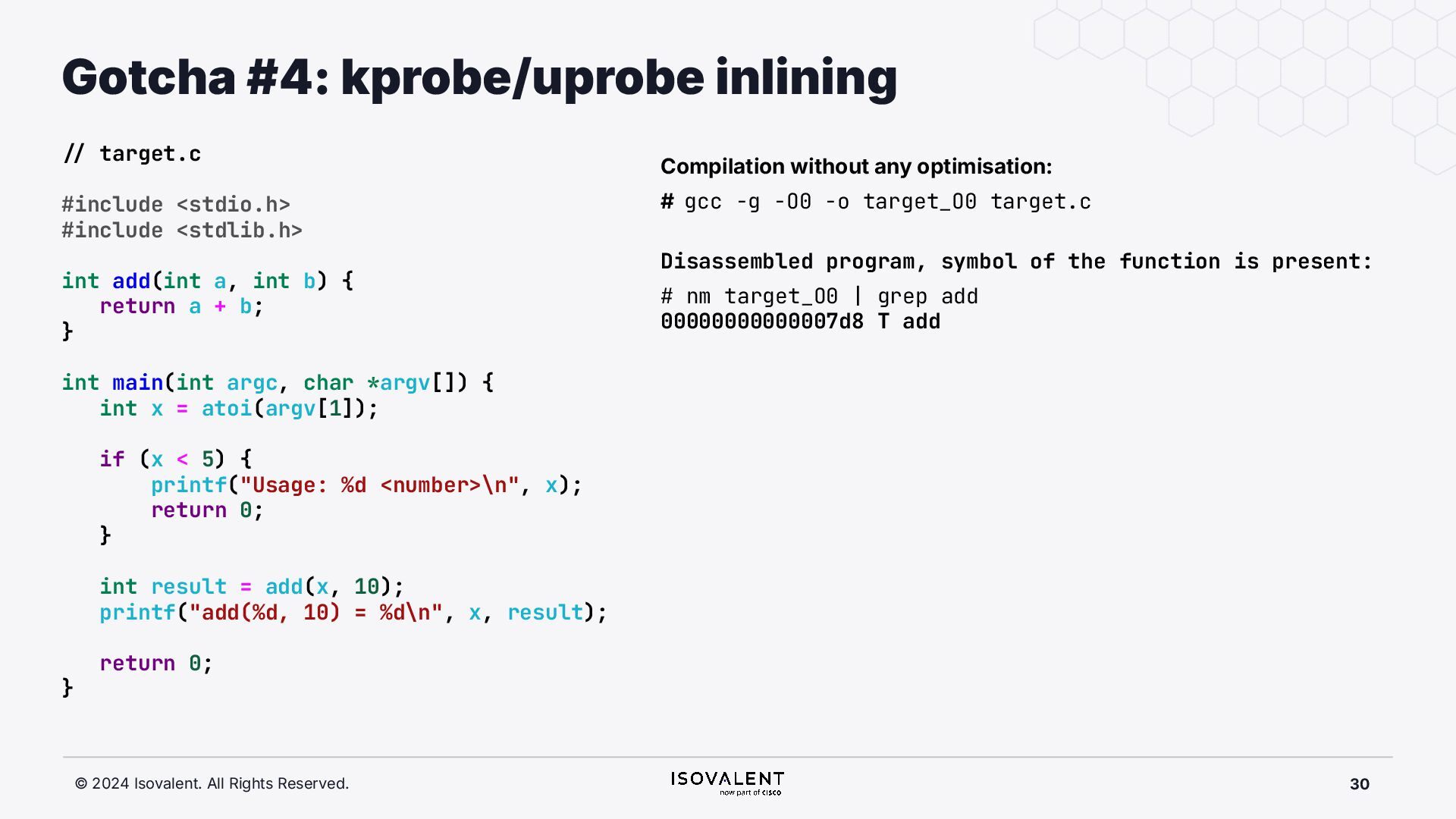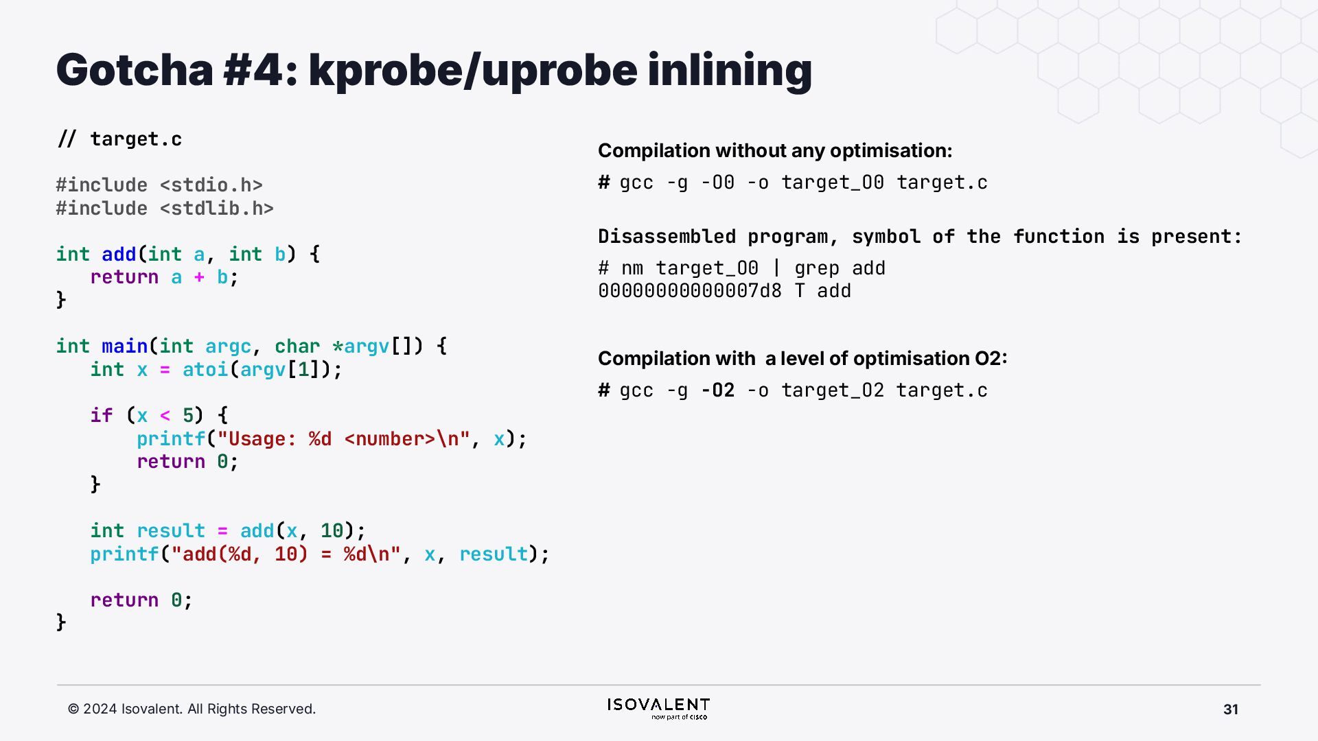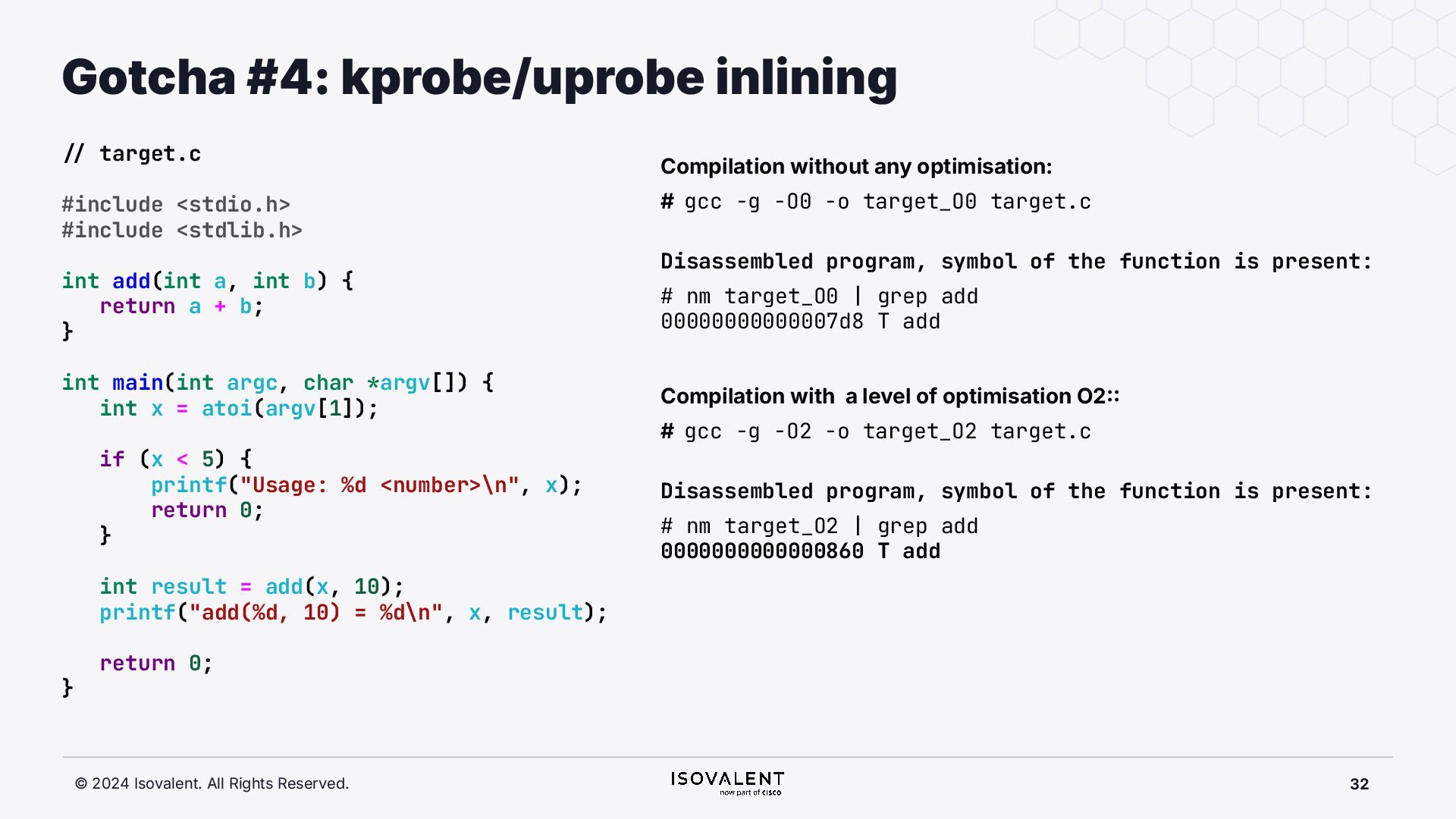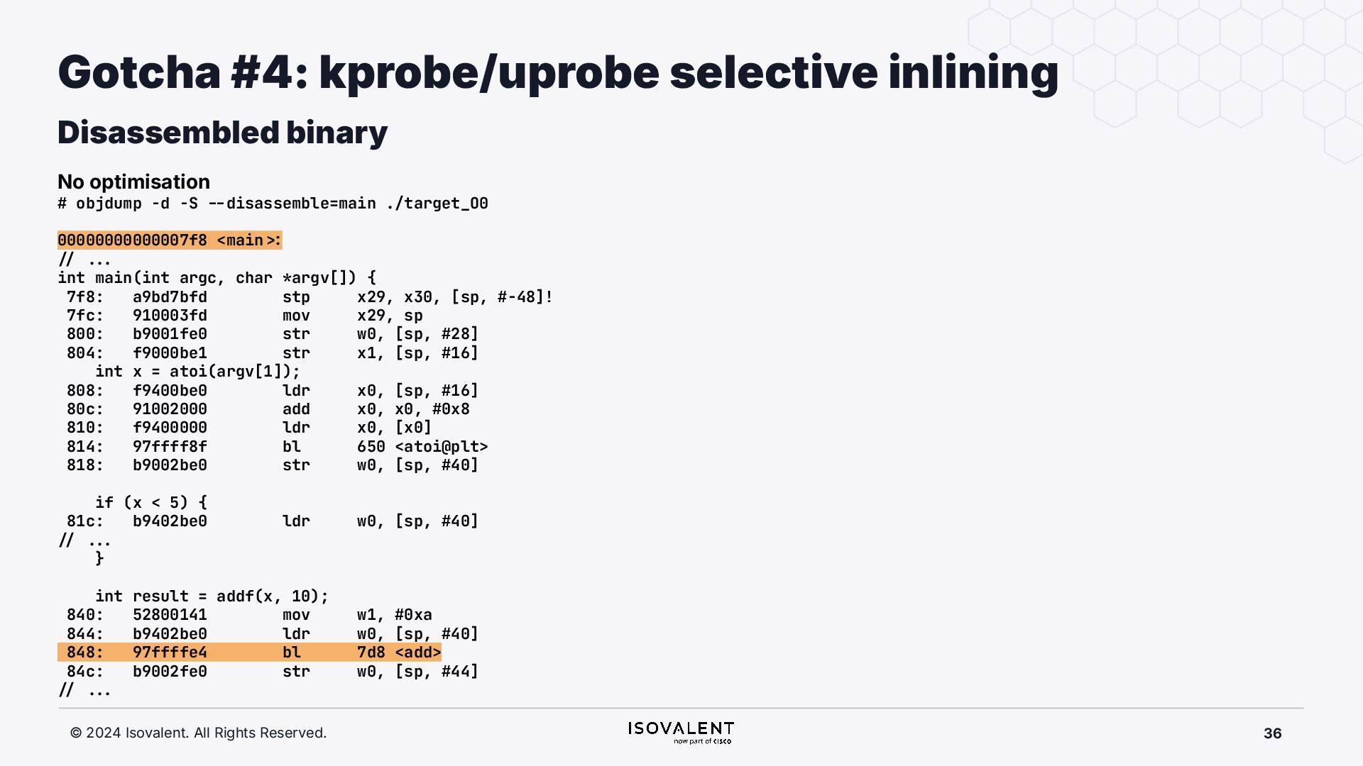 selective inlining Disassembled binary No optimisation # objdump -d -S .-disassemble=main ./target_O0 00000000000007f8 <main.: ./ ... int main(int argc, char *argv[]) { 7f8: a9bd7bfd stp x29, x30, [sp, #-48]! 7fc: 910003fd mov x29, sp 800: b9001fe0 str w0, [sp, #28] 804: f9000be1 str x1, [sp, #16] int x = atoi(argv[1]); 808: f9400be0 ldr x0, [sp, #16] 80c: 91002000 add x0, x0, #0x8 810: f9400000 ldr x0, [x0] 814: 97ffff8f bl 650 <atoi@plt> 818: b9002be0 str w0, [sp, #40] if (x < 5) { 81c: b9402be0 ldr w0, [sp, #40] ./ ... } int result = addf(x, 10); 840: 52800141 mov w1, #0xa 844: b9402be0 ldr w0, [sp, #40] 848: 97ffffe4 bl 7d8 <add> 84c: b9002fe0 str w0, [sp, #44] ./ ... Optimised # objdump -d -S .-disassemble=main ./target_O2 00000000000006c0 <main.: ./ ... int main(int argc, char *argv[]) { 6c0: aa0103e0 mov x0, x1 6c4: a9bf7bfd stp x29, x30, [sp, #-16]! ./ ... int x = atoi(argv[1]); if (x < 5) { 6e0: 7100101f cmp w0, #0x4 6e4: 5400012d b.le 708 <main+0x48> } ./ ... 6e8: 11002803 add w3, w0, #0xa 6ec: 90000001 adrp x1, 0 <._abi_tag-0x278> 6f0: 52800040 mov w0, #0x2 ./ #2 6f4: 91228021 add x1, x1, #0x8a0 6f8: 97ffffd6 bl 650 <._printf_chk@plt> int result = addf(x, 10); printf("addf(%d, 10) = %d\n", x, result); ./ ...