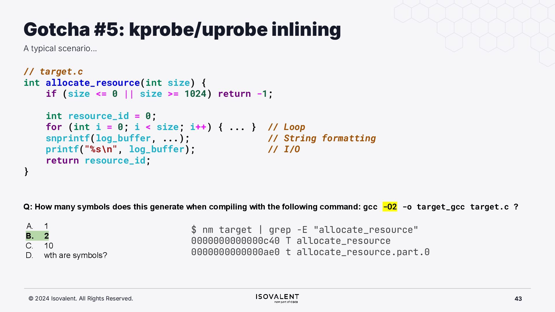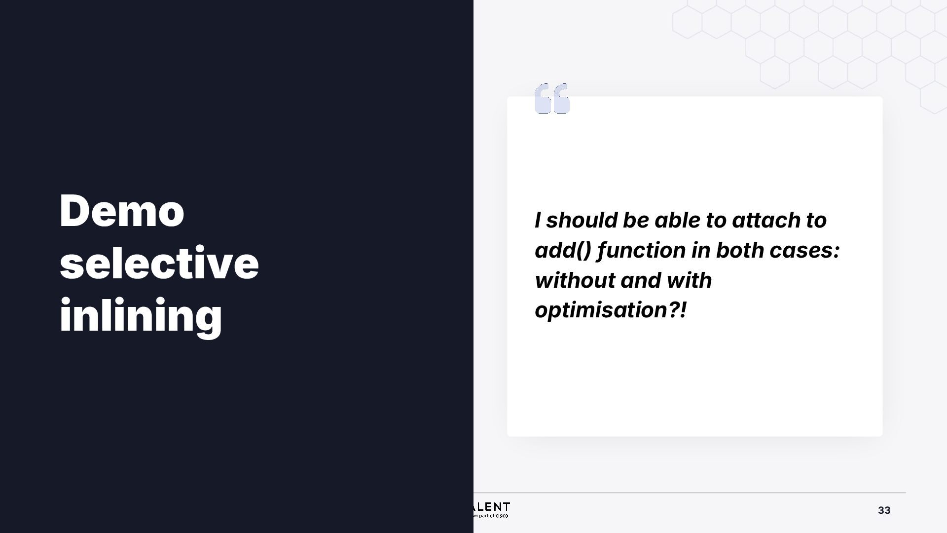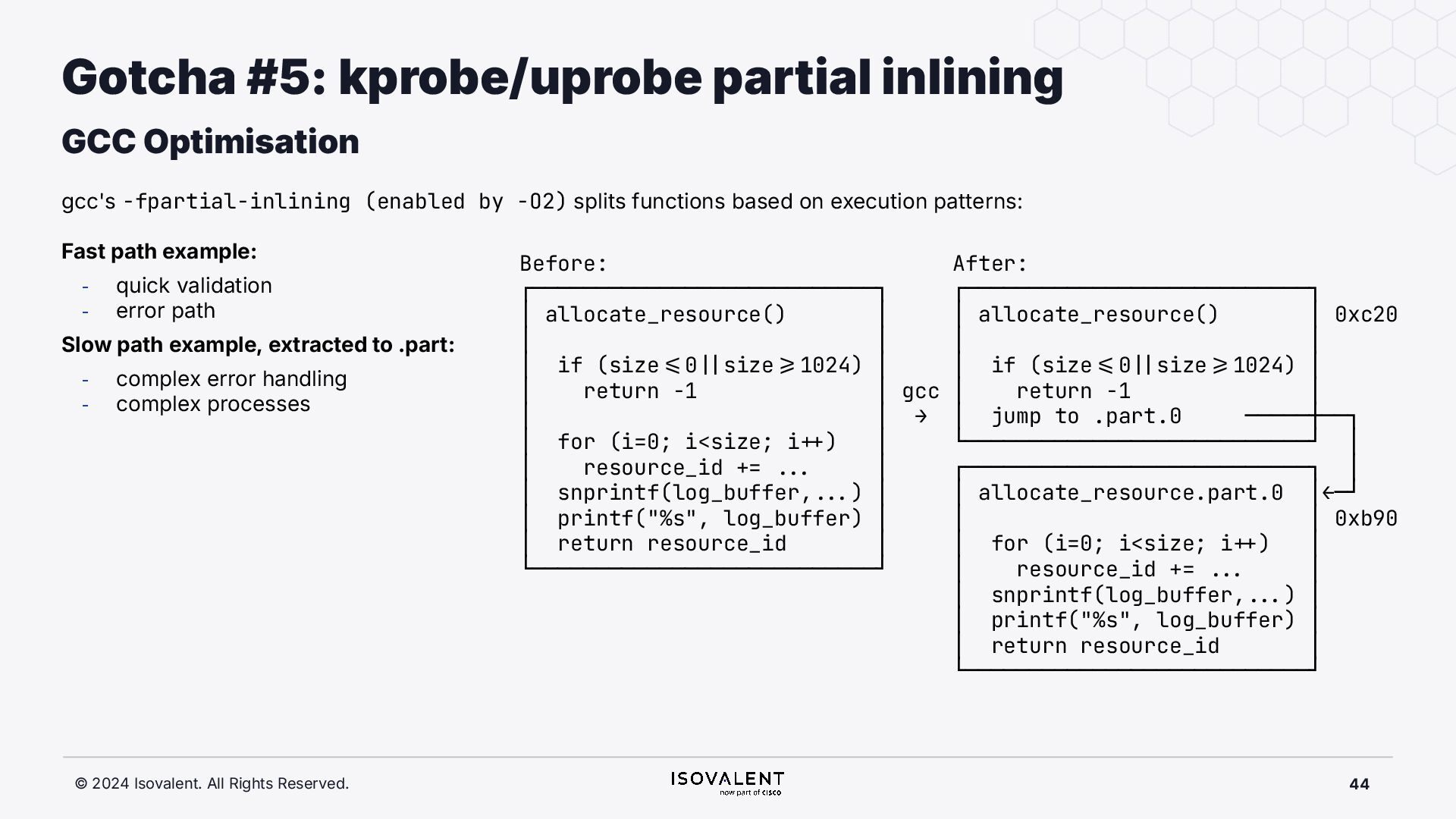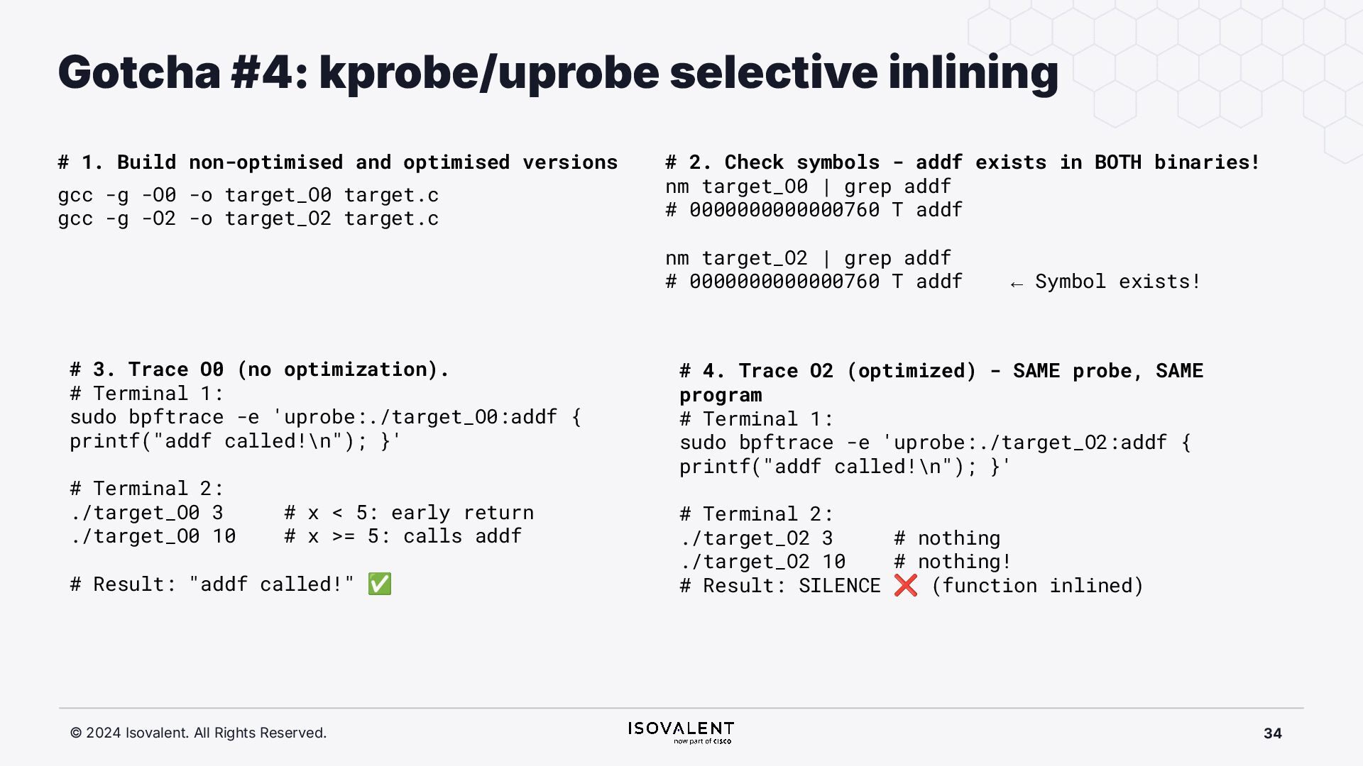 selective inlining Disassembled binary No optimisation # objdump -d -S .-disassemble=main ./target_O0 00000000000007f8 <main.: ./ ... int main(int argc, char *argv[]) { 7f8: a9bd7bfd stp x29, x30, [sp, #-48]! 7fc: 910003fd mov x29, sp 800: b9001fe0 str w0, [sp, #28] 804: f9000be1 str x1, [sp, #16] int x = atoi(argv[1]); 808: f9400be0 ldr x0, [sp, #16] 80c: 91002000 add x0, x0, #0x8 810: f9400000 ldr x0, [x0] 814: 97ffff8f bl 650 <atoi@plt> 818: b9002be0 str w0, [sp, #40] if (x < 5) { 81c: b9402be0 ldr w0, [sp, #40] ./ ... } int result = addf(x, 10); 840: 52800141 mov w1, #0xa 844: b9402be0 ldr w0, [sp, #40] 848: 97ffffe4 bl 7d8 <add> 84c: b9002fe0 str w0, [sp, #44] ./ ... Optimised # objdump -d -S .-disassemble=main ./target_O2 00000000000006c0 <main.: ./ ... int main(int argc, char *argv[]) { 6c0: aa0103e0 mov x0, x1 6c4: a9bf7bfd stp x29, x30, [sp, #-16]! ./ ... int x = atoi(argv[1]); if (x < 5) { 6e0: 7100101f cmp w0, #0x4 6e4: 5400012d b.le 708 <main+0x48> } ./ ... 6e8: 11002803 add w3, w0, #0xa 6ec: 90000001 adrp x1, 0 <._abi_tag-0x278> 6f0: 52800040 mov w0, #0x2 ./ #2 6f4: 91228021 add x1, x1, #0x8a0 6f8: 97ffffd6 bl 650 <._printf_chk@plt> int result = addf(x, 10); printf("addf(%d, 10) = %d\n", x, result); ./ ...