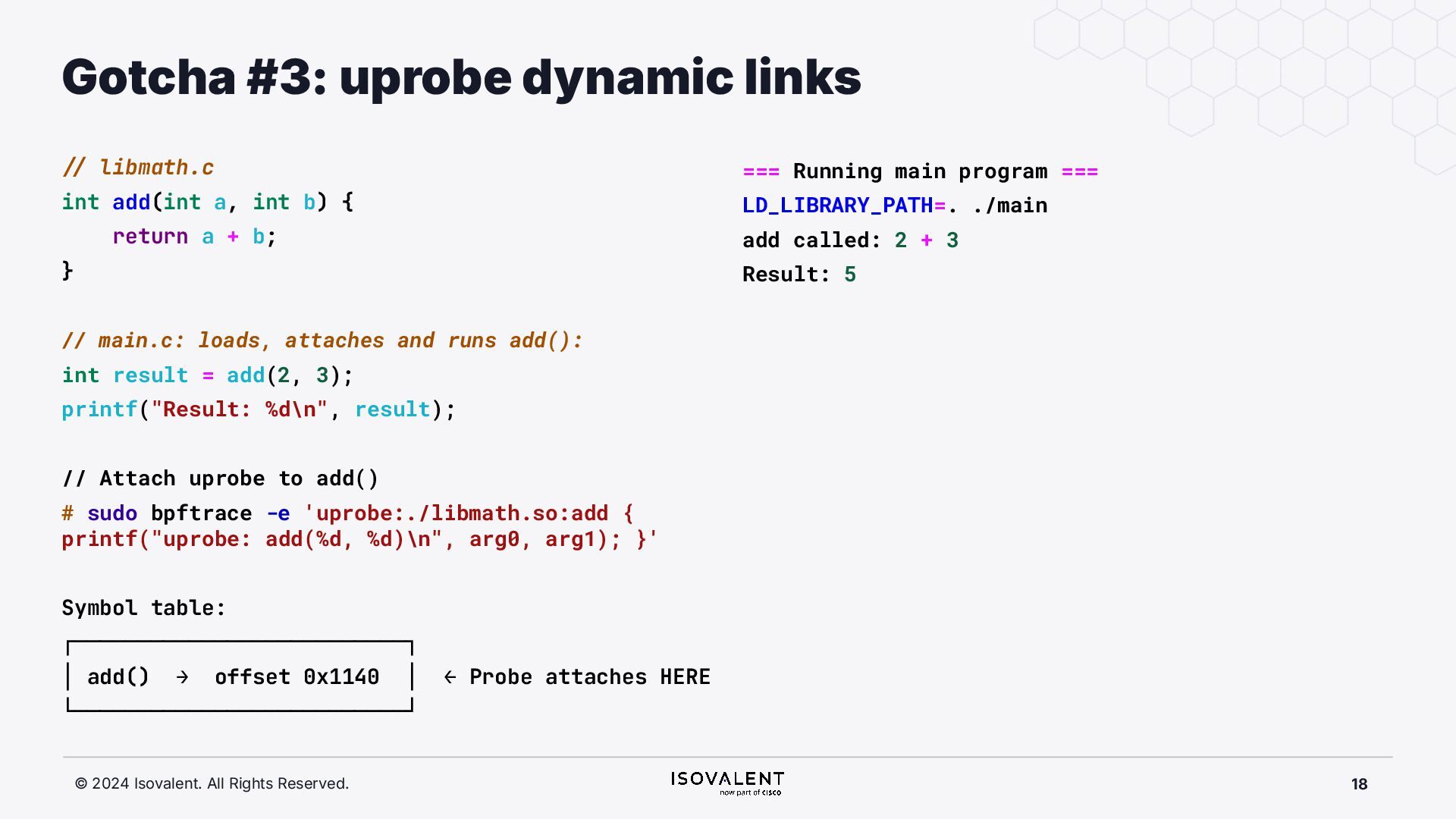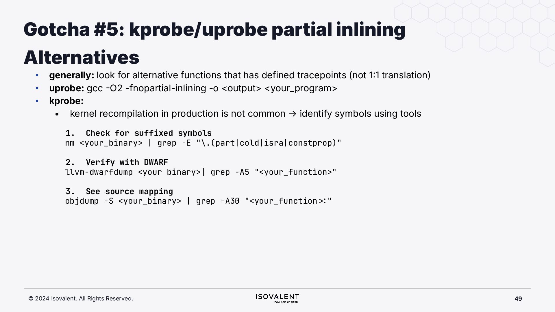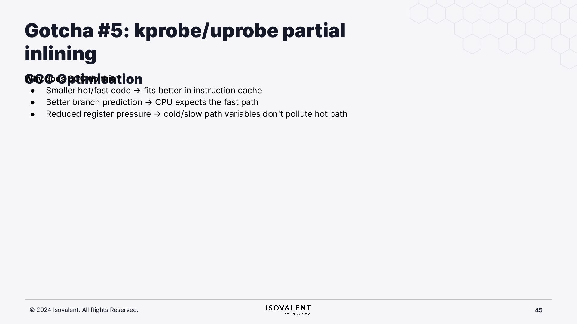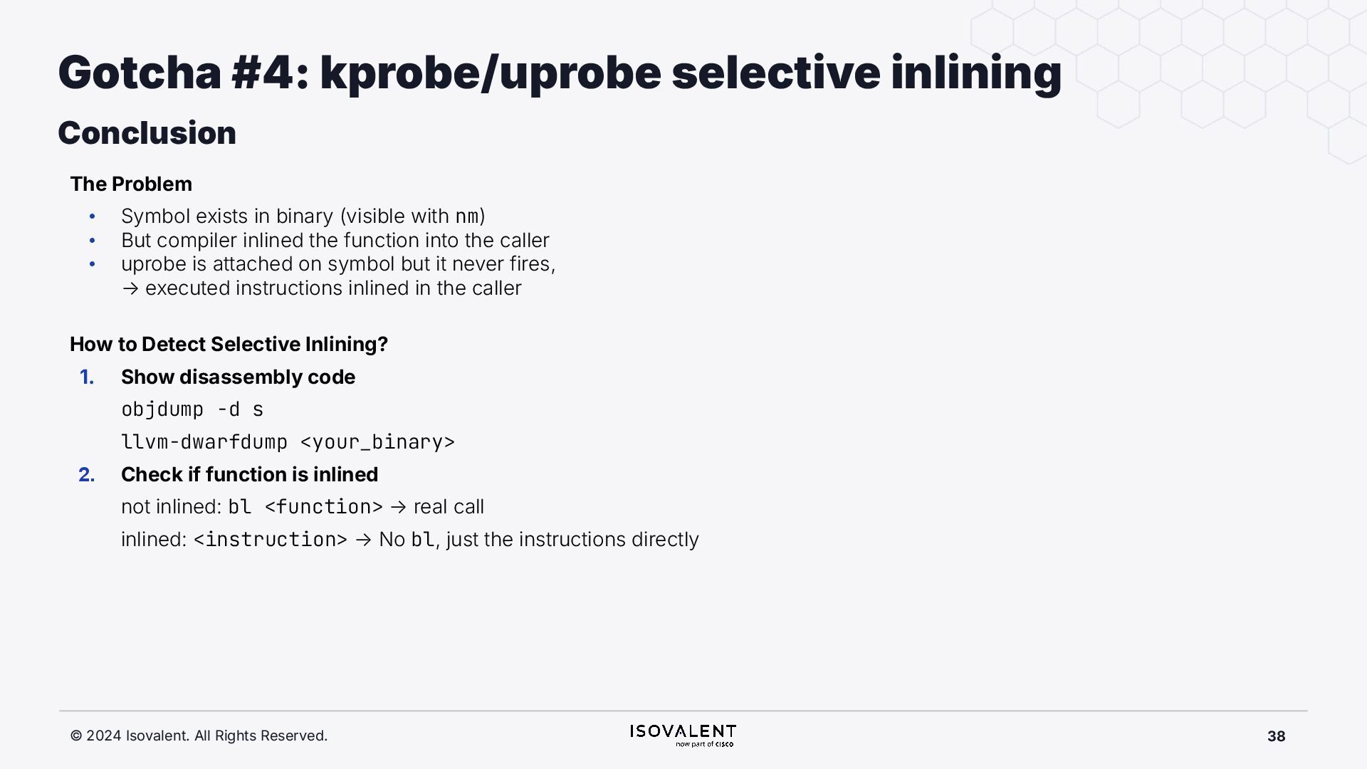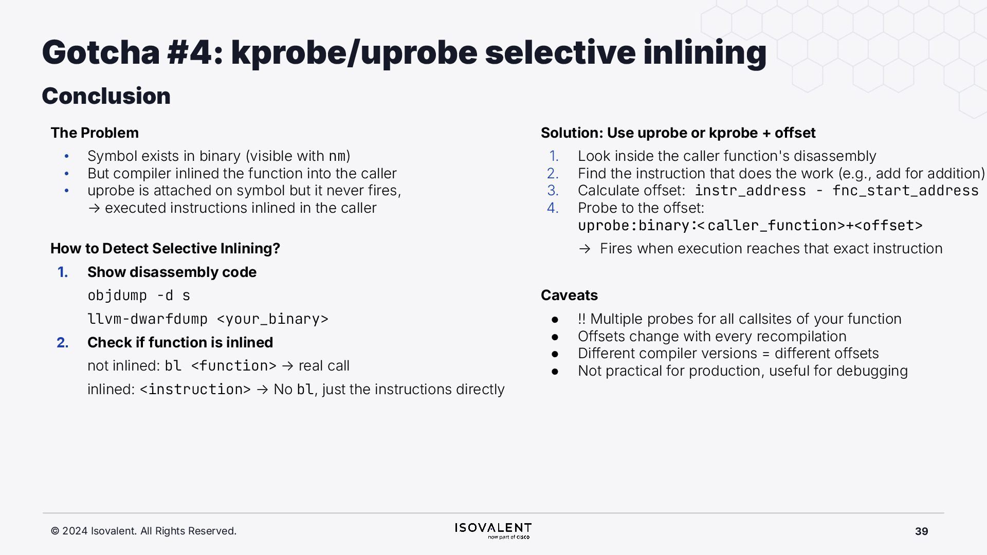 selective inlining Disassembled binary No optimisation # objdump -d -S .-disassemble=main ./target_O0 00000000000007f8 <main.: ./ ... int main(int argc, char *argv[]) { 7f8: a9bd7bfd stp x29, x30, [sp, #-48]! 7fc: 910003fd mov x29, sp 800: b9001fe0 str w0, [sp, #28] 804: f9000be1 str x1, [sp, #16] int x = atoi(argv[1]); 808: f9400be0 ldr x0, [sp, #16] 80c: 91002000 add x0, x0, #0x8 810: f9400000 ldr x0, [x0] 814: 97ffff8f bl 650 <atoi@plt> 818: b9002be0 str w0, [sp, #40] if (x < 5) { 81c: b9402be0 ldr w0, [sp, #40] ./ ... } int result = addf(x, 10); 840: 52800141 mov w1, #0xa 844: b9402be0 ldr w0, [sp, #40] 848: 97ffffe4 bl 7d8 <add> 84c: b9002fe0 str w0, [sp, #44] ./ ... Optimised # objdump -d -S .-disassemble=main ./target_O2 00000000000006c0 <main.: ./ ... int main(int argc, char *argv[]) { 6c0: aa0103e0 mov x0, x1 6c4: a9bf7bfd stp x29, x30, [sp, #-16]! ./ ... int x = atoi(argv[1]); if (x < 5) { 6e0: 7100101f cmp w0, #0x4 6e4: 5400012d b.le 708 <main+0x48> } ./ ... 6e8: 11002803 add w3, w0, #0xa 6ec: 90000001 adrp x1, 0 <._abi_tag-0x278> 6f0: 52800040 mov w0, #0x2 ./ #2 6f4: 91228021 add x1, x1, #0x8a0 6f8: 97ffffd6 bl 650 <._printf_chk@plt> int result = addf(x, 10); printf("addf(%d, 10) = %d\n", x, result); ./ ...