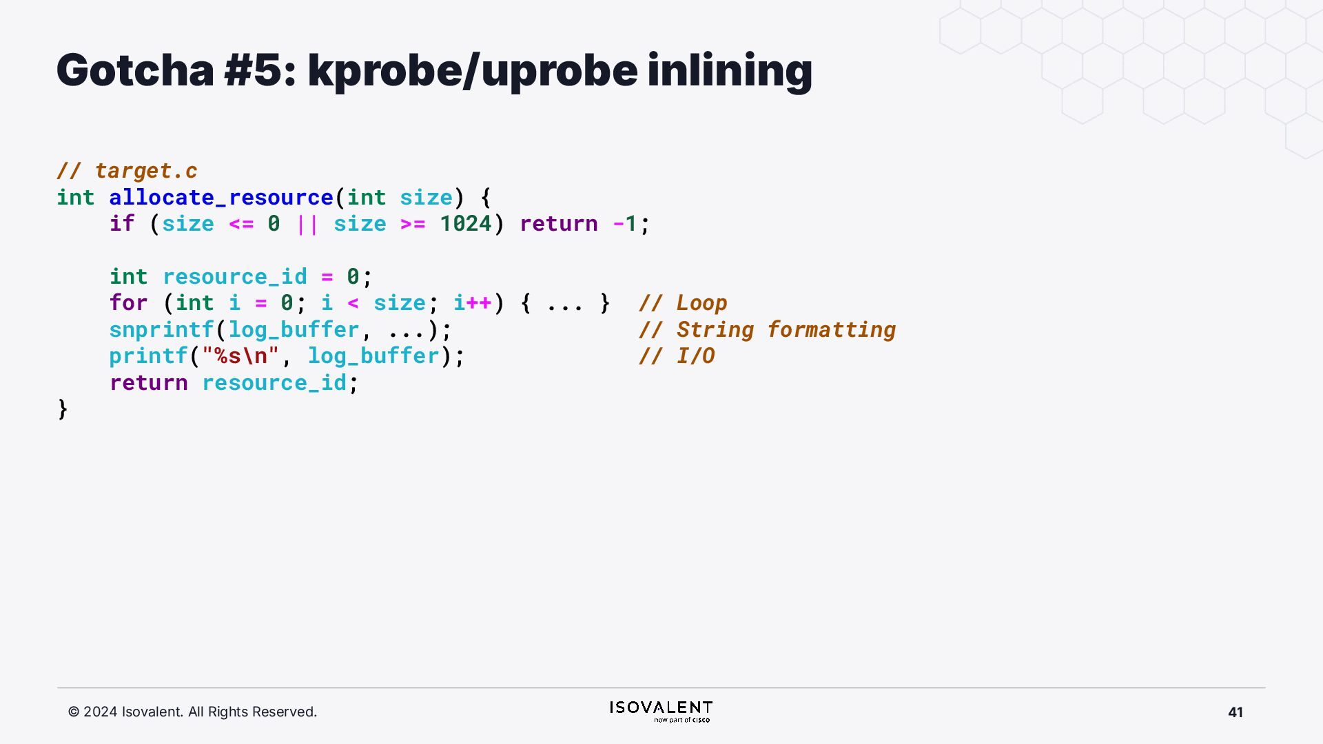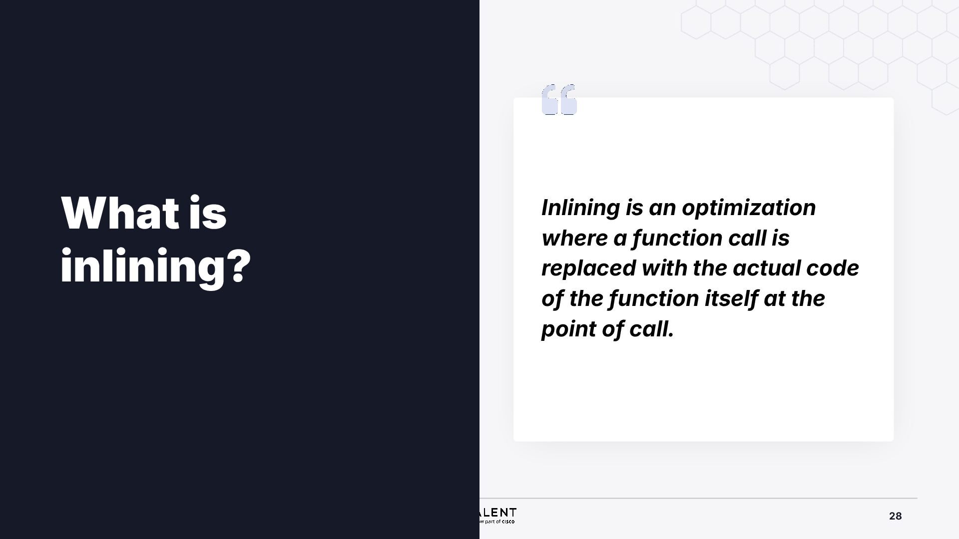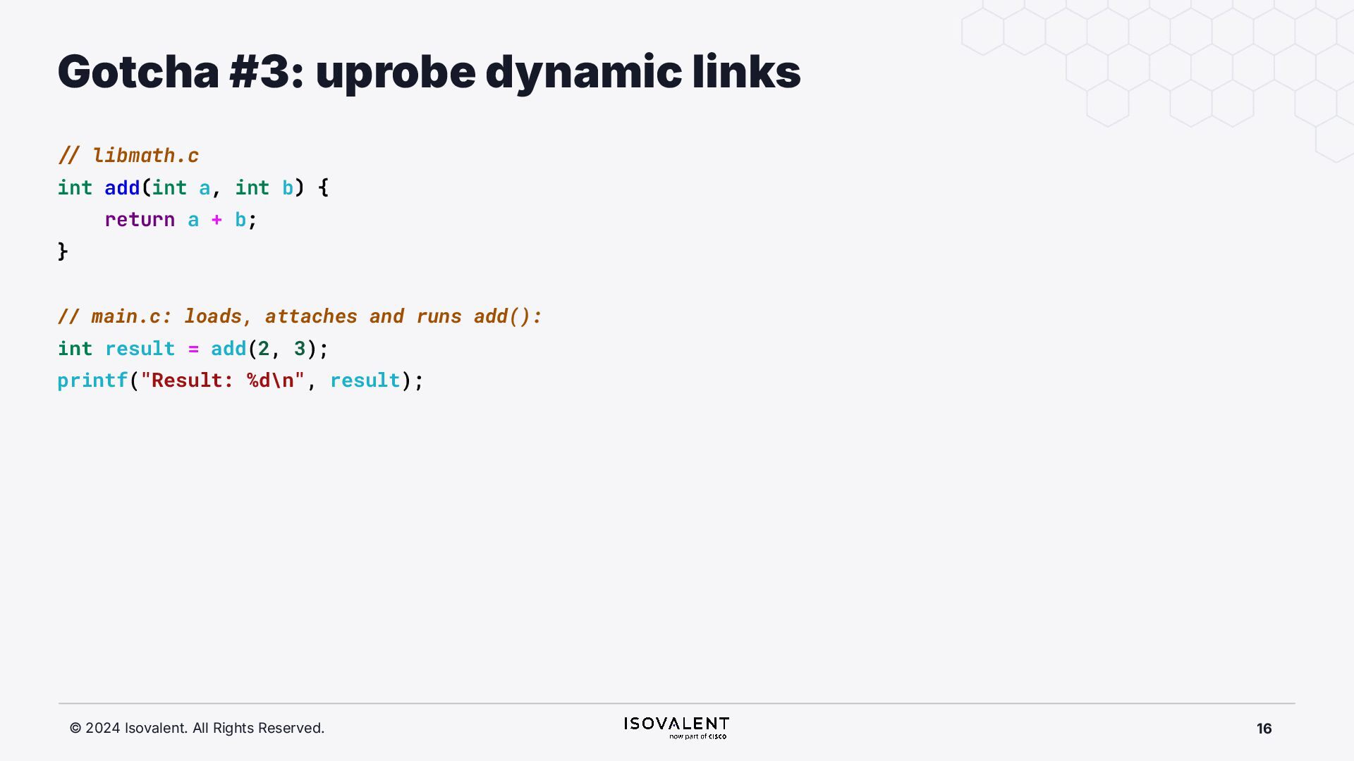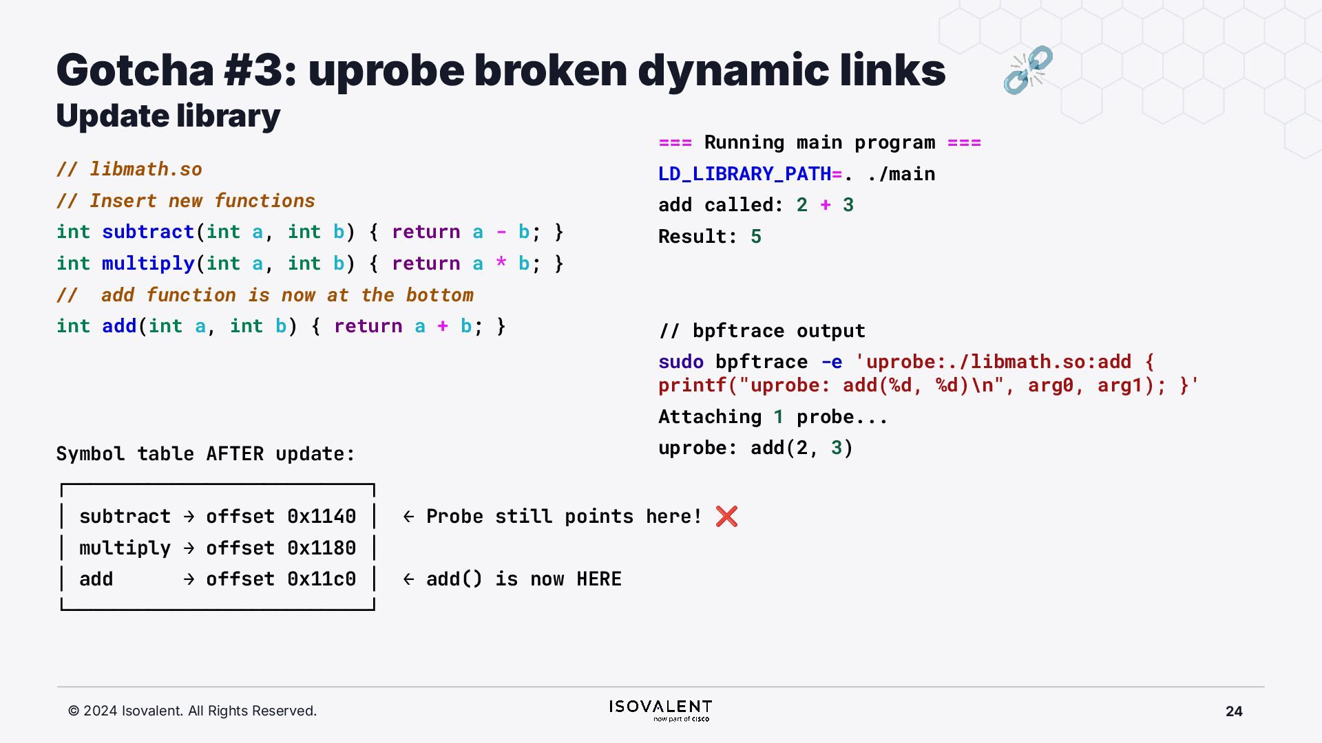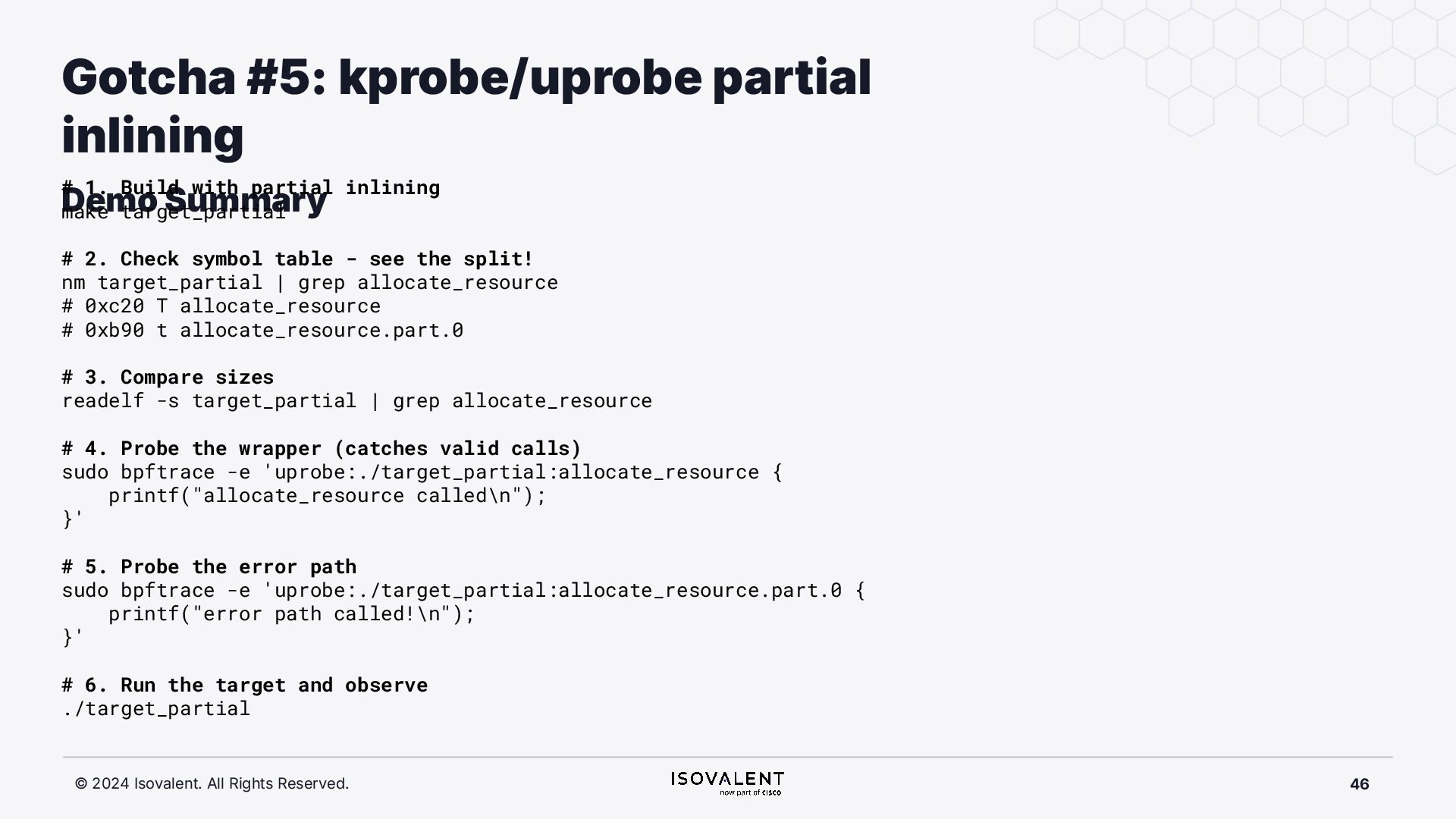 selective inlining Disassembled binary No optimisation # objdump -d -S .-disassemble=main ./target_O0 00000000000007f8 <main.: ./ ... int main(int argc, char *argv[]) { 7f8: a9bd7bfd stp x29, x30, [sp, #-48]! 7fc: 910003fd mov x29, sp 800: b9001fe0 str w0, [sp, #28] 804: f9000be1 str x1, [sp, #16] int x = atoi(argv[1]); 808: f9400be0 ldr x0, [sp, #16] 80c: 91002000 add x0, x0, #0x8 810: f9400000 ldr x0, [x0] 814: 97ffff8f bl 650 <atoi@plt> 818: b9002be0 str w0, [sp, #40] if (x < 5) { 81c: b9402be0 ldr w0, [sp, #40] ./ ... } int result = addf(x, 10); 840: 52800141 mov w1, #0xa 844: b9402be0 ldr w0, [sp, #40] 848: 97ffffe4 bl 7d8 <add> 84c: b9002fe0 str w0, [sp, #44] ./ ... Optimised # objdump -d -S .-disassemble=main ./target_O2 00000000000006c0 <main.: ./ ... int main(int argc, char *argv[]) { 6c0: aa0103e0 mov x0, x1 6c4: a9bf7bfd stp x29, x30, [sp, #-16]! ./ ... int x = atoi(argv[1]); if (x < 5) { 6e0: 7100101f cmp w0, #0x4 6e4: 5400012d b.le 708 <main+0x48> } ./ ... 6e8: 11002803 add w3, w0, #0xa 6ec: 90000001 adrp x1, 0 <._abi_tag-0x278> 6f0: 52800040 mov w0, #0x2 ./ #2 6f4: 91228021 add x1, x1, #0x8a0 6f8: 97ffffd6 bl 650 <._printf_chk@plt> int result = addf(x, 10); printf("addf(%d, 10) = %d\n", x, result); ./ ...