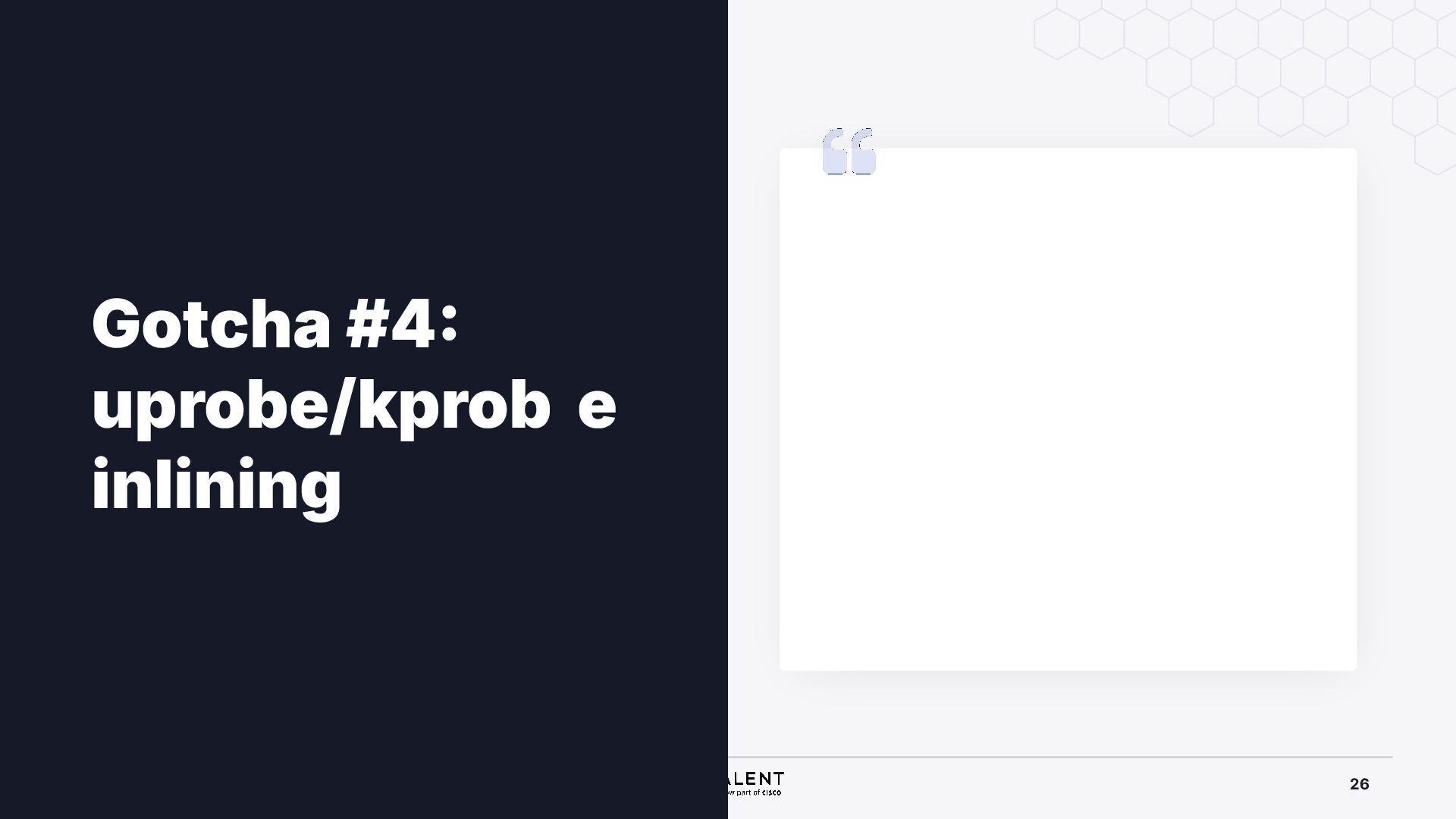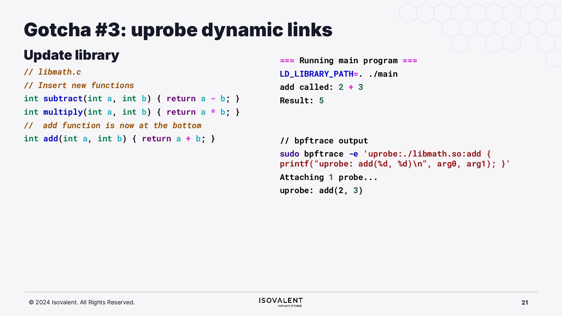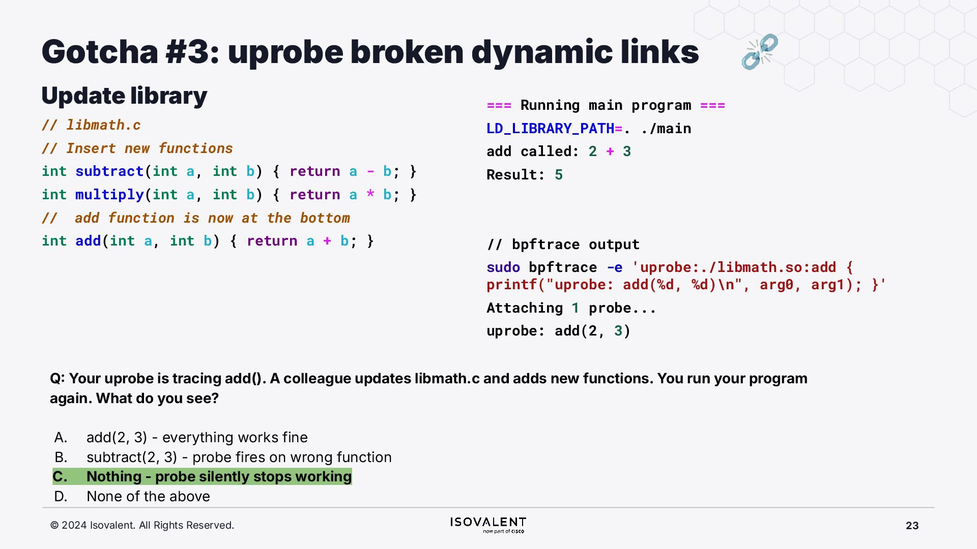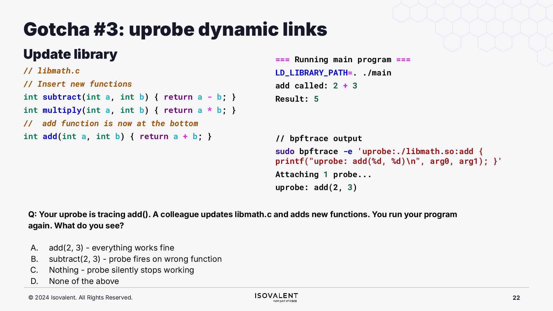 selective inlining Disassembled binary No optimisation # objdump -d -S .-disassemble=main ./target_O0 00000000000007f8 <main.: ./ ... int main(int argc, char *argv[]) { 7f8: a9bd7bfd stp x29, x30, [sp, #-48]! 7fc: 910003fd mov x29, sp 800: b9001fe0 str w0, [sp, #28] 804: f9000be1 str x1, [sp, #16] int x = atoi(argv[1]); 808: f9400be0 ldr x0, [sp, #16] 80c: 91002000 add x0, x0, #0x8 810: f9400000 ldr x0, [x0] 814: 97ffff8f bl 650 <atoi@plt> 818: b9002be0 str w0, [sp, #40] if (x < 5) { 81c: b9402be0 ldr w0, [sp, #40] ./ ... } int result = addf(x, 10); 840: 52800141 mov w1, #0xa 844: b9402be0 ldr w0, [sp, #40] 848: 97ffffe4 bl 7d8 <add> 84c: b9002fe0 str w0, [sp, #44] ./ ... Optimised # objdump -d -S .-disassemble=main ./target_O2 00000000000006c0 <main.: ./ ... int main(int argc, char *argv[]) { 6c0: aa0103e0 mov x0, x1 6c4: a9bf7bfd stp x29, x30, [sp, #-16]! ./ ... int x = atoi(argv[1]); if (x < 5) { 6e0: 7100101f cmp w0, #0x4 6e4: 5400012d b.le 708 <main+0x48> } ./ ... 6e8: 11002803 add w3, w0, #0xa 6ec: 90000001 adrp x1, 0 <._abi_tag-0x278> 6f0: 52800040 mov w0, #0x2 ./ #2 6f4: 91228021 add x1, x1, #0x8a0 6f8: 97ffffd6 bl 650 <._printf_chk@plt> int result = addf(x, 10); printf("addf(%d, 10) = %d\n", x, result); ./ ...