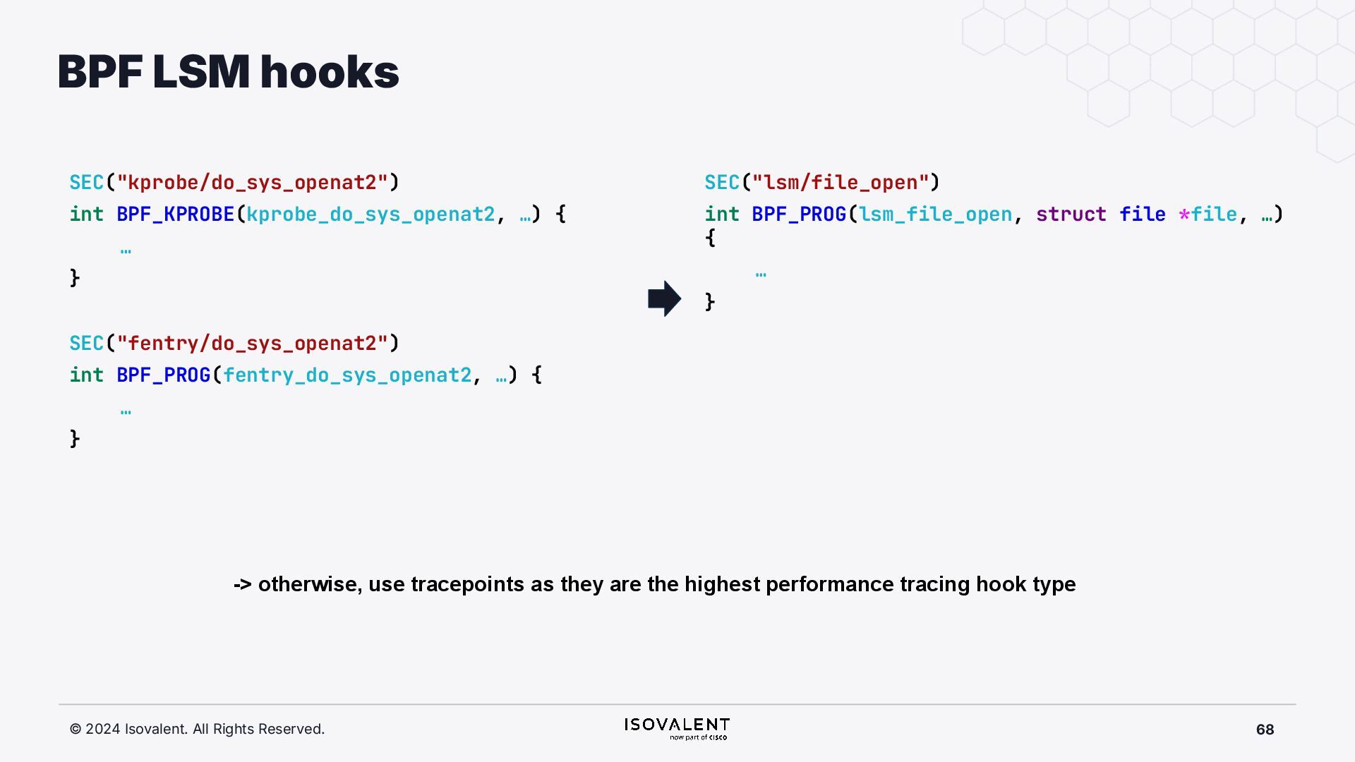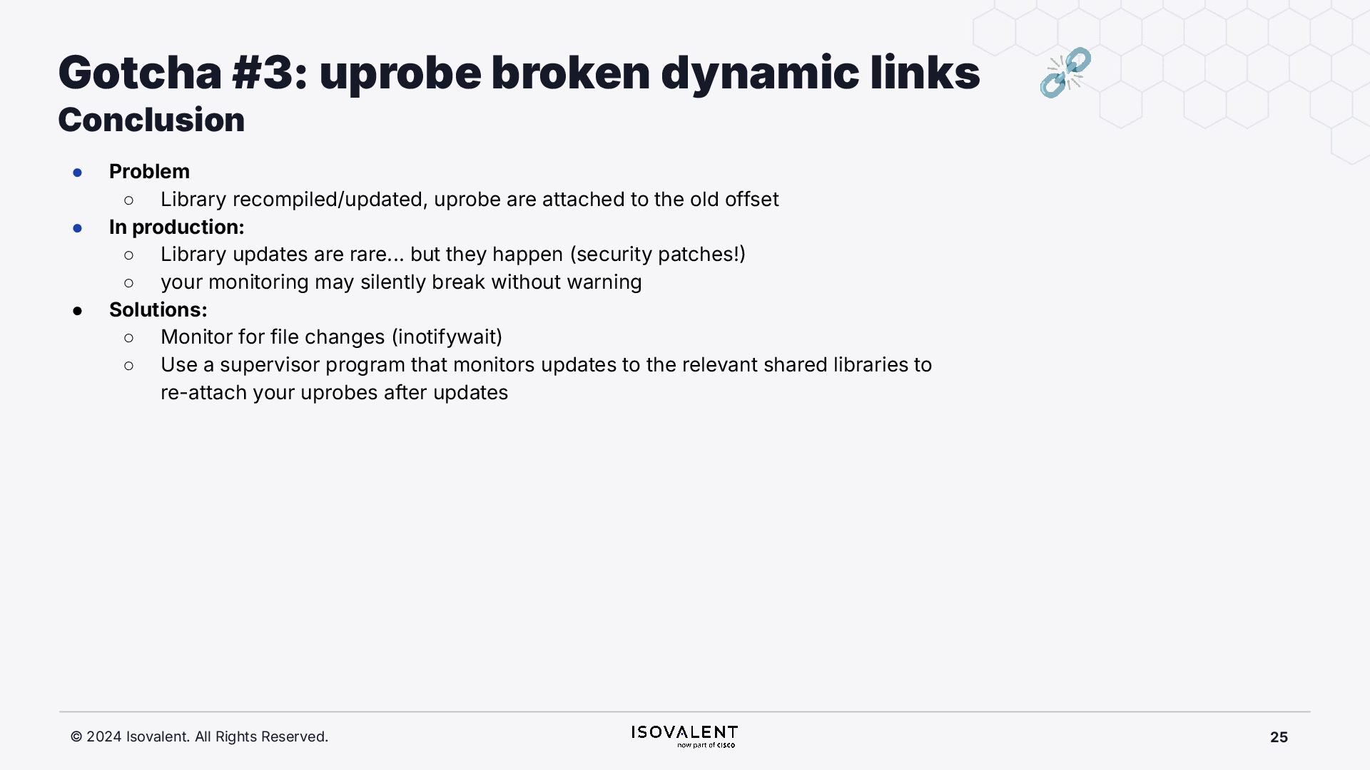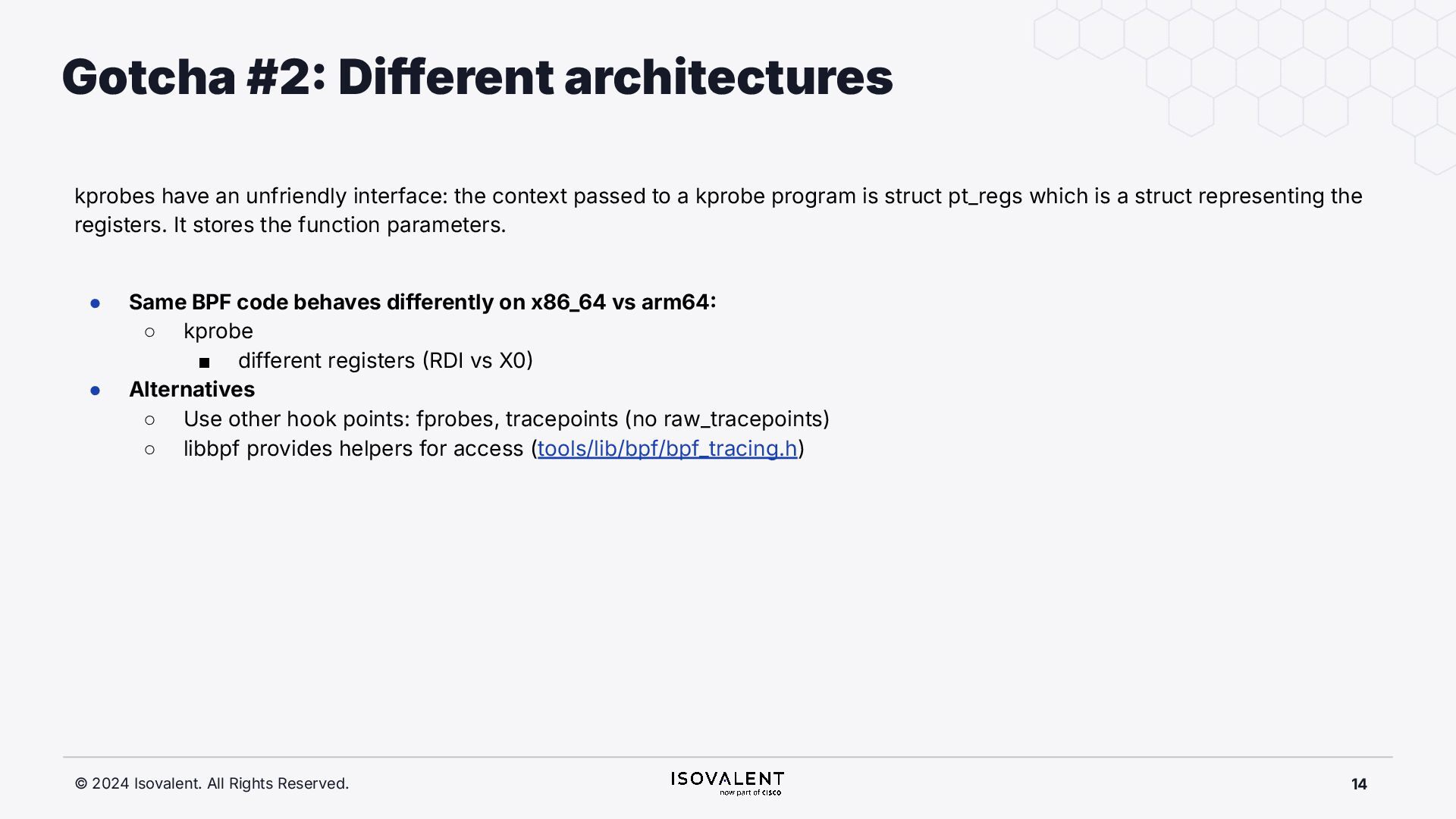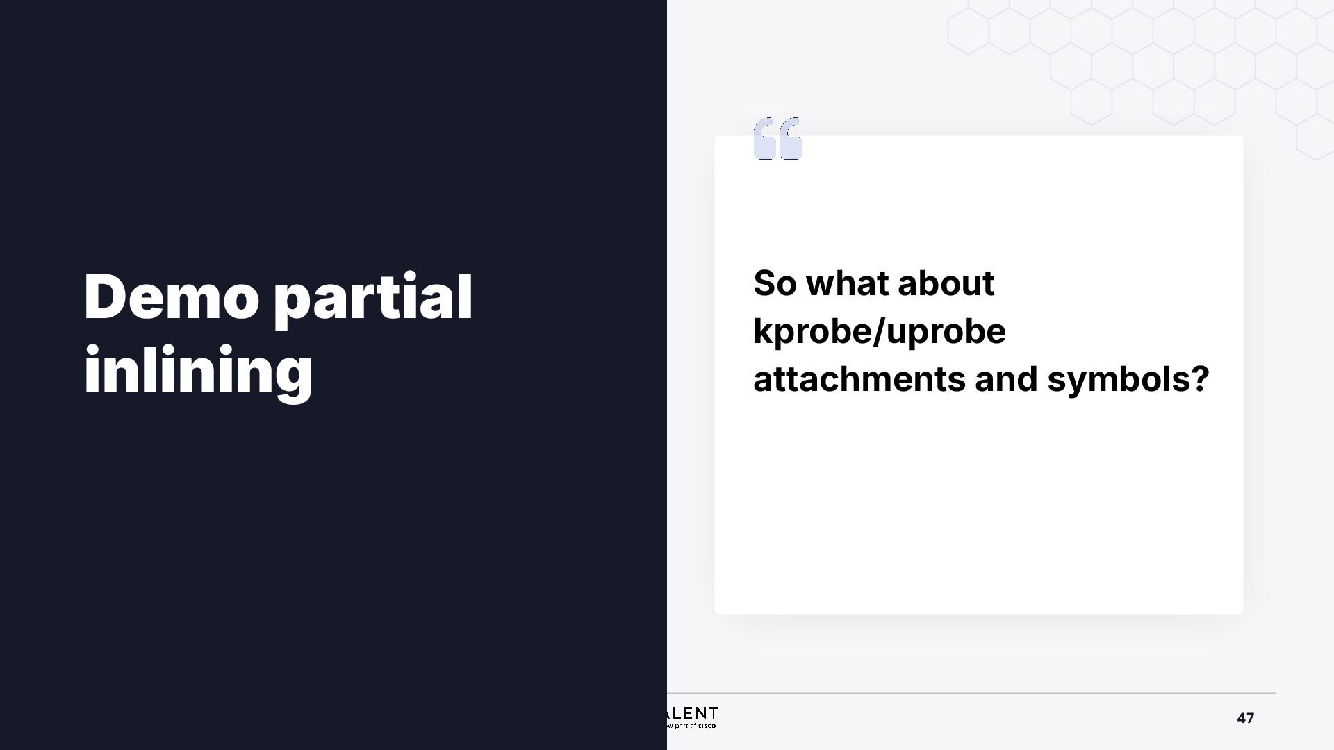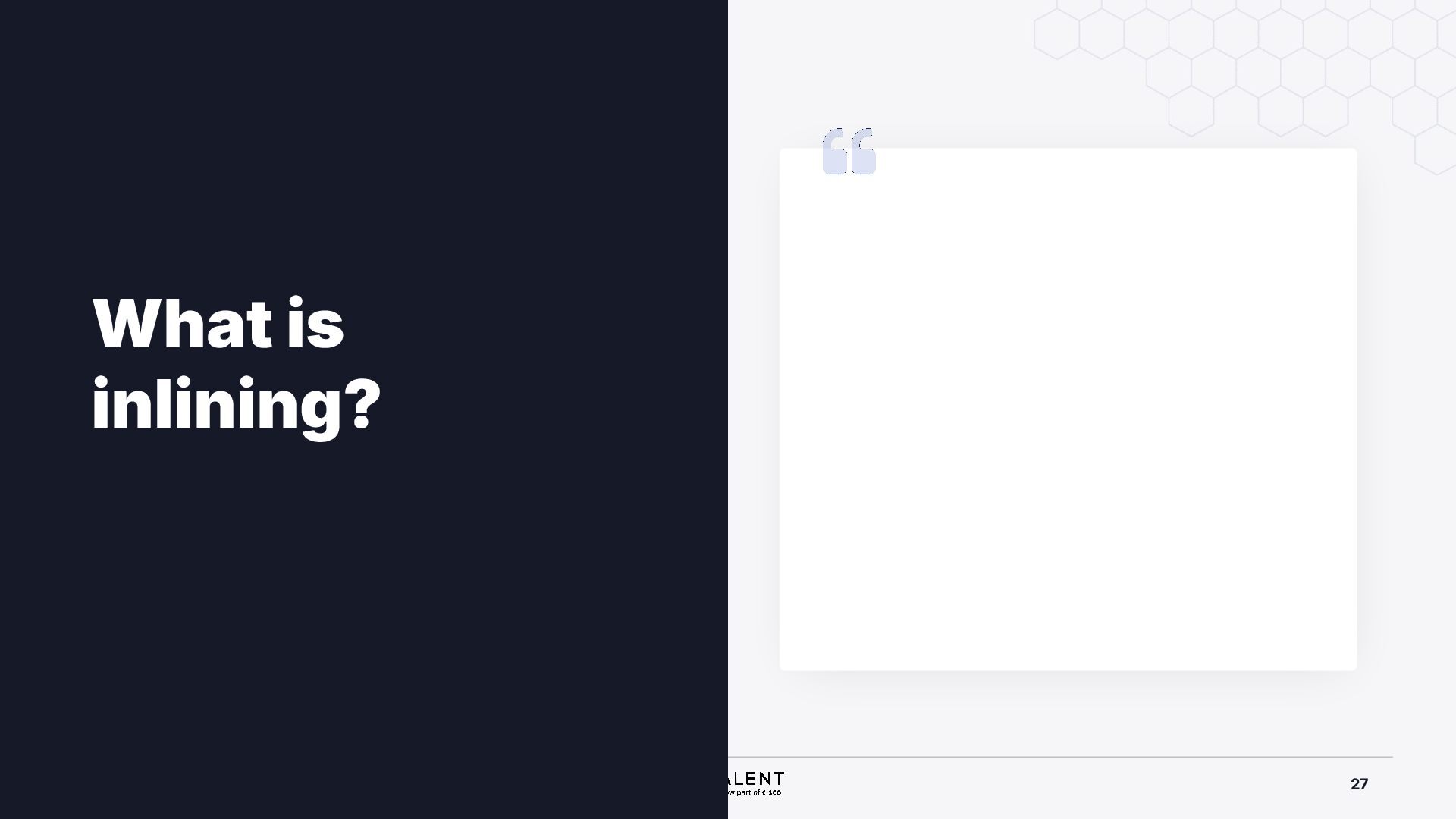 selective inlining Disassembled binary No optimisation # objdump -d -S .-disassemble=main ./target_O0 00000000000007f8 <main.: ./ ... int main(int argc, char *argv[]) { 7f8: a9bd7bfd stp x29, x30, [sp, #-48]! 7fc: 910003fd mov x29, sp 800: b9001fe0 str w0, [sp, #28] 804: f9000be1 str x1, [sp, #16] int x = atoi(argv[1]); 808: f9400be0 ldr x0, [sp, #16] 80c: 91002000 add x0, x0, #0x8 810: f9400000 ldr x0, [x0] 814: 97ffff8f bl 650 <atoi@plt> 818: b9002be0 str w0, [sp, #40] if (x < 5) { 81c: b9402be0 ldr w0, [sp, #40] ./ ... } int result = addf(x, 10); 840: 52800141 mov w1, #0xa 844: b9402be0 ldr w0, [sp, #40] 848: 97ffffe4 bl 7d8 <add> 84c: b9002fe0 str w0, [sp, #44] ./ ... Optimised # objdump -d -S .-disassemble=main ./target_O2 00000000000006c0 <main.: ./ ... int main(int argc, char *argv[]) { 6c0: aa0103e0 mov x0, x1 6c4: a9bf7bfd stp x29, x30, [sp, #-16]! ./ ... int x = atoi(argv[1]); if (x < 5) { 6e0: 7100101f cmp w0, #0x4 6e4: 5400012d b.le 708 <main+0x48> } ./ ... 6e8: 11002803 add w3, w0, #0xa 6ec: 90000001 adrp x1, 0 <._abi_tag-0x278> 6f0: 52800040 mov w0, #0x2 ./ #2 6f4: 91228021 add x1, x1, #0x8a0 6f8: 97ffffd6 bl 650 <._printf_chk@plt> int result = addf(x, 10); printf("addf(%d, 10) = %d\n", x, result); ./ ...