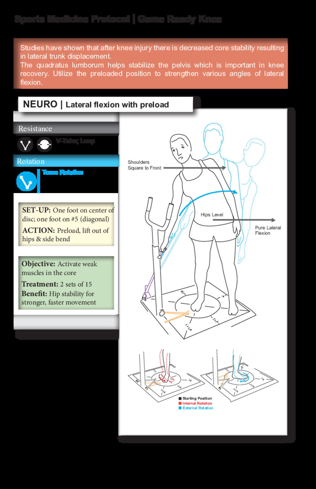 | Lateral flexion with preload Torso Rotation V-Tube; Loop Studies have shown that after knee injury there is decreased core stability resulting in lateral trunk displacement. The quadratus lumborum helps stabilize the pelvis which is important in knee recovery. Utilize the preloaded position to strengthen various angles of lateral flexion. SET-UP: One foot on center of disc; one foot on #5 (diagonal) ACTION: Preload, lift out of hips & side bend Objective: Activate weak muscles in the core Treatment: 2 sets of 15 Benefit: Hip stability for stronger, faster movement Shoulders Square to Front Hips Level Pure Lateral Flexion Starting Position Internal Rotation External Rotation