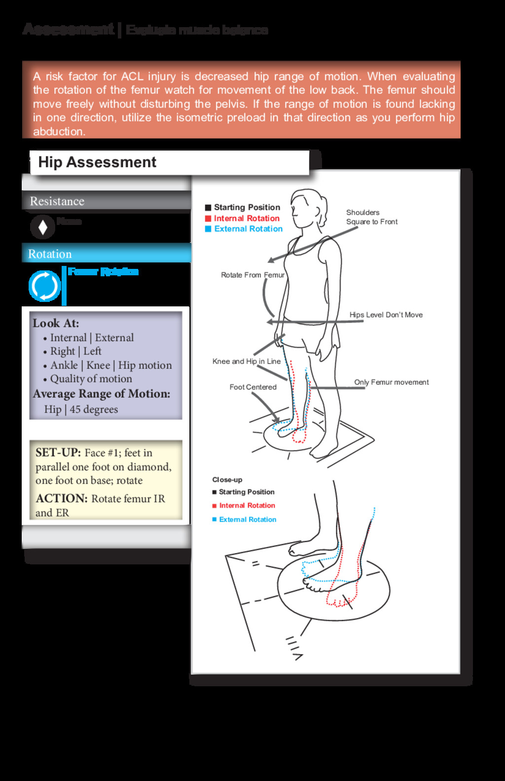 feet in parallel one foot on diamond, one foot on base; rotate ACTION: Rotate femur IR and ER Hip Assessment Femur Rotation None A risk factor for ACL injury is decreased hip range of motion. When evaluating the rotation of the femur watch for movement of the low back. The femur should move freely without disturbing the pelvis. If the range of motion is found lacking in one direction, utilize the isometric preload in that direction as you perform hip abduction. Look At: • Internal | External • Right | Left • Ankle | Knee | Hip motion • Quality of motion Average Range of Motion: Hip | 45 degrees Shoulders Square to Front Foot Centered Hips Level Don’t Move Only Femur movement Knee and Hip in Line Rotate From Femur Starting Position Internal Rotation External Rotation Internal Rotation Starting Position External Rotation Close-up