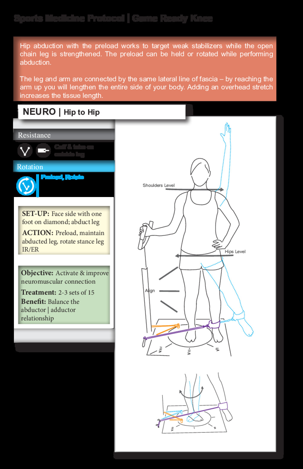 | Hip to Hip Preload, Rotate Cuff & tube on outside leg Hip abduction with the preload works to target weak stabilizers while the open chain leg is strengthened. The preload can be held or rotated while performing abduction. The leg and arm are connected by the same lateral line of fascia – by reaching the arm up you will lengthen the entire side of your body. Adding an overhead stretch increases the tissue length. SET-UP: Face side with one foot on diamond; abduct leg ACTION: Preload, maintain abducted leg, rotate stance leg IR/ER Objective: Activate & improve neuromuscular connection Treatment: 2-3 sets of 15 Benefit: Balance the abductor | adductor relationship Shoulders Level Hips Level Align