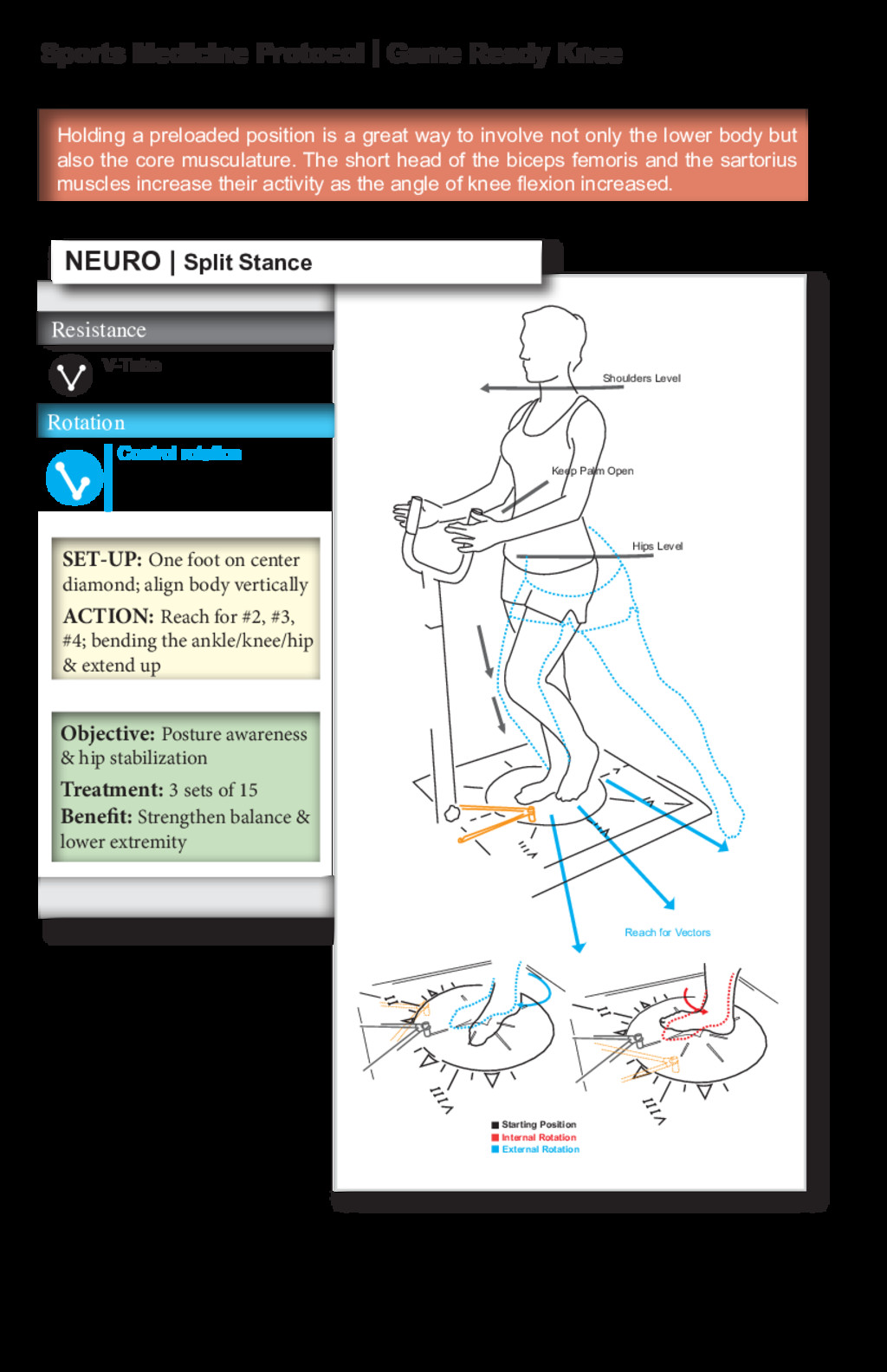 | Split Stance Control rotation V-Tube Holding a preloaded position is a great way to involve not only the lower body but also the core musculature. The short head of the biceps femoris and the sartorius muscles increase their activity as the angle of knee flexion increased. SET-UP: One foot on center diamond; align body vertically ACTION: Reach for #2, #3, #4; bending the ankle/knee/hip & extend up Objective: Posture awareness & hip stabilization Treatment: 3 sets of 15 Benefit: Strengthen balance & lower extremity Reach for Vectors Hips Level Shoulders Level Keep Palm Open Starting Position Internal Rotation External Rotation