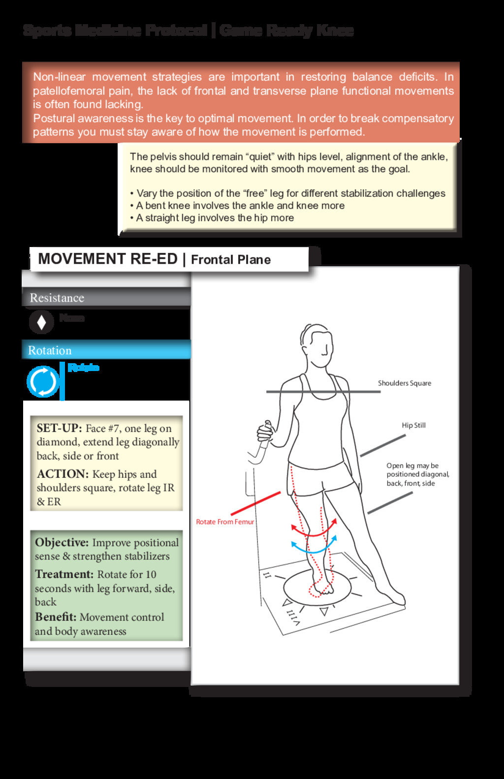 remain “quiet” with hips level, alignment of the ankle, knee should be monitored with smooth movement as the goal. • Vary the position of the “free” leg for different stabilization challenges • A bent knee involves the ankle and knee more • A straight leg involves the hip more Resistance Rotation MOVEMENT RE-ED | Frontal Plane Rotate None Non-linear movement strategies are important in restoring balance deficits. In patellofemoral pain, the lack of frontal and transverse plane functional movements is often found lacking. Postural awareness is the key to optimal movement. In order to break compensatory patterns you must stay aware of how the movement is performed. SET-UP: Face #7, one leg on diamond, extend leg diagonally back, side or front ACTION: Keep hips and shoulders square, rotate leg IR & ER Objective: Improve positional sense & strengthen stabilizers Treatment: Rotate for 10 seconds with leg forward, side, back Benefit: Movement control and body awareness Shoulders Square Hip Still Open leg may be positioned diagonal, back, front, side Rotate From Femur