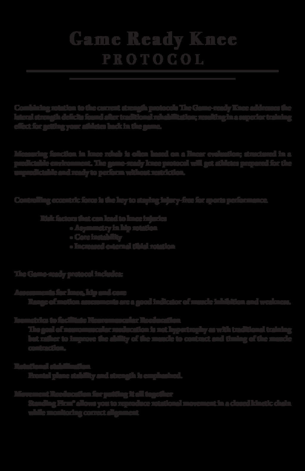 L Combining rotation to the current strength protocols The Game-ready Knee addresses the lateral strength deficits found after traditional rehabilitation; resulting in a superior training effect for getting your athletes back in the game. Measuring function in knee rehab is often based on a linear evaluation; structured in a predictable environment. The game-ready knee protocol will get athletes prepared for the unpredictable and ready to perform without restriction. Controlling eccentric force is the key to staying injury-free for sports performance. Risk factors that can lead to knee injuries • Asymmetry in hip rotation • Core instability • Increased external tibial rotation The Game-ready protocol includes: Assessments for knee, hip and core Range of motion assessments are a good indicator of muscle inhibition and weakness. Isometrics to facilitate Neuromuscular Reeducation The goal of neuromuscular reeducation is not hypertrophy as with traditional training but rather to improve the ability of the muscle to contract and timing of the muscle contraction. Rotational stabilization Frontal plane stability and strength is emphasized. Movement Reeducation for putting it all together Standing Firm® allows you to reproduce rotational movement in a closed kinetic chain while monitoring correct alignment