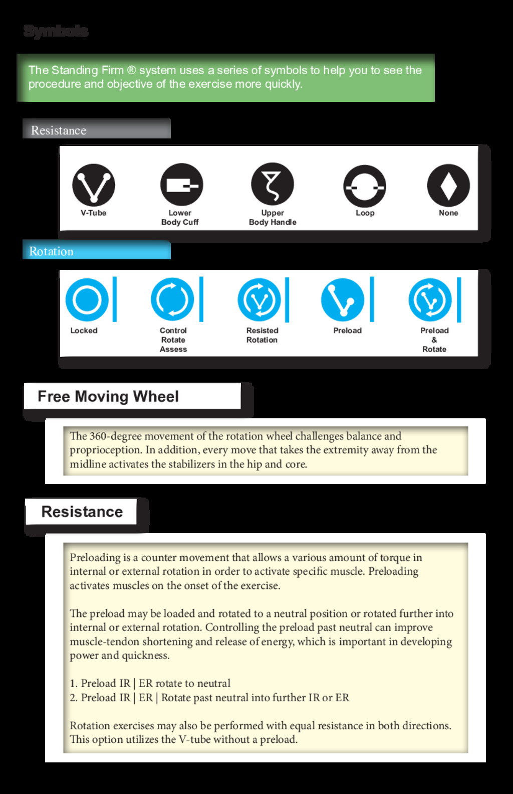 symbols to help you to see the procedure and objective of the exercise more quickly. The 360-degree movement of the rotation wheel challenges balance and proprioception. In addition, every move that takes the extremity away from the midline activates the stabilizers in the hip and core. Preloading is a counter movement that allows a various amount of torque in internal or external rotation in order to activate specific muscle. Preloading activates muscles on the onset of the exercise. The preload may be loaded and rotated to a neutral position or rotated further into internal or external rotation. Controlling the preload past neutral can improve muscle-tendon shortening and release of energy, which is important in developing power and quickness. 1. Preload IR | ER rotate to neutral 2. Preload IR | ER | Rotate past neutral into further IR or ER Rotation exercises may also be performed with equal resistance in both directions. This option utilizes the V-tube without a preload. Rotation Resistance Free Moving Wheel Resistance V-Tube Lower Body Cuff Upper Body Handle Loop None Locked Preload Preload & Rotate Resisted Rotation Control Rotate Assess