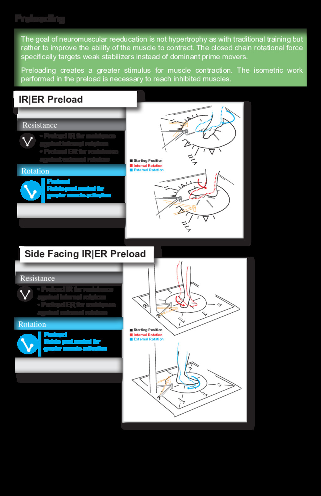 with traditional training but rather to improve the ability of the muscle to contract. The closed chain rotational force specifically targets weak stabilizers instead of dominant prime movers. Preloading creates a greater stimulus for muscle contraction. The isometric work performed in the preload is necessary to reach inhibited muscles. IR|ER Preload Resistance • Preload IR for resistance against internal rotators • Preload ER for resistance against external rotators Resistance • Preload IR for resistance against internal rotators • Preload ER for resistance against external rotators Starting Position Internal Rotation External Rotation Side Facing IR|ER Preload Rotation Preload Rotate past neutral for greater muscle activation Starting Position Internal Rotation External Rotation Rotation Preload Rotate past neutral for greater muscle activation