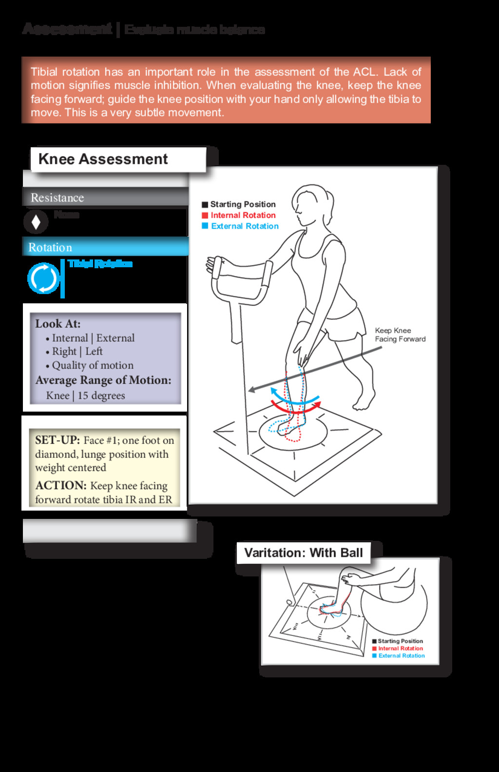 | Left • Quality of motion Average Range of Motion: Knee | 15 degrees Tibial rotation has an important role in the assessment of the ACL. Lack of motion signifies muscle inhibition. When evaluating the knee, keep the knee facing forward; guide the knee position with your hand only allowing the tibia to move. This is a very subtle movement. SET-UP: Face #1; one foot on diamond, lunge position with weight centered ACTION: Keep knee facing forward rotate tibia IR and ER Assessment | Evaluate muscle balance Tibial Rotation Rotation Keep Knee Facing Forward Starting Position Internal Rotation External Rotation Knee Assessment Starting Position Internal Rotation External Rotation Varitation: With Ball