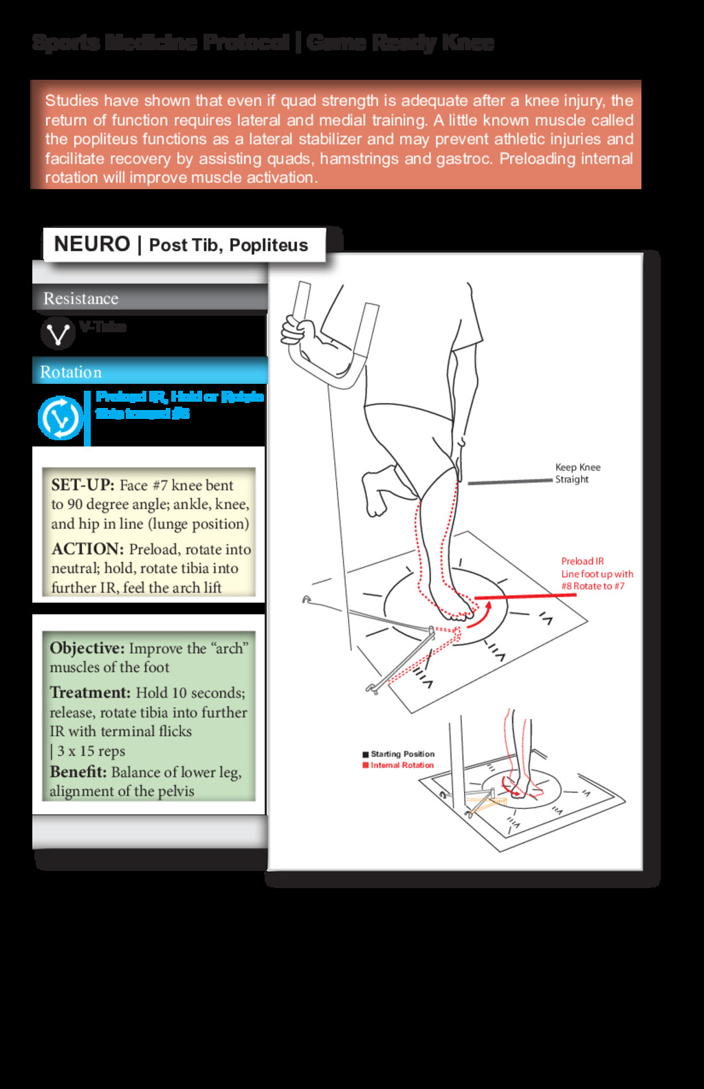 Face #7 knee bent to 90 degree angle; ankle, knee, and hip in line (lunge position) ACTION: Preload, rotate into neutral; hold, rotate tibia into further IR, feel the arch lift Objective: Improve the “arch” muscles of the foot Treatment: Hold 10 seconds; release, rotate tibia into further IR with terminal flicks | 3 x 15 reps Benefit: Balance of lower leg, alignment of the pelvis NEURO | Post Tib, Popliteus Preload IR, Hold or Rotate tibia toward #6 V-Tube Studies have shown that even if quad strength is adequate after a knee injury, the return of function requires lateral and medial training. A little known muscle called the popliteus functions as a lateral stabilizer and may prevent athletic injuries and facilitate recovery by assisting quads, hamstrings and gastroc. Preloading internal rotation will improve muscle activation. Keep Knee Straight Preload IR Line foot up with #8 Rotate to #7 Starting Position Internal Rotation