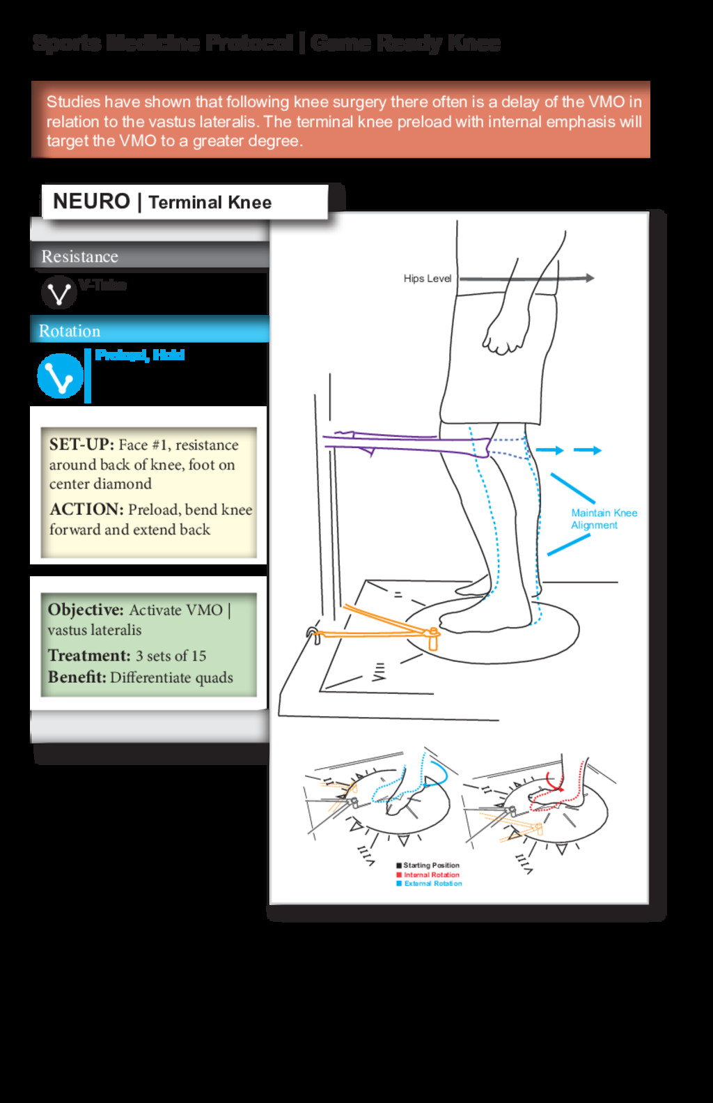 Face #1, resistance around back of knee, foot on center diamond ACTION: Preload, bend knee forward and extend back Objective: Activate VMO | vastus lateralis Treatment: 3 sets of 15 Benefit: Differentiate quads NEURO | Terminal Knee Preload, Hold V-Tube Studies have shown that following knee surgery there often is a delay of the VMO in relation to the vastus lateralis. The terminal knee preload with internal emphasis will target the VMO to a greater degree. Hips Level Maintain Knee Alignment Starting Position Internal Rotation External Rotation