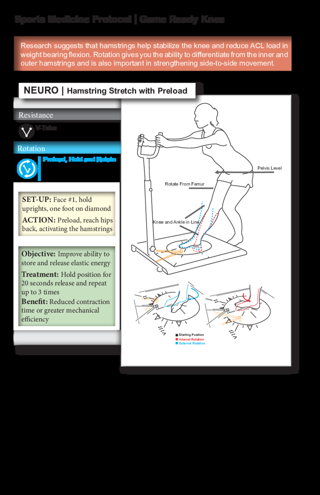 Face #1, hold uprights, one foot on diamond ACTION: Preload, reach hips back, activating the hamstrings Objective: Improve ability to store and release elastic energy Treatment: Hold position for 20 seconds release and repeat up to 3 times Benefit: Reduced contraction time or greater mechanical efficiency NEURO | Hamstring Stretch with Preload Preload, Hold and Rotate V-Tube Research suggests that hamstrings help stabilize the knee and reduce ACL load in weight bearing flexion. Rotation gives you the ability to differentiate from the inner and outer hamstrings and is also important in strengthening side-to-side movement. Pelvis Level Rotate From Femur Knee and Ankle in Line Starting Position Internal Rotation External Rotation