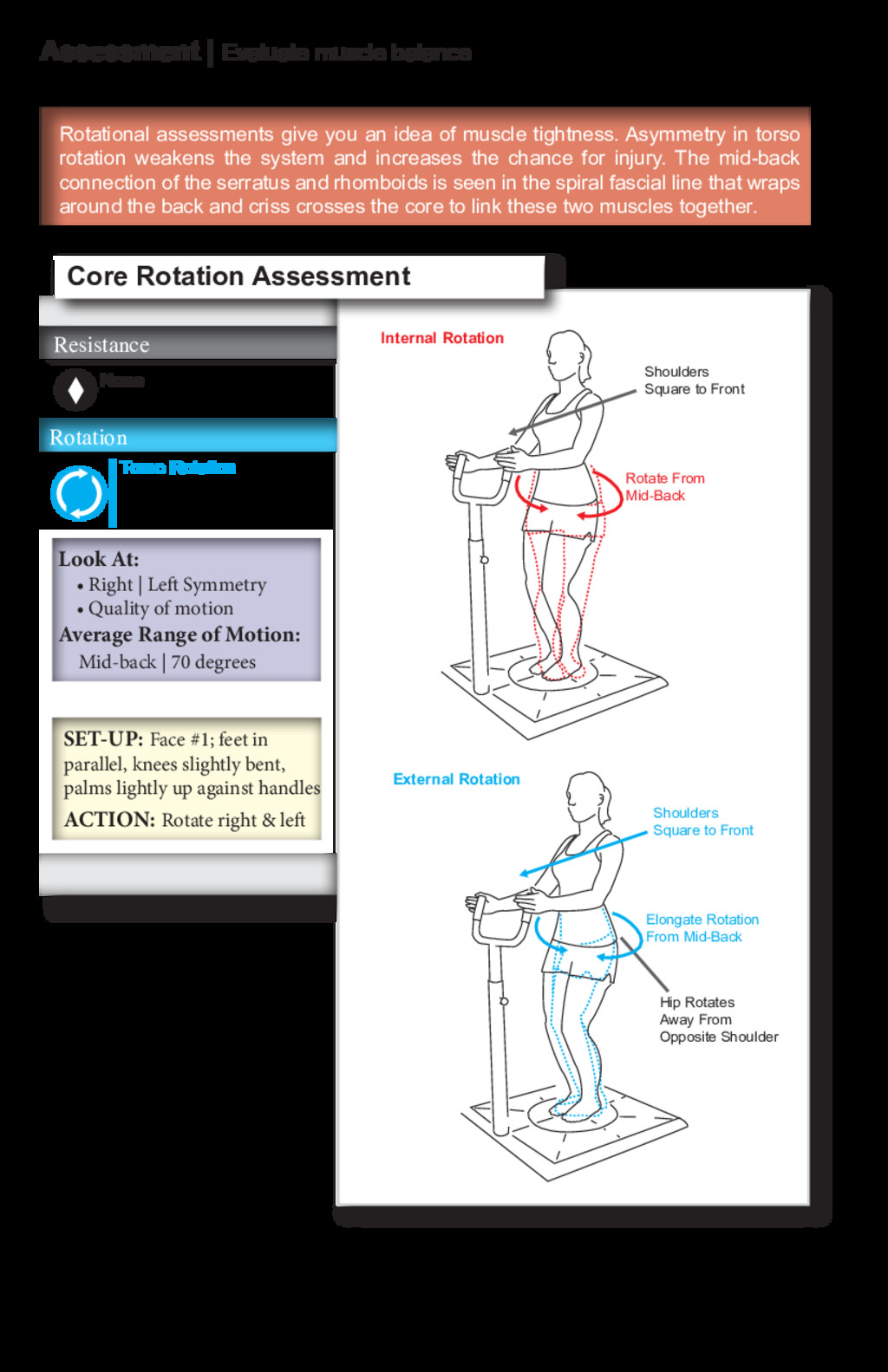 feet in parallel, knees slightly bent, palms lightly up against handles ACTION: Rotate right & left Core Rotation Assessment Torso Rotation None Rotational assessments give you an idea of muscle tightness. Asymmetry in torso rotation weakens the system and increases the chance for injury. The mid-back connection of the serratus and rhomboids is seen in the spiral fascial line that wraps around the back and criss crosses the core to link these two muscles together. Look At: • Right | Left Symmetry • Quality of motion Average Range of Motion: Mid-back | 70 degrees Internal Rotation External Rotation Rotate From Mid-Back Elongate Rotation From Mid-Back Hip Rotates Away From Opposite Shoulder Shoulders Square to Front Shoulders Square to Front