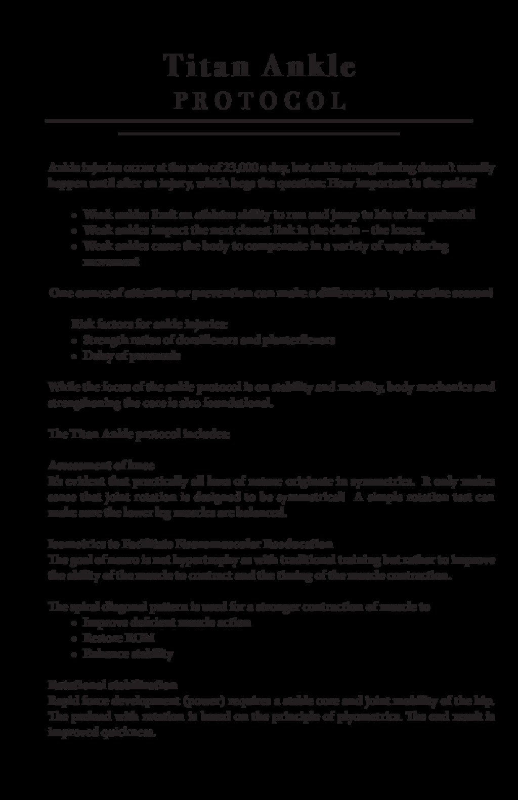 Ankle injuries occur at the rate of 23,000 a day, but ankle strengthening doesn’t usually happen until a er an injury, which begs the question: How important is the ankle? t 8FBLBOLMFTMJNJUBOBUIMFUFTBCJMJUZUPSVOBOEKVNQUPIJTPSIFSQPUFOUJBM t 8FBLBOLMFTJNQBDUUIFOFYUDMPTFTUMJOLJOUIFDIBJOoUIFLOFFT t 8FBLBOLMFTDBVTFUIFCPEZUPDPNQFOTBUFJOBWBSJFUZPGXBZTEVSJOH NPWFNFOU One ounce of attention or prevention can make a di erence in your entire season! Risk factors for ankle injuries: t 4USFOHUISBUJPTPGEPSTJĘFYPSTBOEQMBOUFSĘFYPST t%FMBZPGQFSPOFBMT 8IJMFUIFGPDVTPGUIFBOLMFQSPUPDPMJTPOTUBCJMJUZBOENPCJMJUZ CPEZNFDIBOJDTBOE TUSFOHUIFOJOHUIFDPSFJTBMTPGPVOEBUJPOBM e Titan Ankle protocol includes: Assessment of knee *UTFWJEFOUUIBUQSBDUJDBMMZBMMMBXTPGOBUVSFPSJHJOBUFJOTZNNFUSJFT*UPOMZNBLFT sense that joint rotation is designed to be symmetrical! A simple rotation test can NBLFTVSFUIFMPXFSMFHNVTDMFTBSFCBMBODFE Isometrics to Facilitate Neuromuscular Reeducation ćFHPBMPGOFVSPJTOPUIZQFSUSPQIZBTXJUIUSBEJUJPOBMUSBJOJOHCVUSBUIFSUPJNQSPWF UIFBCJMJUZPGUIFNVTDMFUPDPOUSBDUBOEUIFUJNJOHPGUIFNVTDMFDPOUSBDUJPO e spiral diagonal pattern is used for a stronger contraction of muscle to t *NQSPWFEFĕDJFOUNVTDMFBDUJPO t 3FTUPSF30. t &OIBODFTUBCJMJUZ Rotational stabilization 3BQJEGPSDFEFWFMPQNFOU QPXFS SFRVJSFTBTUBCMFDPSFBOEKPJOUNPCJMJUZPGUIFIJQ ćFQSFMPBEXJUISPUBUJPOJTCBTFEPOUIFQSJODJQMFPGQMZPNFUSJDTćFFOESFTVMUJT JNQSPWFERVJDLOFTT