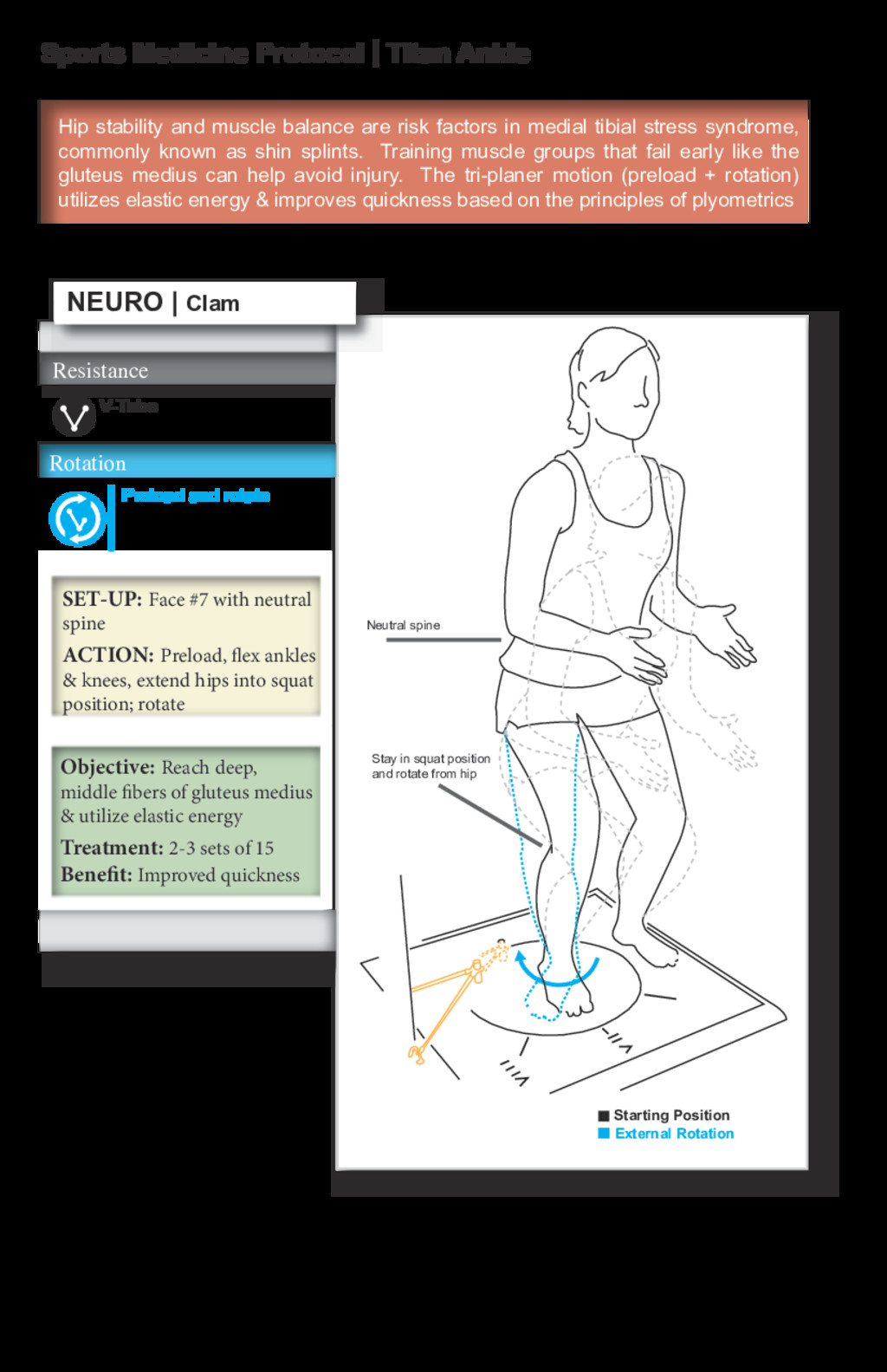 Reach deep, NJEEMFĕCFSTPGHMVUFVTNFEJVT VUJMJ[FFMBTUJDFOFSHZ Treatment: TFUTPG Bene t: *NQSPWFERVJDLOFTT Resistance Rotation SET-UP: Face #7 with neutral spine ACTION: 1SFMPBE ĘFYBOLMFT LOFFT FYUFOEIJQTJOUPTRVBU position; rotate NEURO | Clam V-Tube +LSVWDELOLW\DQGPXVFOHEDODQFHDUHULVNIDFWRUVLQPHGLDOWLELDOVWUHVVV\QGURPH commonly known as shin splints. Training muscle groups that fail early like the gluteus medius can help avoid injury. The tri-planer motion (preload + rotation) XWLOL]HVHODVWLFHQHUJ\ LPSURYHVTXLFNQHVVEDVHGRQWKHSULQFLSOHVRISO\RPHWULFV Starting Position External Rotation Stay in squat position and rotate from hip Neutral spine