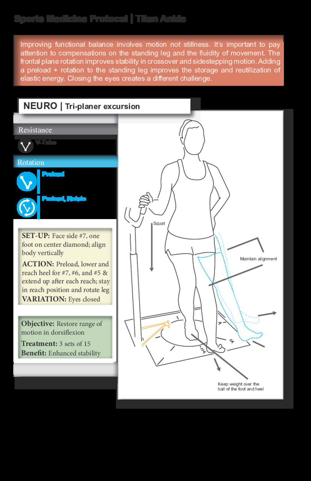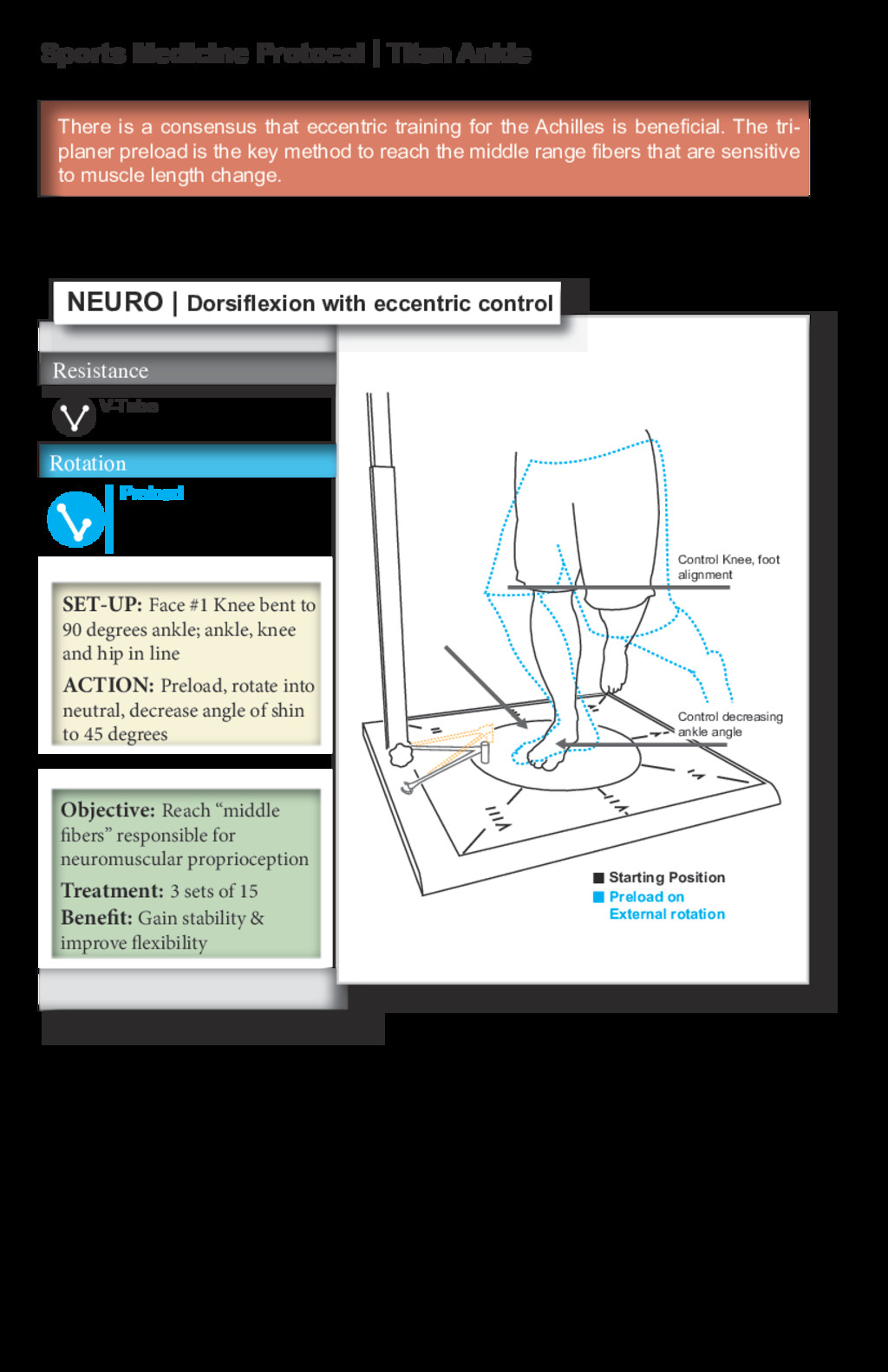 #1 Knee bent to 90 degrees ankle; ankle, knee and hip in line ACTION: Preload, rotate into neutral, decrease angle of shin UPEFHSFFT Objective: 3FBDIiNJEEMF ĕCFSTwSFTQPOTJCMFGPS neuromuscular proprioception Treatment: TFUTPG Bene t: Gain stability & JNQSPWFĘFYJCJMJUZ NEURO | 'RUVLÀH[LRQZLWKHFFHQWULFFRQWURO Preload V-Tube 7KHUHLVDFRQVHQVXVWKDWHFFHQWULFWUDLQLQJIRUWKH$FKLOOHVLVEHQH¿FLDO7KHWUL SODQHUSUHORDGLVWKHNH\PHWKRGWRUHDFKWKHPLGGOHUDQJH¿EHUVWKDWDUHVHQVLWLYH to muscle length change. Control Knee, foot alignment Starting Position Preload on External rotation Control decreasing ankle angle