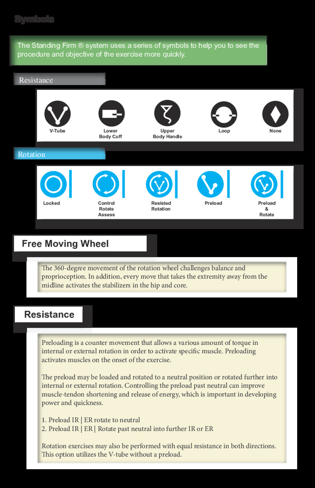 symbols to help you to see the procedure and objective of the exercise more quickly. ćFEFHSFFNPWFNFOUPGUIFSPUBUJPOXIFFMDIBMMFOHFTCBMBODFBOE QSPQSJPDFQUJPO*OBEEJUJPO FWFSZNPWFUIBUUBLFTUIFFYUSFNJUZBXBZGSPNUIF NJEMJOFBDUJWBUFTUIFTUBCJMJ[FSTJOUIFIJQBOEDPSF 1SFMPBEJOHJTBDPVOUFSNPWFNFOUUIBUBMMPXTBWBSJPVTBNPVOUPGUPSRVFJO JOUFSOBMPSFYUFSOBMSPUBUJPOJOPSEFSUPBDUJWBUFTQFDJĕDNVTDMF1SFMPBEJOH BDUJWBUFTNVTDMFTPOUIFPOTFUPGUIFFYFSDJTF e preload may be loaded and rotated to a neutral position or rotated further into JOUFSOBMPSFYUFSOBMSPUBUJPO$POUSPMMJOHUIFQSFMPBEQBTUOFVUSBMDBOJNQSPWF NVTDMFUFOEPOTIPSUFOJOHBOESFMFBTFPGFOFSHZ XIJDIJTJNQPSUBOUJOEFWFMPQJOH QPXFSBOERVJDLOFTT 1SFMPBE*3]&3SPUBUFUPOFVUSBM 1SFMPBE*3]&3]3PUBUFQBTUOFVUSBMJOUPGVSUIFS*3PS&3 3PUBUJPOFYFSDJTFTNBZBMTPCFQFSGPSNFEXJUIFRVBMSFTJTUBODFJOCPUIEJSFDUJPOT ćJTPQUJPOVUJMJ[FTUIF7UVCFXJUIPVUBQSFMPBE Rotation Resistance Free Moving Wheel Resistance V-Tube Lower Body Cuff Upper Body Handle Loop None Locked Preload Preload & Rotate Resisted Rotation Control Rotate Assess