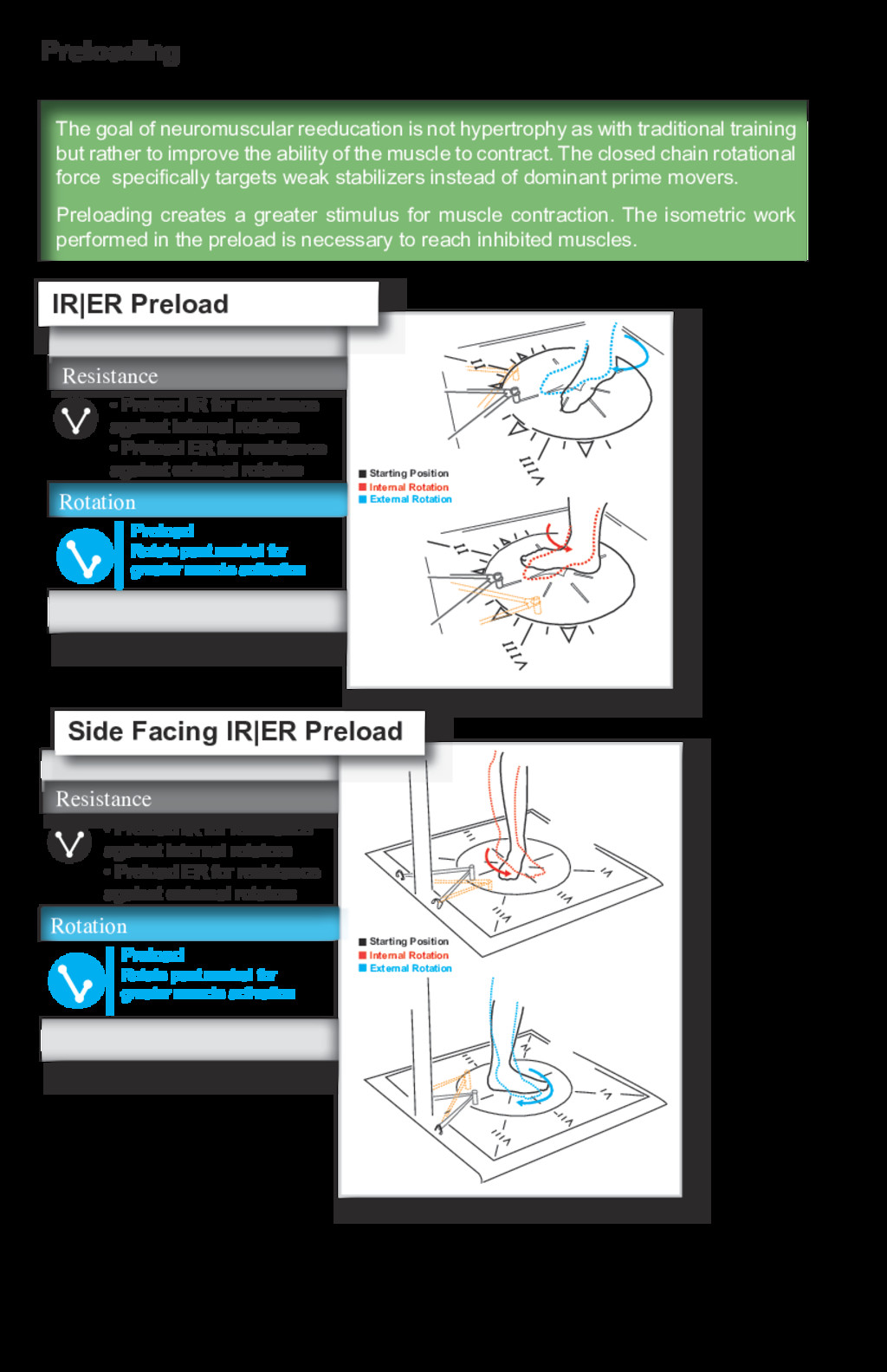 with traditional training but rather to improve the ability of the muscle to contract. The closed chain rotational IRUFHVSHFL¿FDOO\WDUJHWVZHDNVWDELOL]HUVLQVWHDGRIGRPLQDQWSULPHPRYHUV Preloading creates a greater stimulus for muscle contraction. The isometric work performed in the preload is necessary to reach inhibited muscles. IR|ER Preload Resistance 3UHORDG,5IRUUHVLVWDQFH against internal rotators 3UHORDG(5IRUUHVLVWDQFH against external rotators Resistance 3UHORDG,5IRUUHVLVWDQFH against internal rotators 3UHORDG(5IRUUHVLVWDQFH against external rotators Starting Position Internal Rotation External Rotation Side Facing IR|ER Preload Rotation Preload 5RWDWHSDVWQHXWUDOIRU greater muscle activation Starting Position Internal Rotation External Rotation Rotation Preload 5RWDWHSDVWQHXWUDOIRU greater muscle activation
