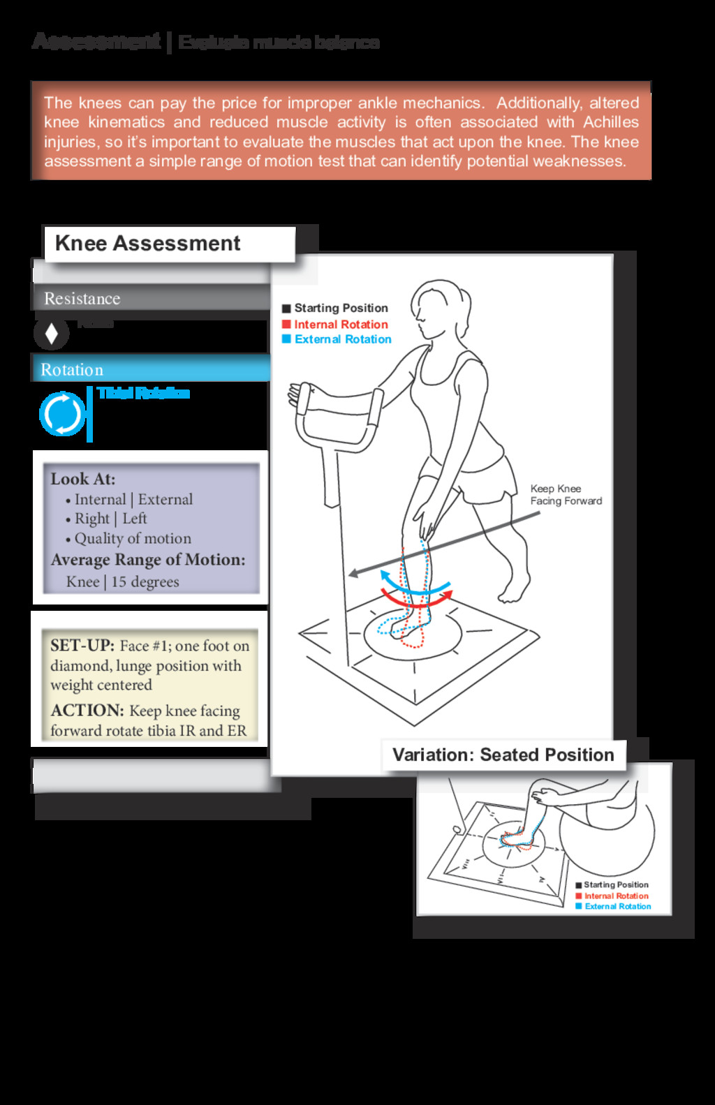 Motion: ,OFF]EFHSFFT The knees can pay the price for improper ankle mechanics. Additionally, altered knee kinematics and reduced muscle activity is often associated with Achilles injuries, so it’s important to evaluate the muscles that act upon the knee. The knee assessment a simple range of motion test that can identify potential weaknesses. SET-UP: Face #1; one foot on diamond, lunge position with weight centered ACTION: Keep knee facing GPSXBSESPUBUFUJCJB*3BOE&3 Assessment | (YDOXDWHPXVFOHEDODQFH 7LELDO5RWDWLRQ Rotation Keep Knee Facing Forward Starting Position Internal Rotation External Rotation Knee Assessment Starting Position Internal Rotation External Rotation Variation: Seated Position