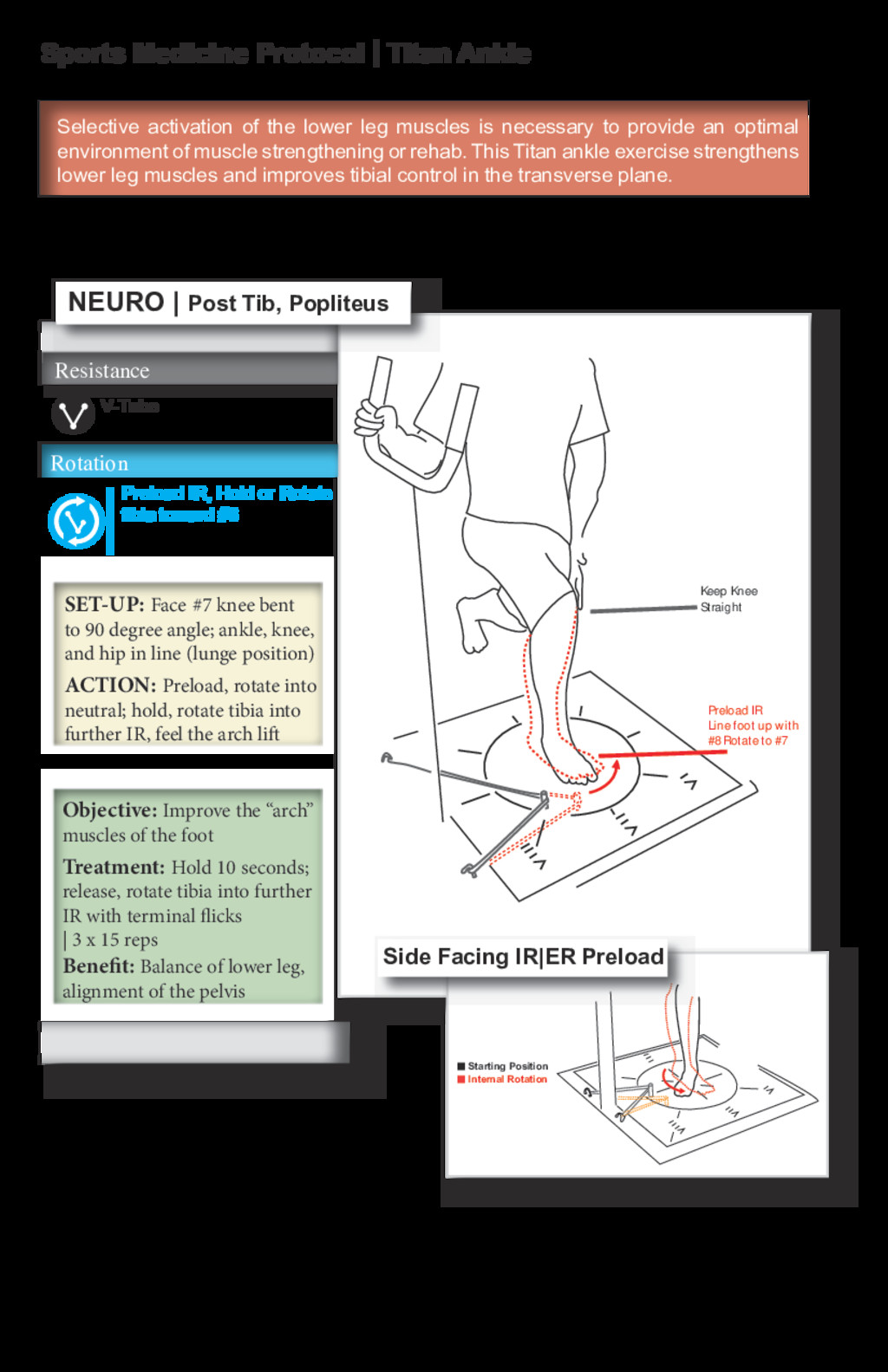 #7 knee bent to 90 degree angle; ankle, knee, BOEIJQJOMJOF MVOHFQPTJUJPO ACTION: Preload, rotate into neutral; hold, rotate tibia into further IR, feel the arch li Objective: *NQSPWFUIFiBSDIw muscles of the foot Treatment: Hold 10 seconds; release, rotate tibia into further *3XJUIUFSNJOBMĘJDLT ]YSFQT Bene t: Balance of lower leg, BMJHONFOUPGUIFQFMWJT NEURO | Post Tib, Popliteus 3UHORDG,5+ROGRU5RWDWH tibia toward #6 V-Tube Selective activation of the lower leg muscles is necessary to provide an optimal environment of muscle strengthening or rehab. This Titan ankle exercise strengthens lower leg muscles and improves tibial control in the transverse plane. Keep Knee Straight Preload IR Line foot up with #8 Rotate to #7 Starting Position Internal Rotation Side Facing IR|ER Preload