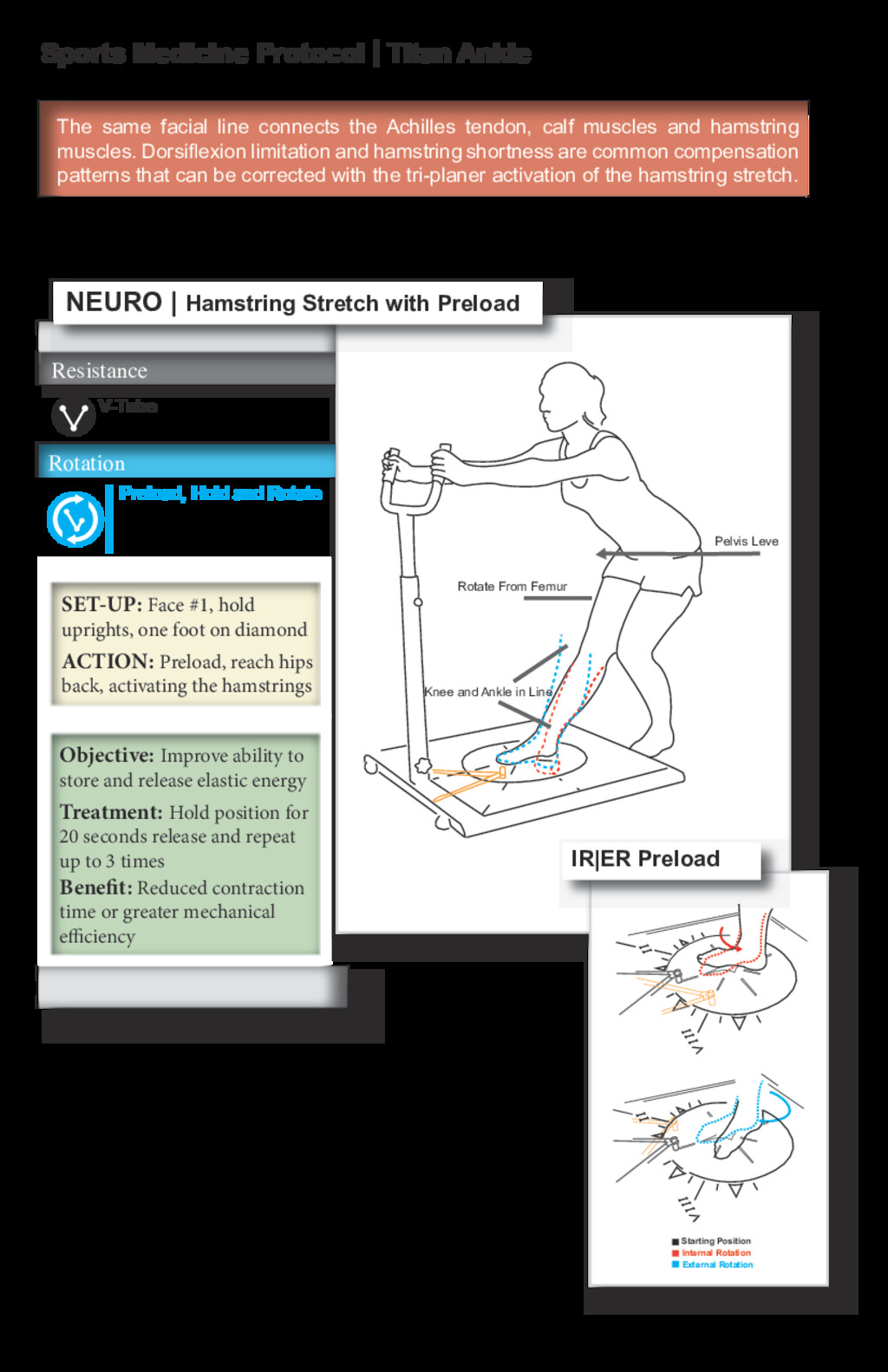#1, hold uprights, one foot on diamond ACTION: Preload, reach hips CBDL BDUJWBUJOHUIFIBNTUSJOHT Objective: *NQSPWFBCJMJUZUP store and release elastic energy Treatment: Hold position for 20 seconds release and repeat up to 3 times Bene t: Reduced contraction time or greater mechanical e ciency NEURO | +DPVWULQJ6WUHWFKZLWK3UHORDG 3UHORDG+ROGDQG5RWDWH V-Tube The same facial line connects the Achilles tendon, calf muscles and hamstring PXVFOHV'RUVLÀH[LRQOLPLWDWLRQDQGKDPVWULQJVKRUWQHVVDUHFRPPRQFRPSHQVDWLRQ patterns that can be corrected with the tri-planer activation of the hamstring stretch. Pelvis Level Rotate From Femur Knee and Ankle in Line Starting Position Internal Rotation External Rotation IR|ER Preload