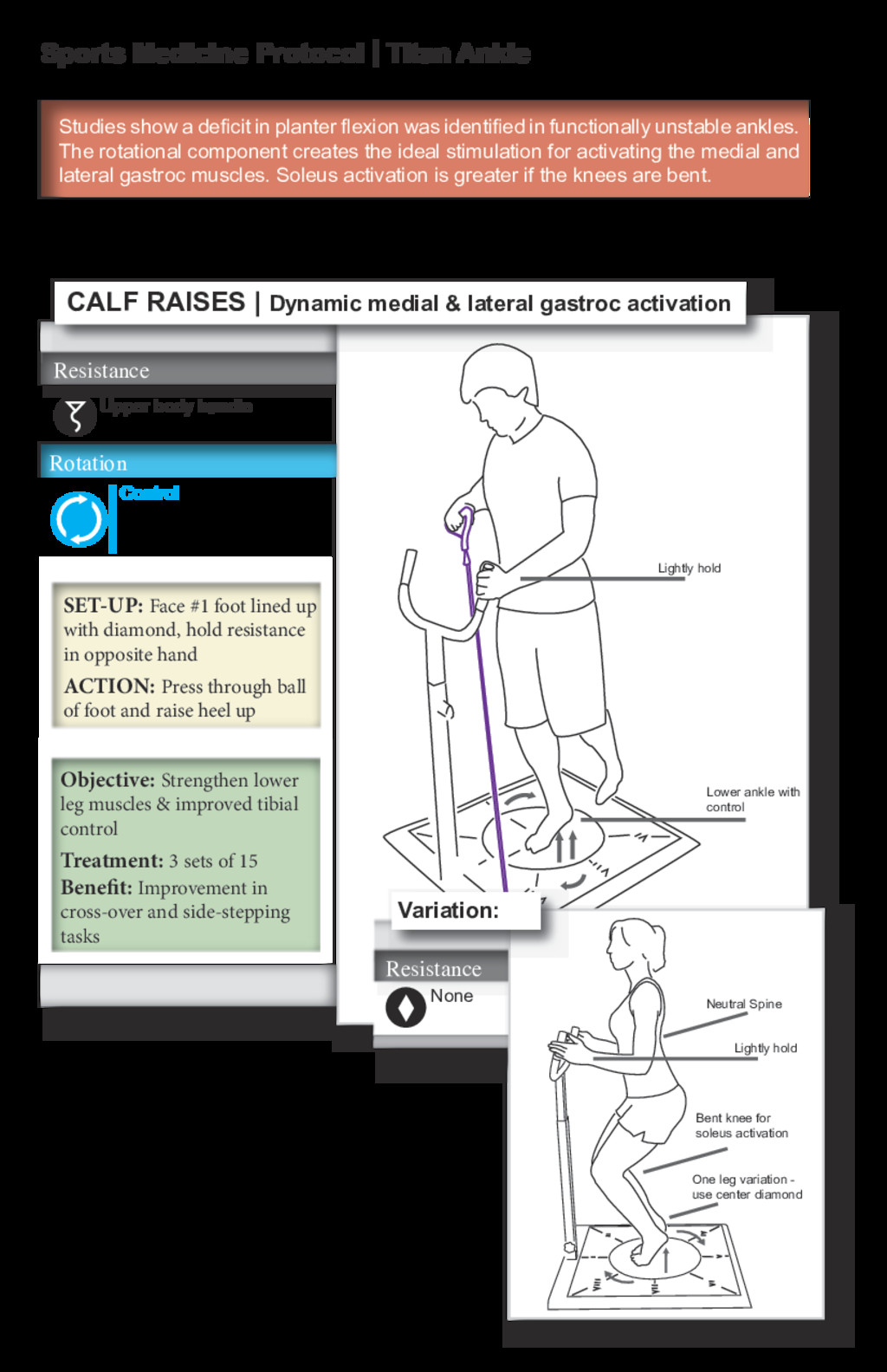 Treatment: TFUTPG Bene t: *NQSPWFNFOUJO DSPTTPWFSBOETJEFTUFQQJOH tasks Resistance Rotation SET-UP: Face #1 foot lined up with diamond, hold resistance in opposite hand ACTION: Press through ball of foot and raise heel up CALF RAISES | Dynamic medial & lateral gastroc activation Control Upper body handle 6WXGLHVVKRZDGH¿FLWLQSODQWHUÀH[LRQZDVLGHQWL¿HGLQIXQFWLRQDOO\XQVWDEOHDQNOHV The rotational component creates the ideal stimulation for activating the medial and lateral gastroc muscles. Soleus activation is greater if the knees are bent. Lightly hold Lower ankle with control Resistance None Bent knee for soleus activation Lightly hold Neutral Spine One leg variation - use center diamond Variation: