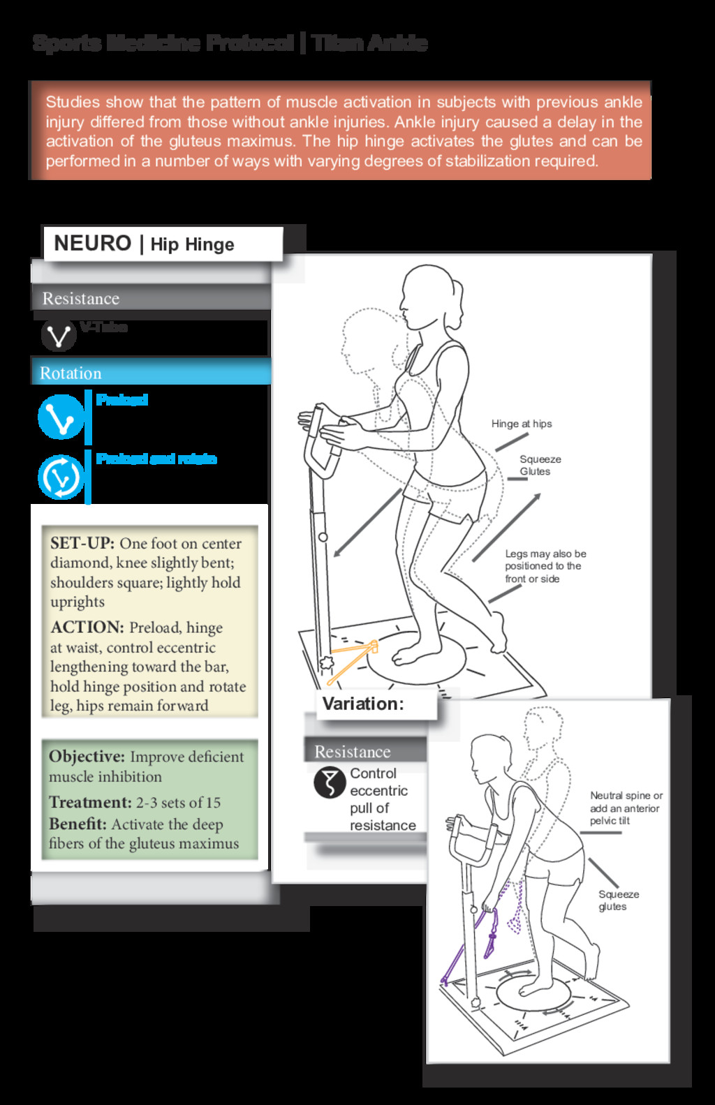 Hip Hinge Preload and rotate Preload V-Tube Studies show that the pattern of muscle activation in subjects with previous ankle injury differed from those without ankle injuries. Ankle injury caused a delay in the activation of the gluteus maximus. The hip hinge activates the glutes and can be SHUIRUPHGLQDQXPEHURIZD\VZLWKYDU\LQJGHJUHHVRIVWDELOL]DWLRQUHTXLUHG SET-UP: 0OFGPPUPODFOUFS diamond, knee slightly bent; shoulders square; lightly hold uprights ACTION: Preload, hinge at waist, control eccentric lengthening toward the bar, hold hinge position and rotate leg, hips remain forward Objective: *NQSPWFEFĕDJFOU muscle inhibition Treatment: TFUTPG Bene t: "DUJWBUFUIFEFFQ ĕCFSTPGUIFHMVUFVTNBYJNVT Hinge at hips Legs may also be positioned to the front or side Squeeze Glutes Resistance Control eccentric pull of resistance Variation: Neutral spine or add an anterior pelvic tilt Squeeze glutes