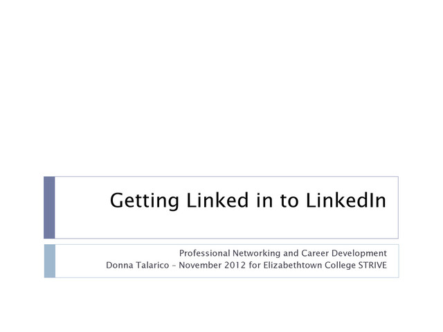 A presentation I did for the STRIVE program at Elizabethtown College, part of a series of events for seniors. This presentation included best practices on using LinkedIn during and after college.
