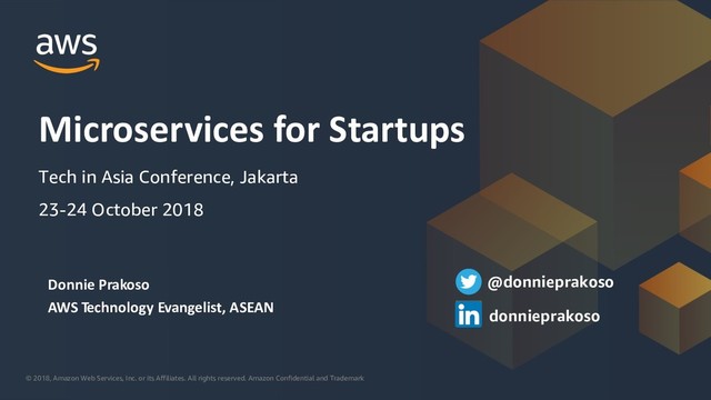 rights reserved. Amazon Confidential and Trademark © 2018, Amazon Web Services, Inc. or its Affiliates. All rights reserved. Amazon Confidential and Trademark Donnie Prakoso AWS Technology Evangelist, ASEAN Microservices for Startups @donnieprakoso donnieprakoso Tech in Asia Conference, Jakarta 23-24 October 2018
