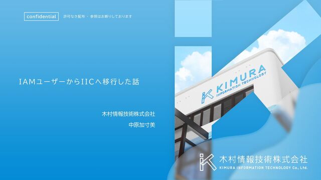 confidential 許可なき配布 ・ 参照はお断りしております IAM ユーザーから IIC へ移行した話 木村情報技術株式会社 中原加寸美