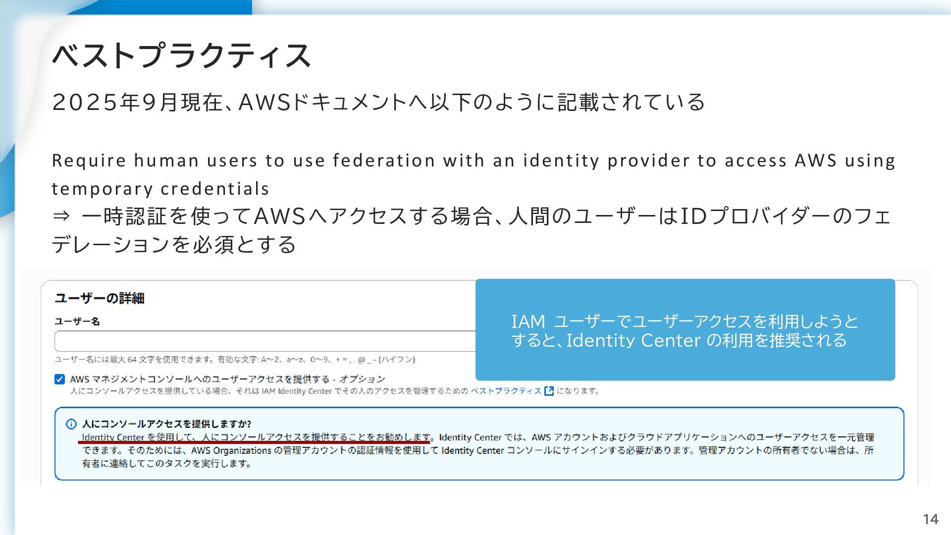 identity provider to access AWS using temporary credentials ⇒ 一時認証を使ってAWSへアクセスする場合、人間のユーザーはIDプロバイダーのフェ デレーションを必須とする 14 IAM ユーザーでユーザーアクセスを利用しようと すると、Identity Center の利用を推奨される