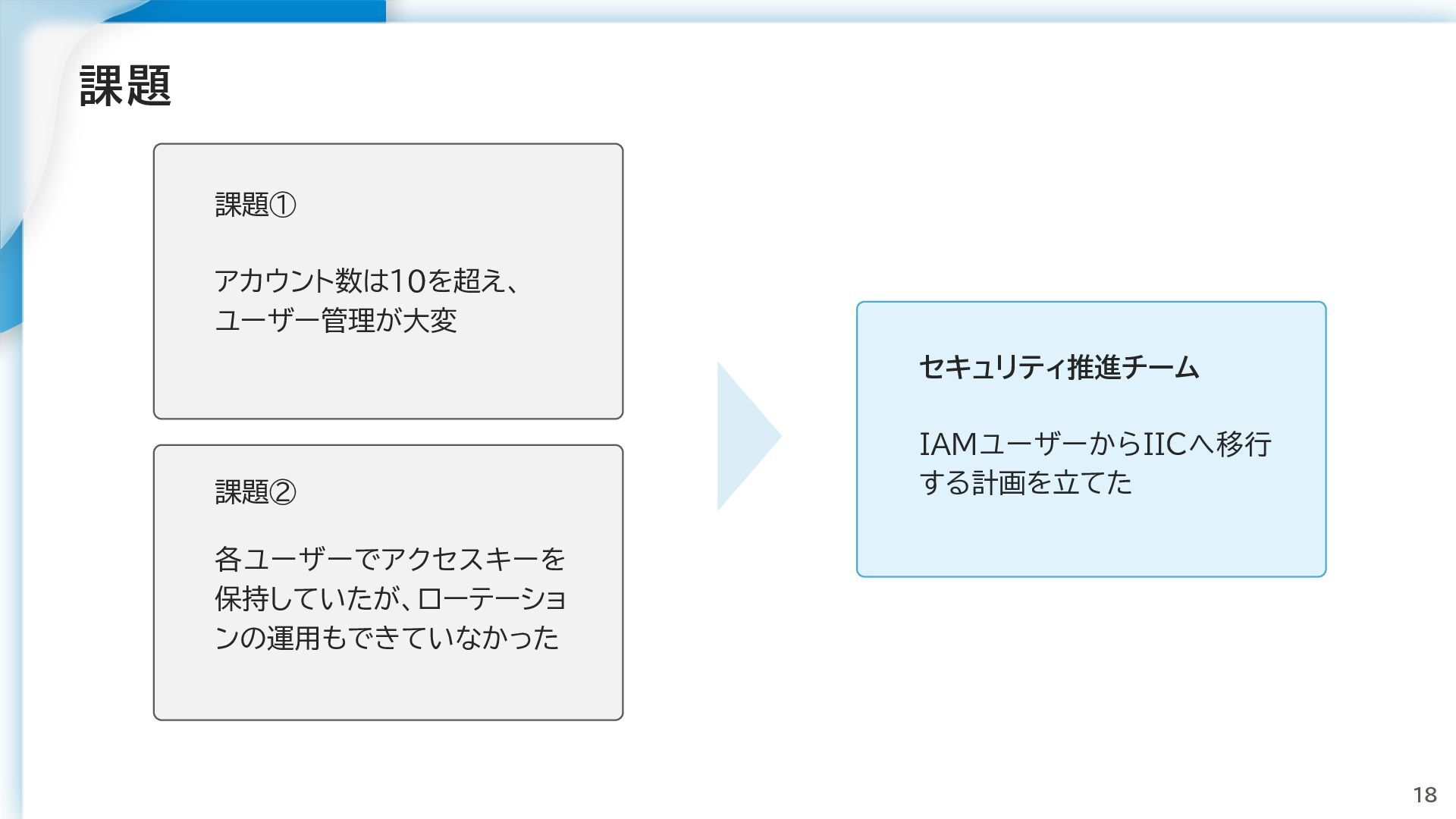 課題 18 課題① アカウント数は10を超え、 ユーザー管理が大変 課題② 各ユーザーでアクセスキーを 保持していたが、ローテーショ ンの運用もできていなかった セキュリティ推進チーム