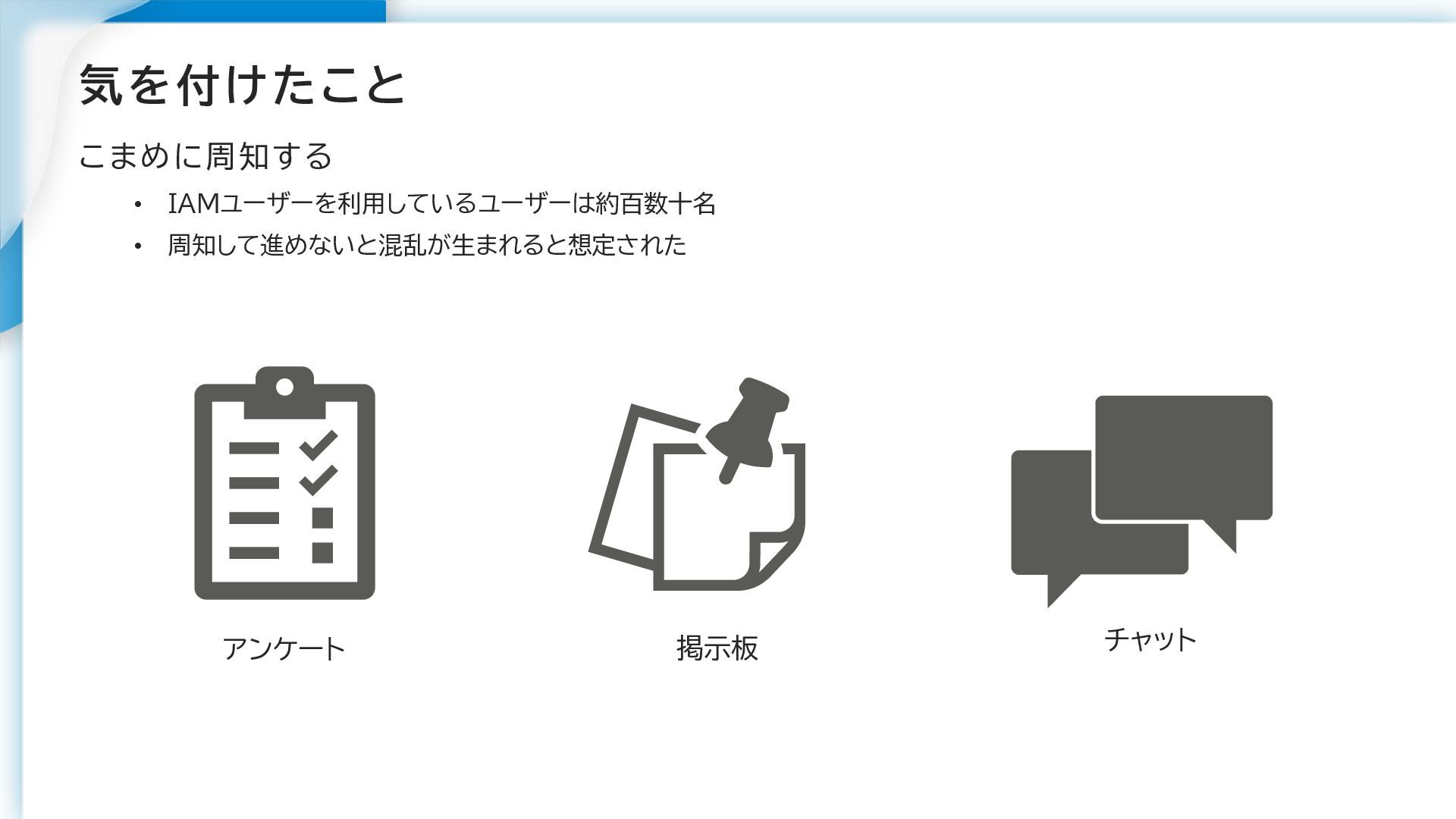 気を付けたこと こまめに周知する • IAMユーザーを利用しているユーザーは約百数十名 • 周知して進めないと混乱が生まれると想定された アンケート 掲示板 チャット
