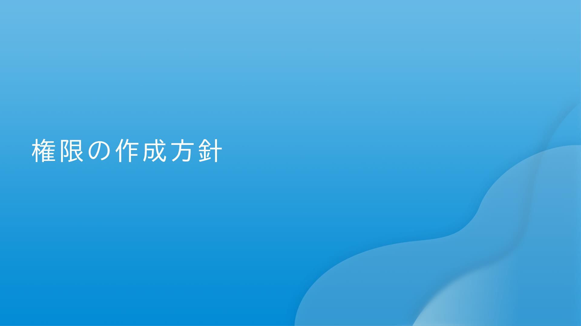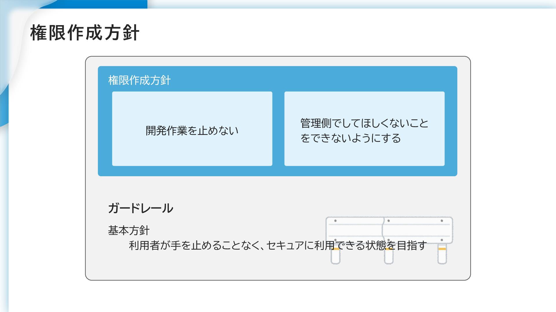 権限作成方針 開発作業を止めない 管理側でしてほしくないこと をできないようにする ガードレール 基本方針 利用者が手を止めることなく、セキュアに利用できる状態を目指す 権限作成方針