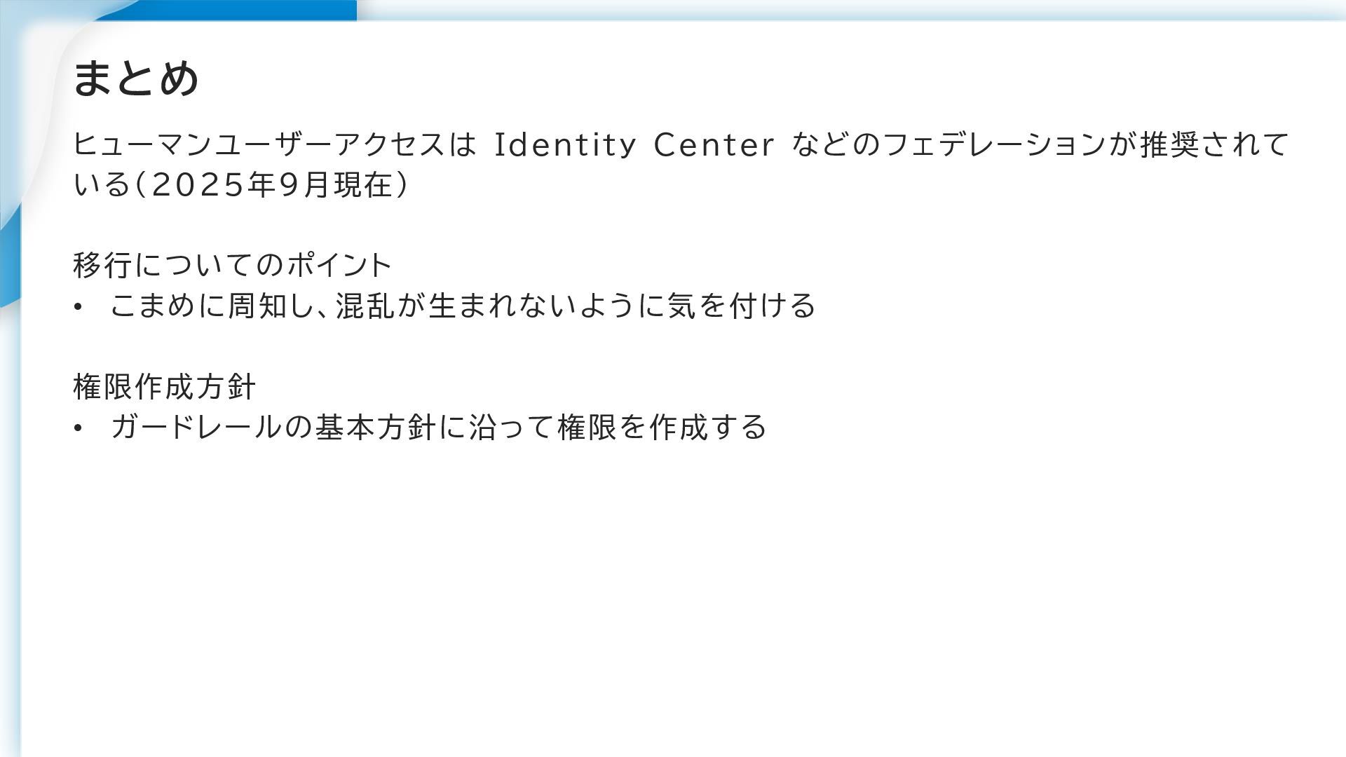 まとめ ヒューマンユーザーアクセスは Identity Center などのフェデレーションが推奨されて いる(2025年9月現在) 移行についてのポイント • こまめに周知し、混乱が生まれないように気を付ける 権限作成方針