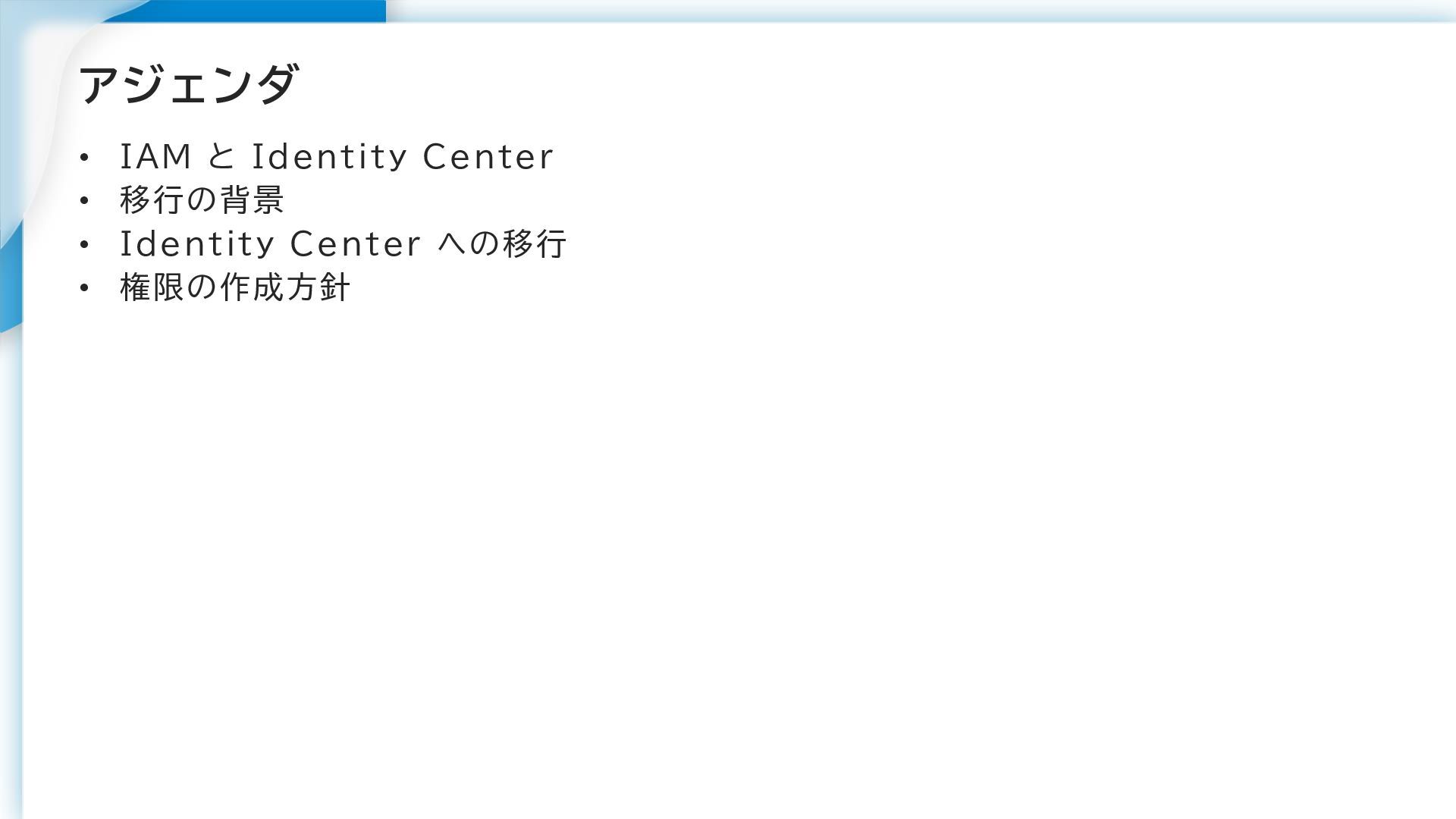 アジェンダ • IAM と Identity Center • 移行の背景 • Identity