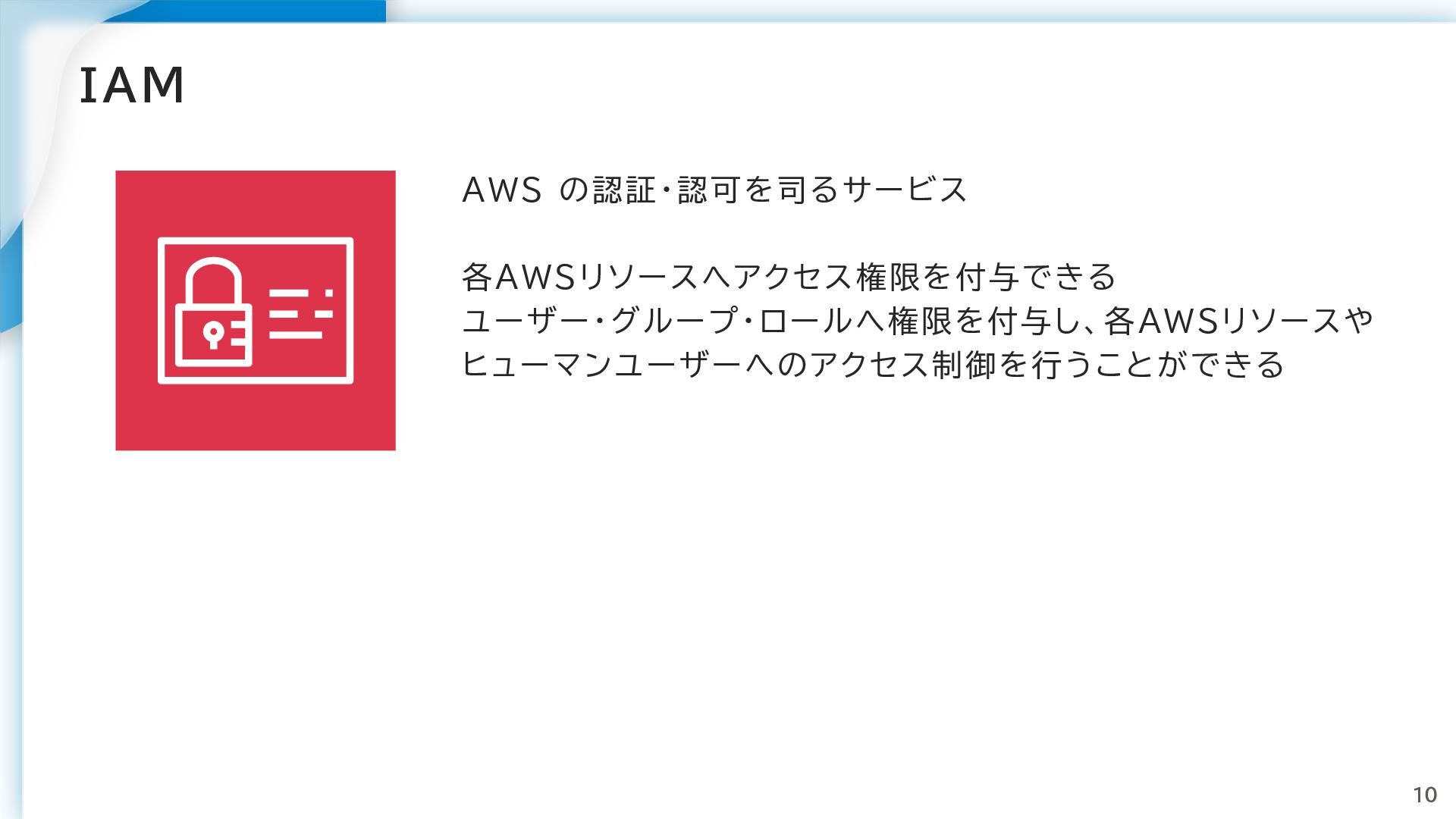 IAM AWS の認証・認可を司るサービス 各AWSリソースへアクセス権限を付与できる ユーザー・グループ・ロールへ権限を付与し、各AWSリソースや ヒューマンユーザーへのアクセス制御を行うことができる 10
