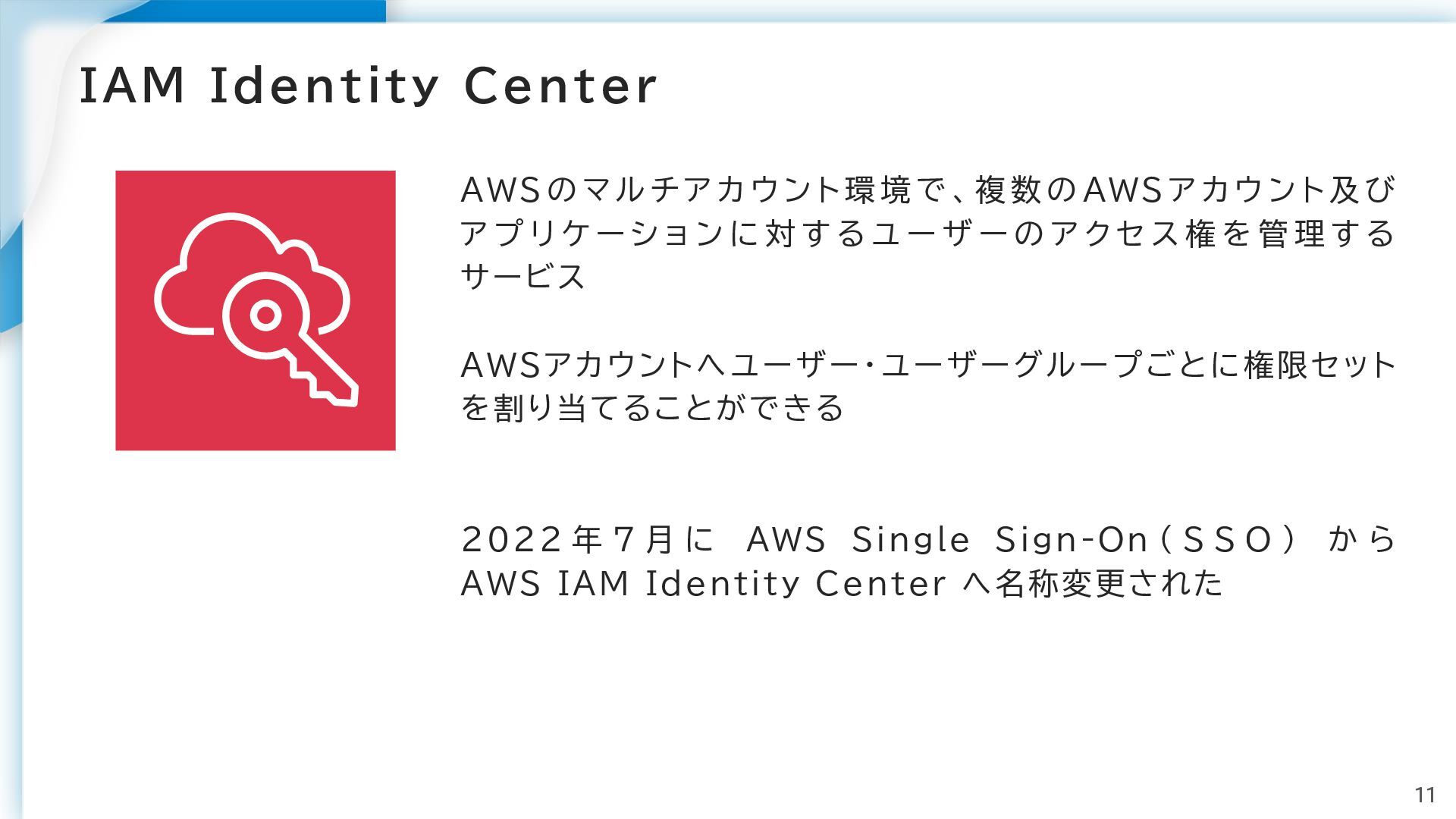 ウ ン ト 環 境 で 、 複 数 の AWS ア カ ウ ン ト 及 び ア プ リ ケ ー シ ョ ン に 対 す る ユ ー ザ ー の ア ク セ ス 権 を 管 理 す る サービス AWSアカウントへユーザー・ユーザーグループごとに権限セット を割り当てることができる 2022 年 7 月 に AWS Single Sign-On ( S S O ) か ら AWS IAM Identity Center へ名称変更された 11