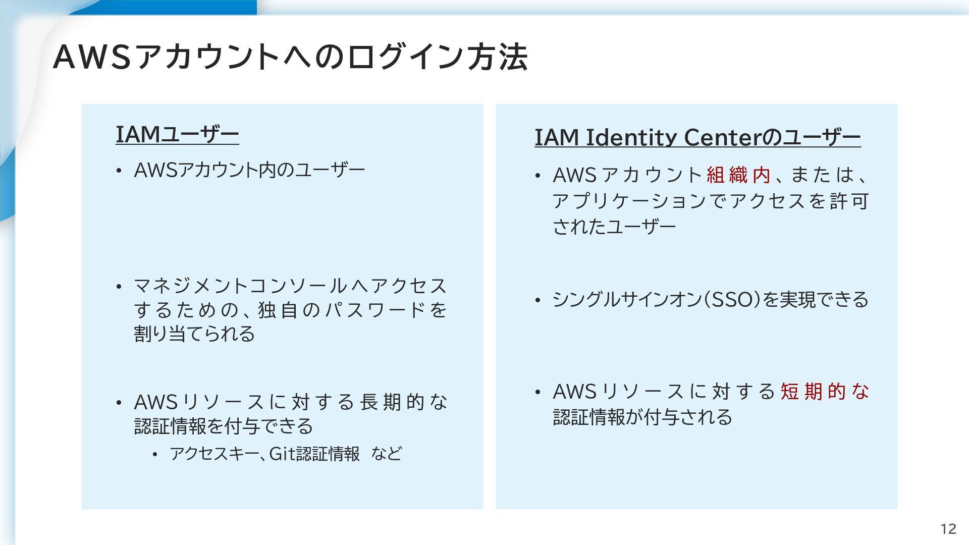 ン ト コ ン ソ ー ル へ ア ク セ ス す る た め の 、 独 自 の パ ス ワ ー ド を 割り当てられる • AWS リ ソ ー ス に 対 す る 長 期 的 な 認証情報を付与できる • アクセスキー、Git認証情報 など IAM Identity Centerのユーザー • AWS ア カ ウ ン ト 組 織 内 、 ま た は 、 ア プ リ ケ ー シ ョ ン で ア ク セ ス を 許 可 されたユーザー • シングルサインオン(SSO)を実現できる • AWS リ ソ ー ス に 対 す る 短 期 的 な 認証情報が付与される