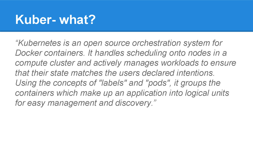 It handles scheduling onto nodes in a compute cluster and actively manages workloads to ensure that their state matches the users declared intentions. Using the concepts of "labels" and "pods", it groups the containers which make up an application into logical units for easy management and discovery.” Kuber- what?