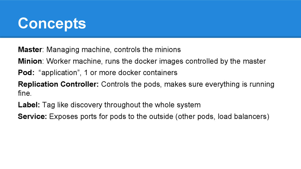 runs the docker images controlled by the master Pod: “application”, 1 or more docker containers Replication Controller: Controls the pods, makes sure everything is running fine. Label: Tag like discovery throughout the whole system Service: Exposes ports for pods to the outside (other pods, load balancers)